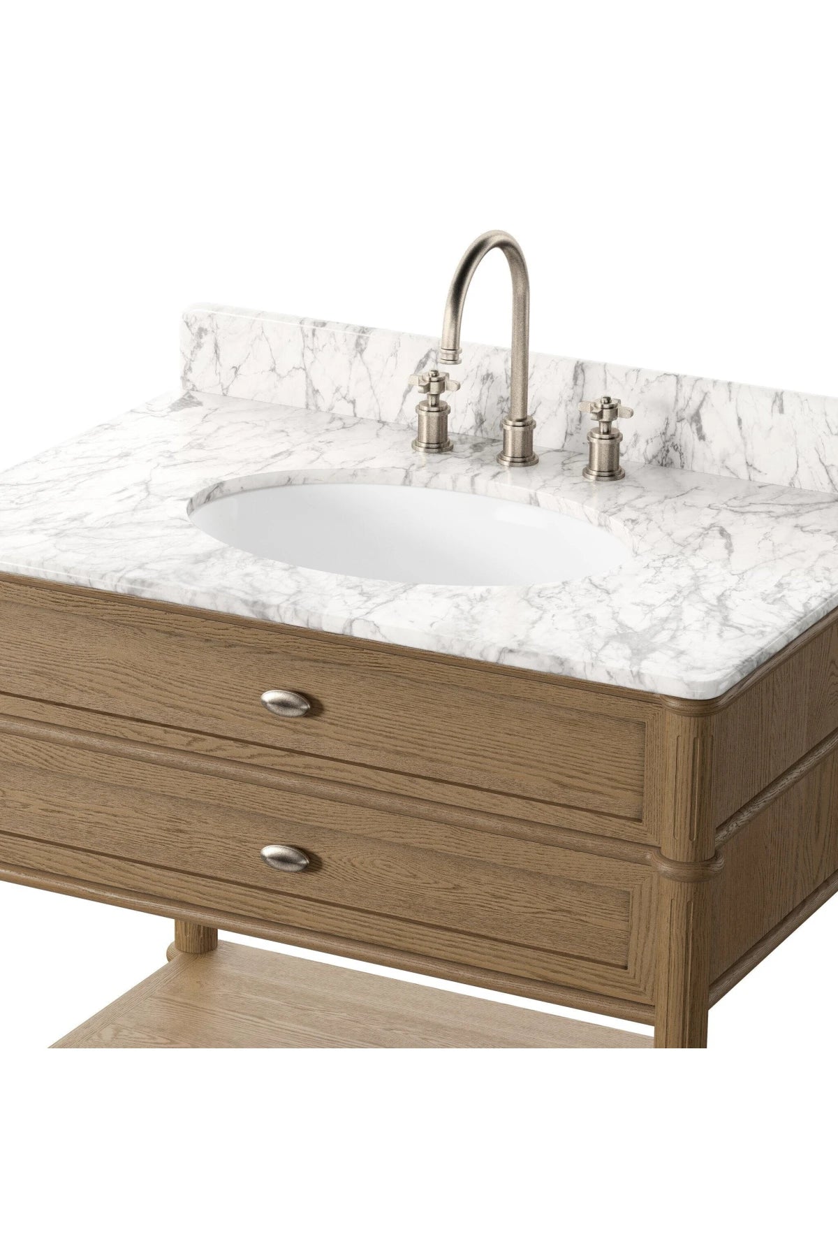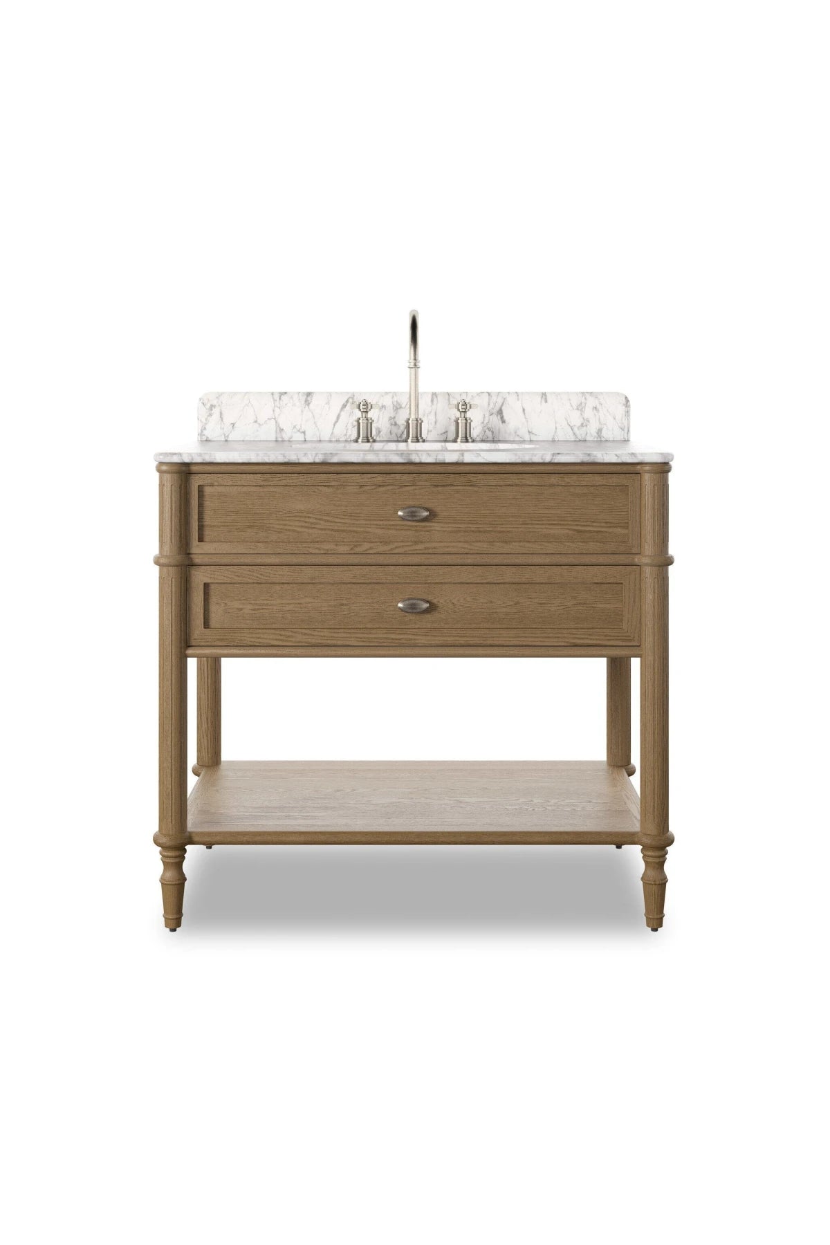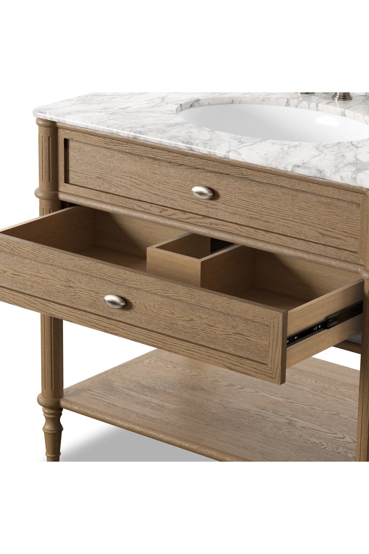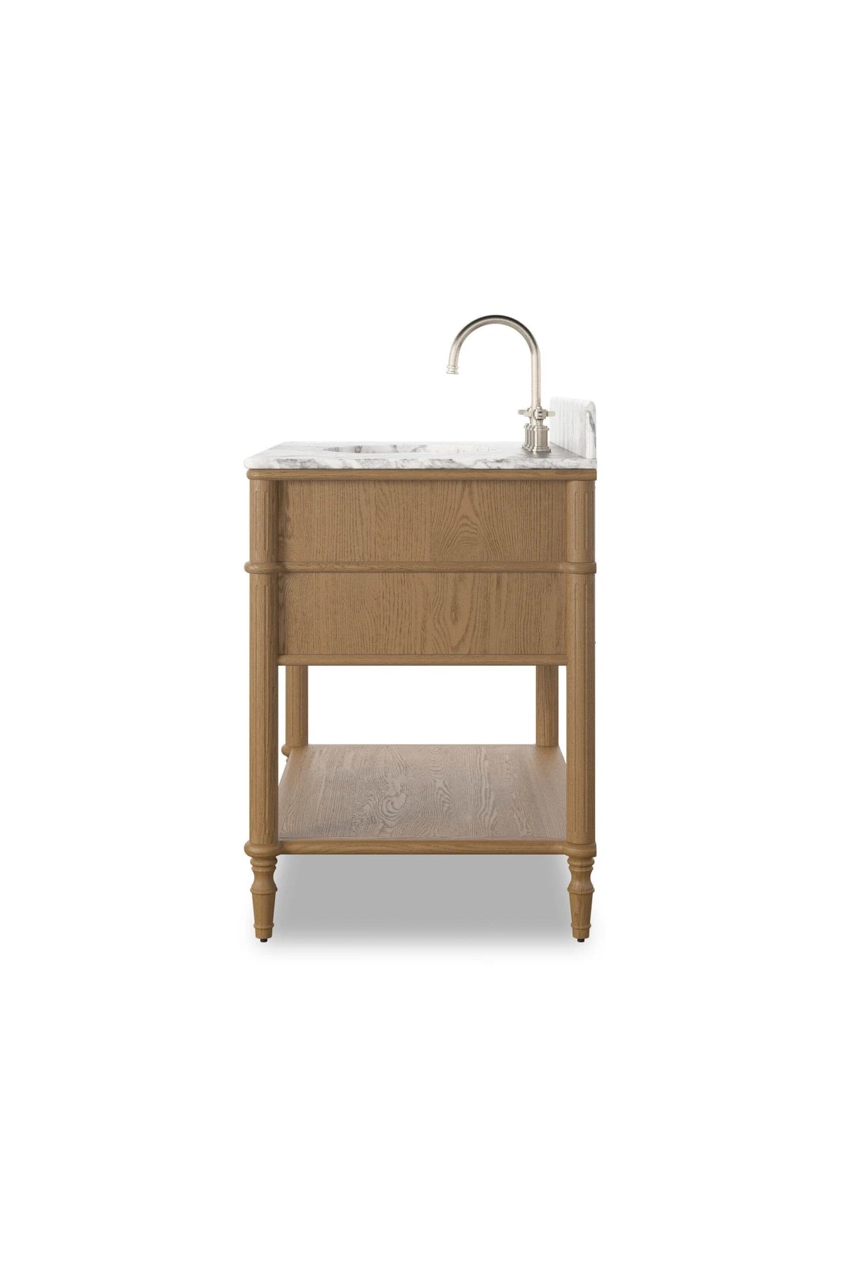 Meet the Toulouse Single Vanity. Influenced by vintage European lines, this inspired bath vanity brings a sense of calm and serenity to the bath space. Crafted from solid oak and veneer with rounded corners and tapered spindle legs in a natural washed blonde finish, aged satin brass hardware and a Carrara marble top. Includes top faux drawer, bottom drawer with U-shape cutout to accommodate plumbing fixtures and a deep open shelf below. Finished with a bath-safe sealant for moisture resistance. Designed to accommodate 8"-widespread faucets and standard-size hardware for easy customization; faucet shown not included. Sink and backsplash included; backsplash ships separately. Removable back with cutouts for plumbing; fits standard P-trap. Professional installation required.