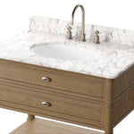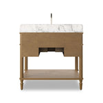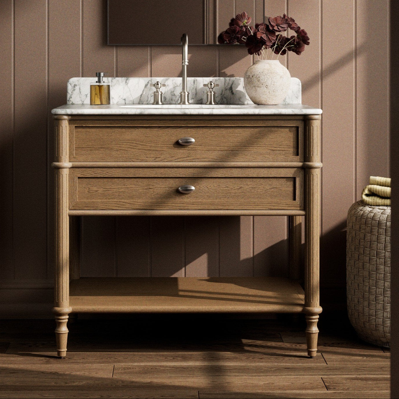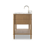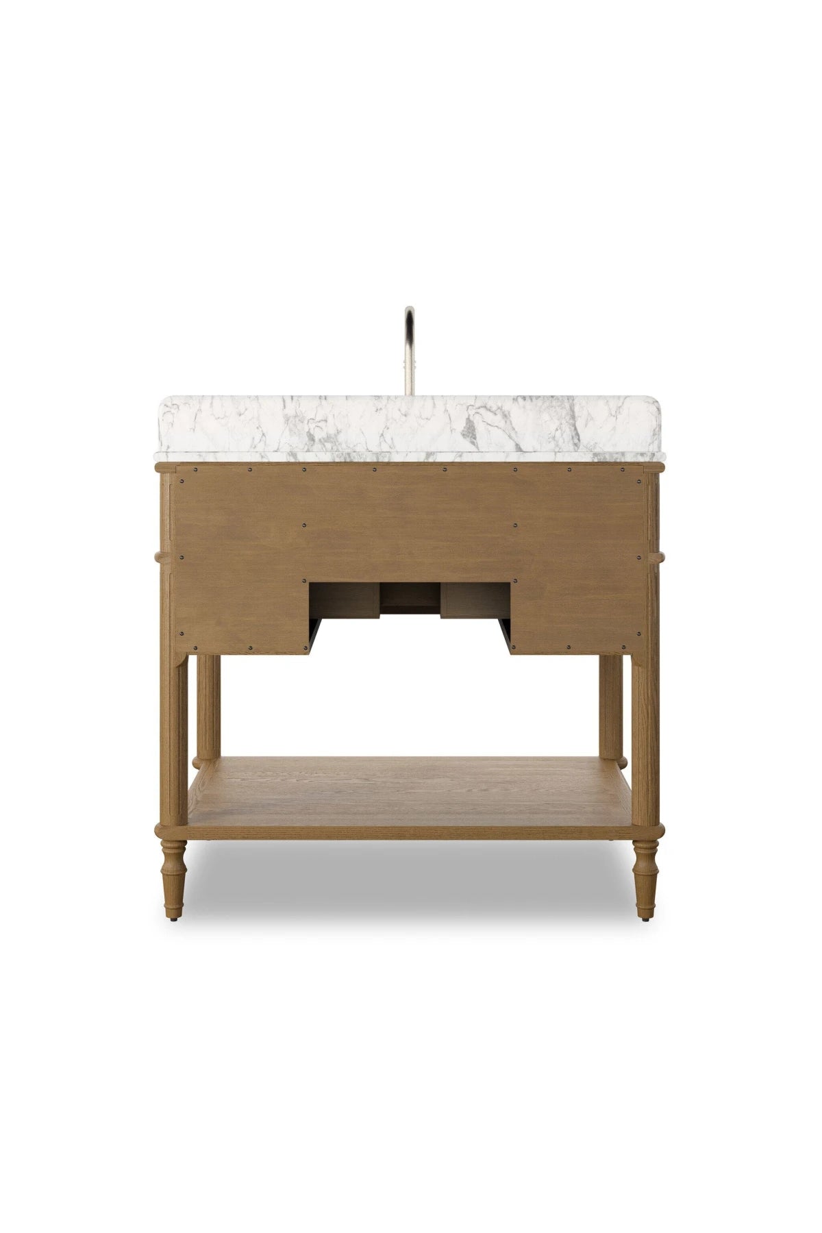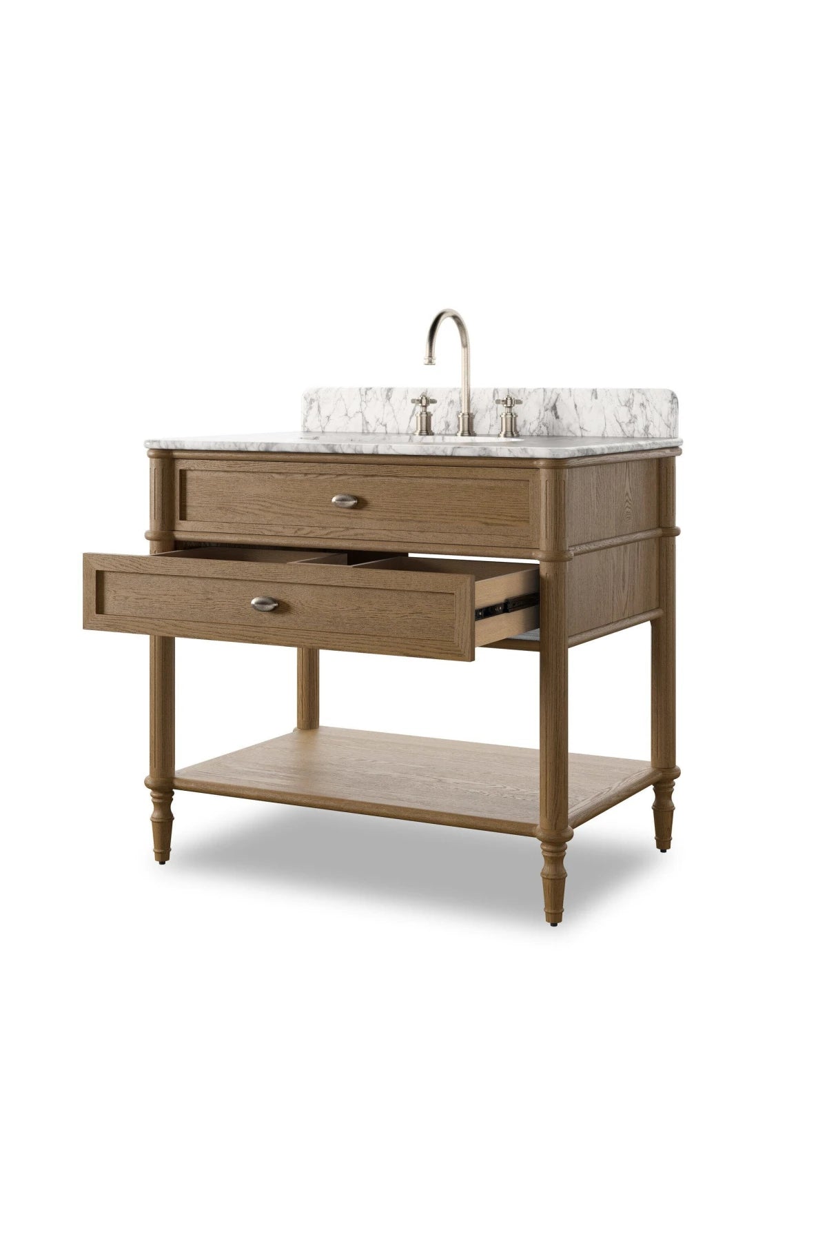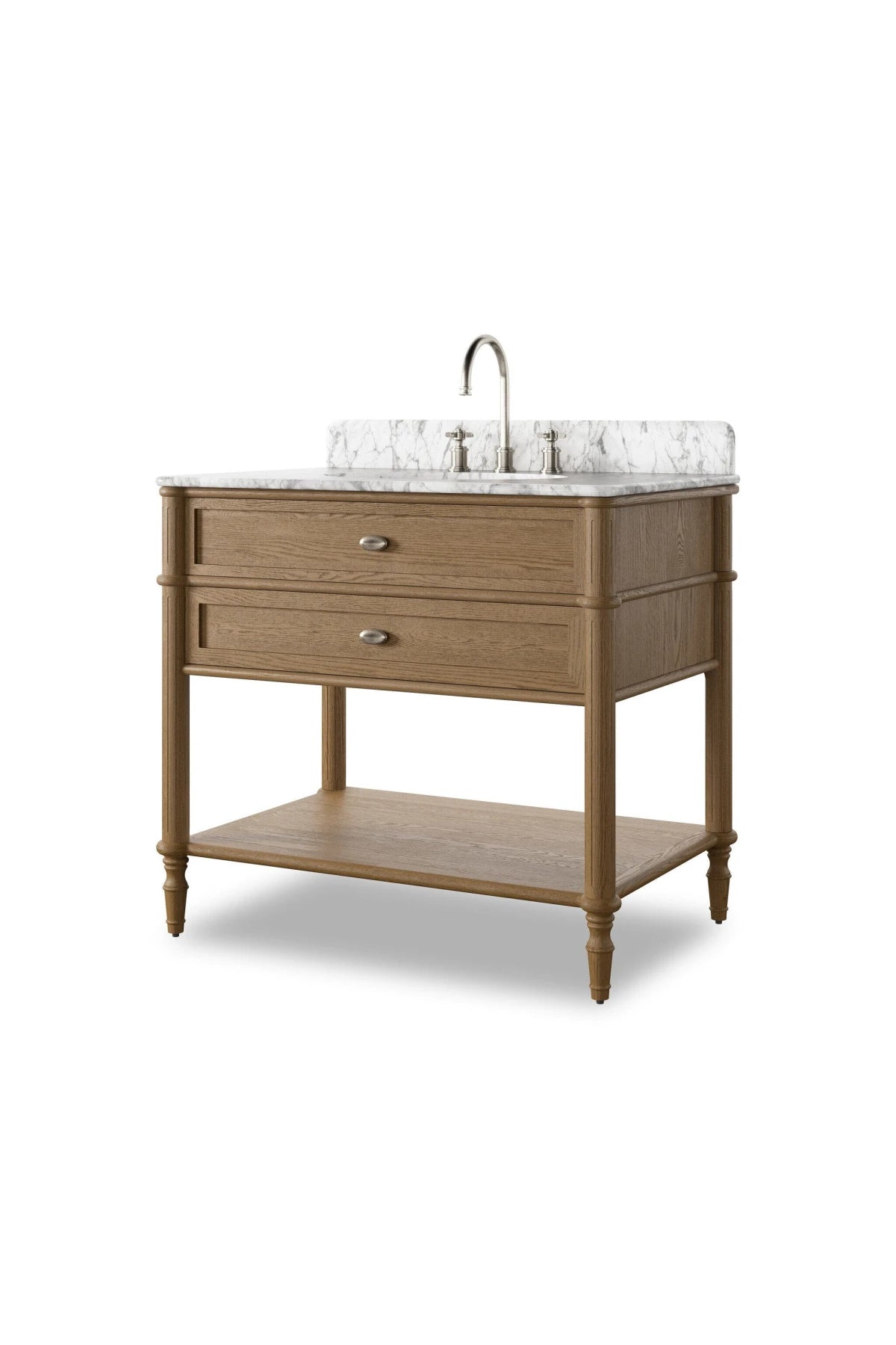 Meet the Toulouse Single Vanity. Influenced by vintage European lines, this inspired bath vanity brings a sense of calm and serenity to the bath space. Crafted from solid oak and veneer with rounded corners and tapered spindle legs in a natural washed blonde finish, aged satin brass hardware and a Carrara marble top. Includes top faux drawer, bottom drawer with U-shape cutout to accommodate plumbing fixtures and a deep open shelf below. Finished with a bath-safe sealant for moisture resistance. Designed to accommodate 8"-widespread faucets and standard-size hardware for easy customization; faucet shown not included. Sink and backsplash included; backsplash ships separately. Removable back with cutouts for plumbing; fits standard P-trap. Professional installation required.