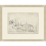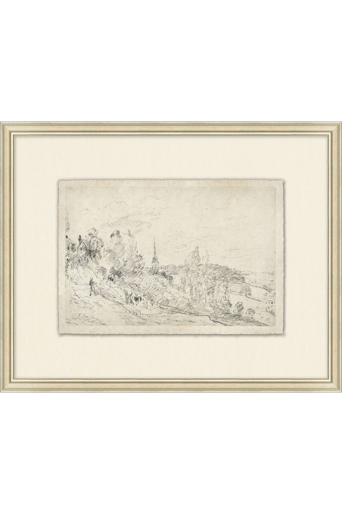Meet French Countryside. A stunning printed sketch of the French countryside with a small town seen in the background marked by a traditional church steeple. Beautiful, high quality print designed to look hand sketched, framed behind glass.