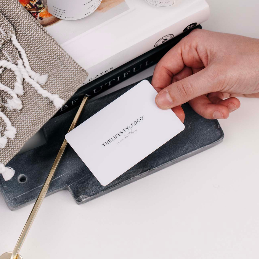 A styled gift card will include a physical gift card, greeting card, envelope and branded wax seal. It will be shipped to the recipient of your choice in a padded mailer to ensure safety in transit.