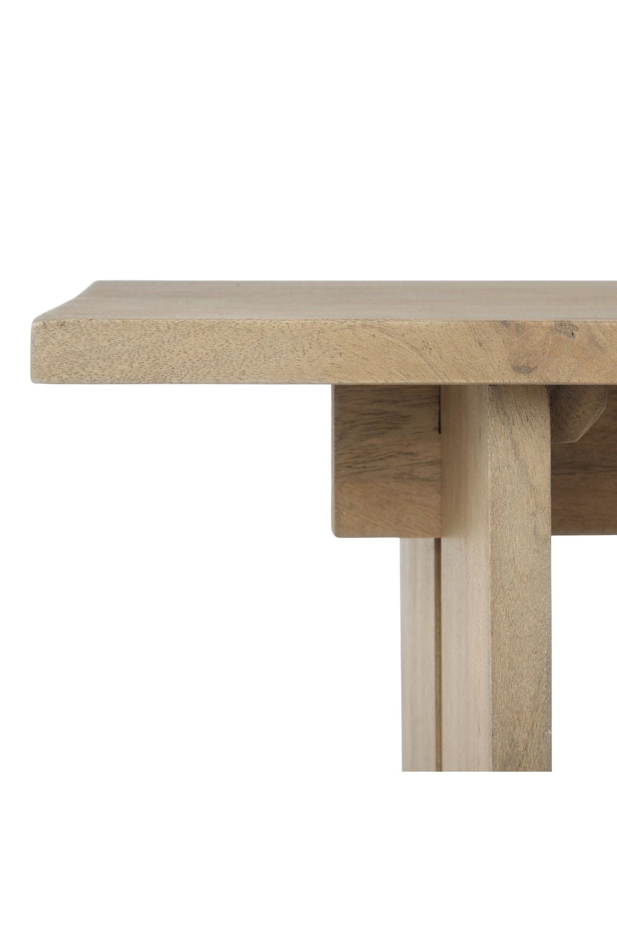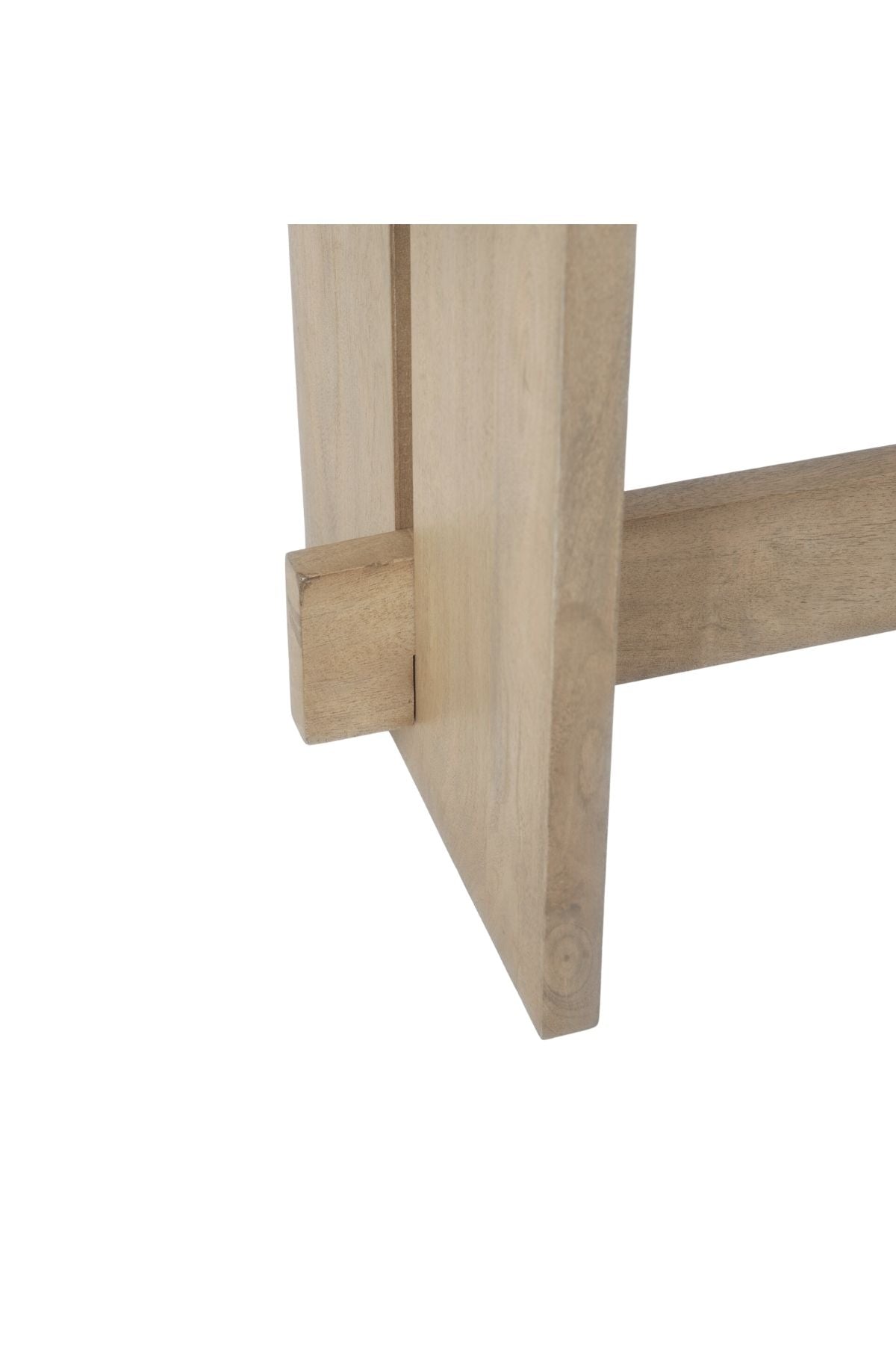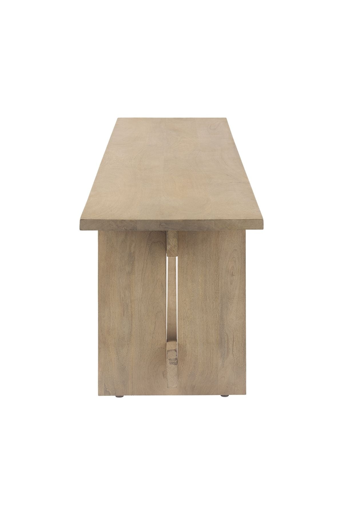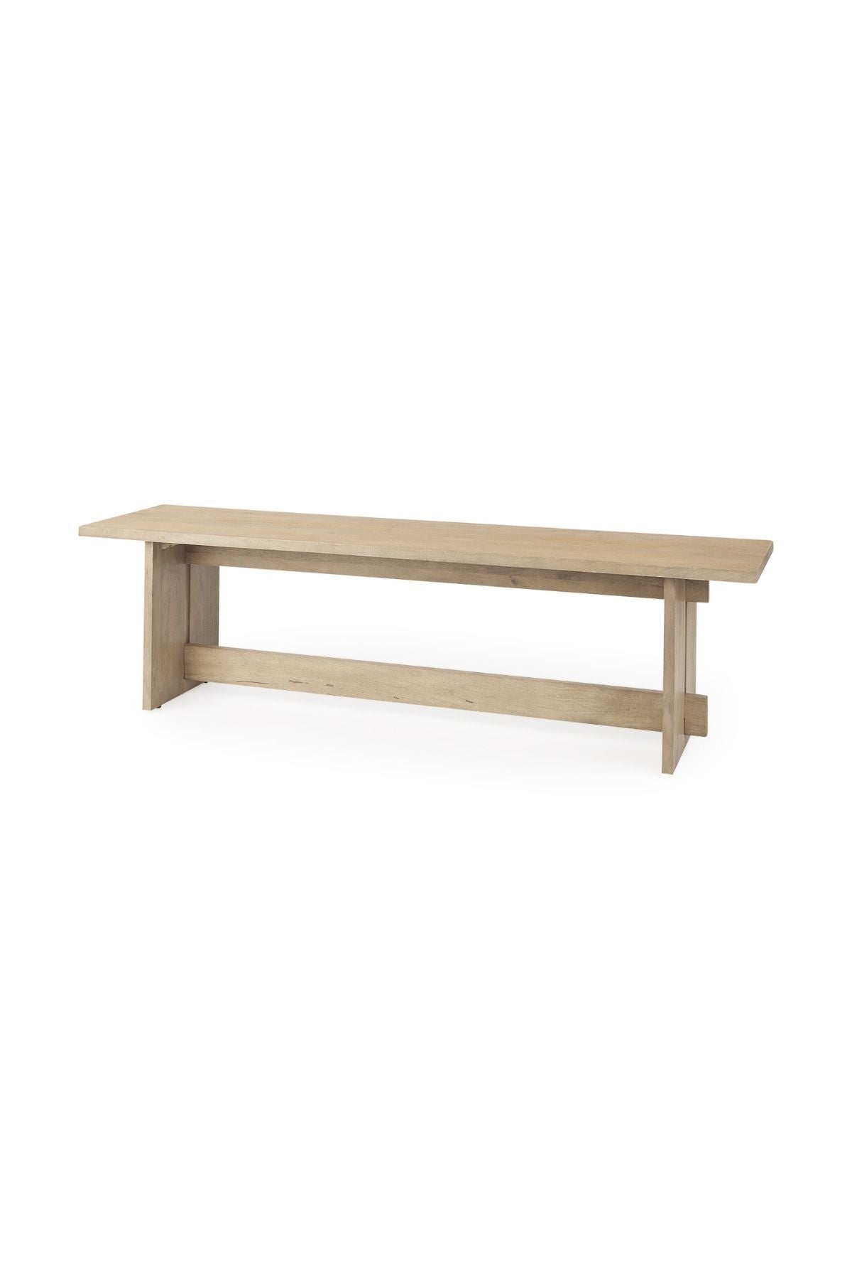 The Aida Bench is crafted of durable Indian mango wood, finished in a light brown tone and sanded smooth. The wide plank bench seat is supported by four solid wood, wide legs, with one long beam across the bottom that protrudes through each side that make this piece unique and sturdy.