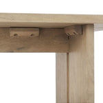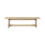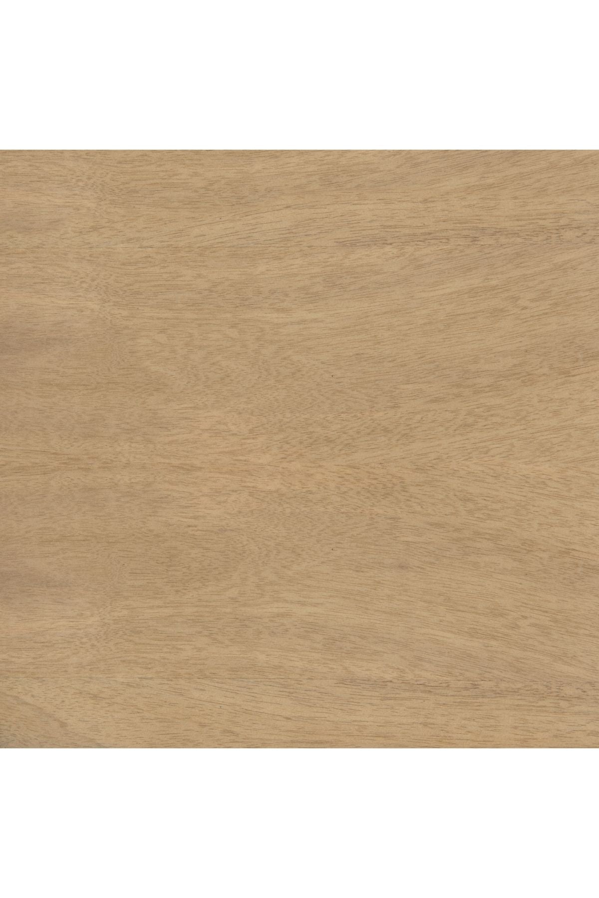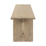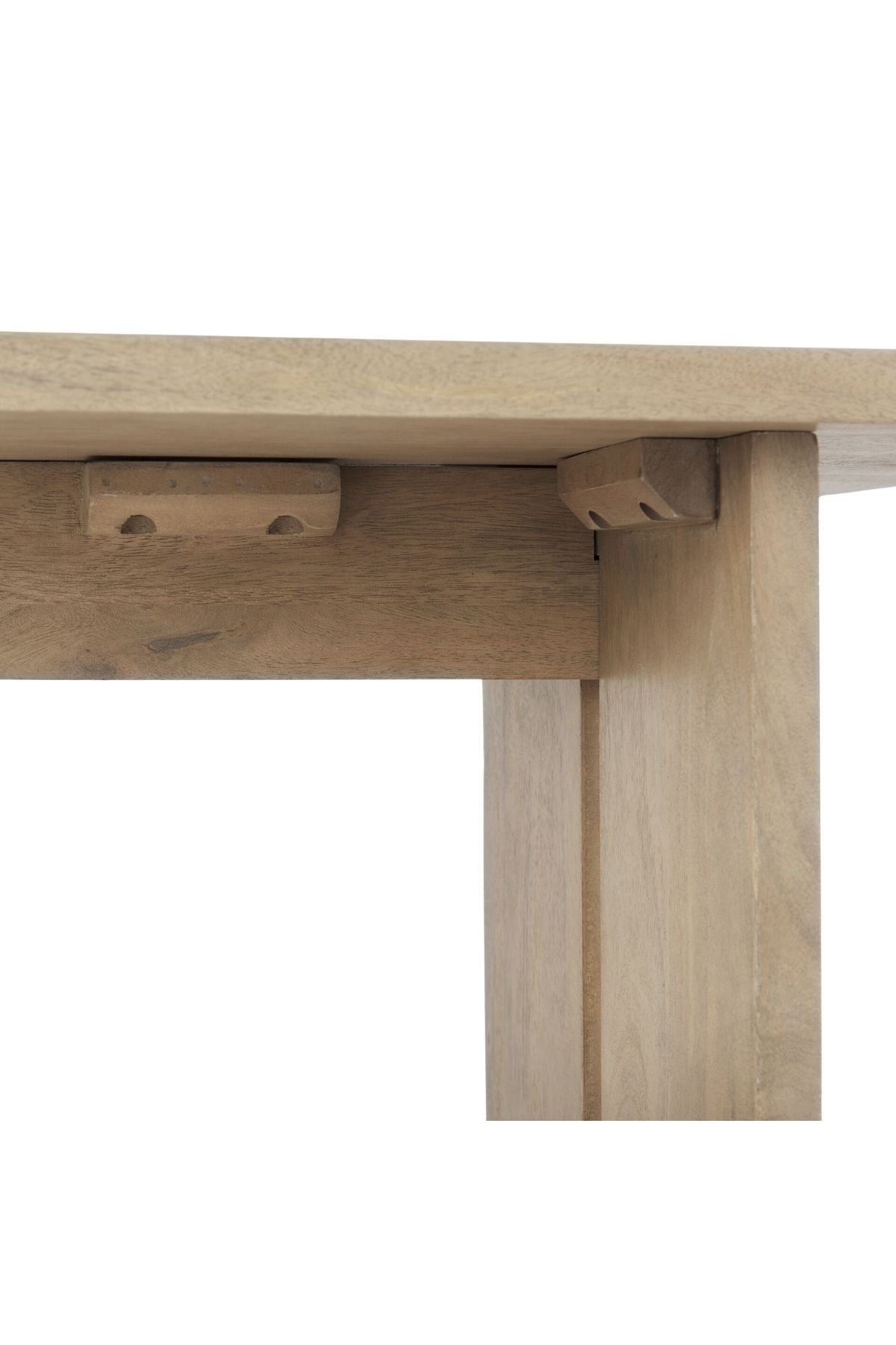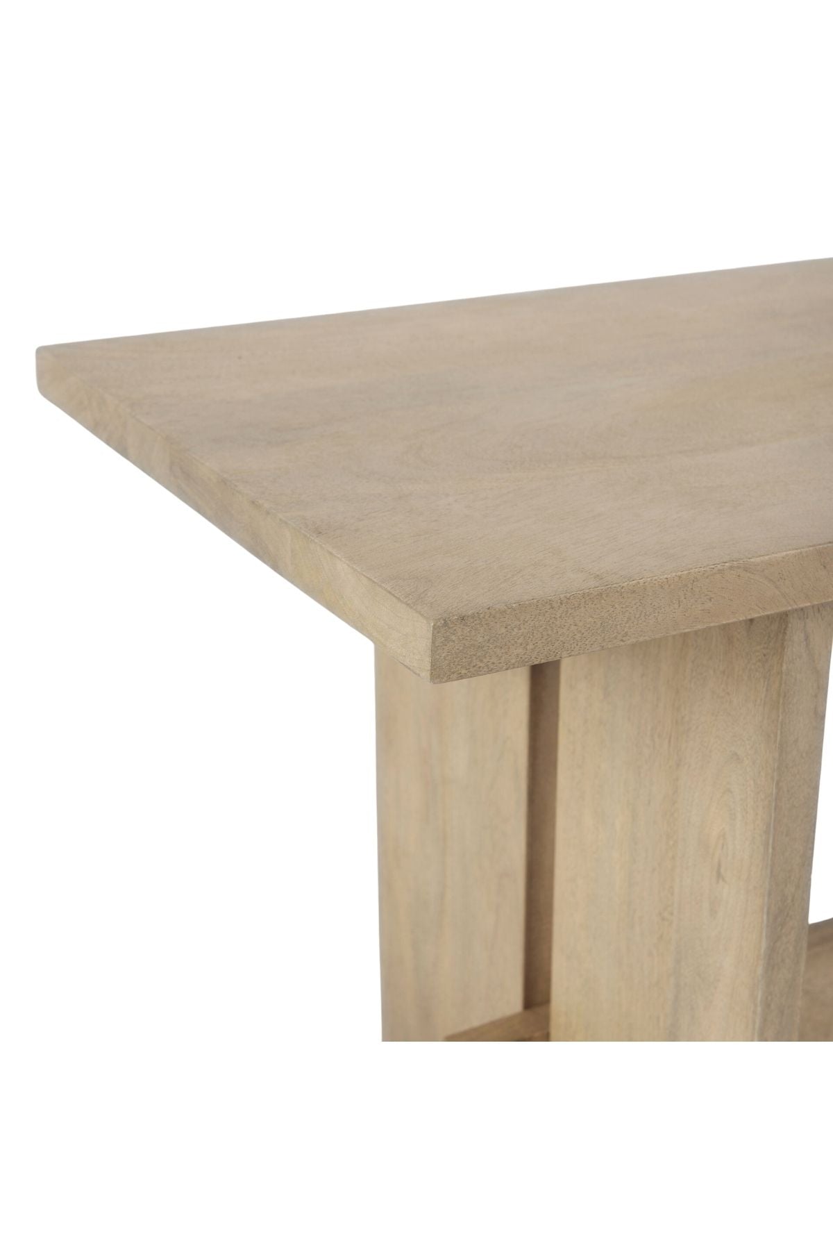 The Aida Bench is crafted of durable Indian mango wood, finished in a light brown tone and sanded smooth. The wide plank bench seat is supported by four solid wood, wide legs, with one long beam across the bottom that protrudes through each side that make this piece unique and sturdy.