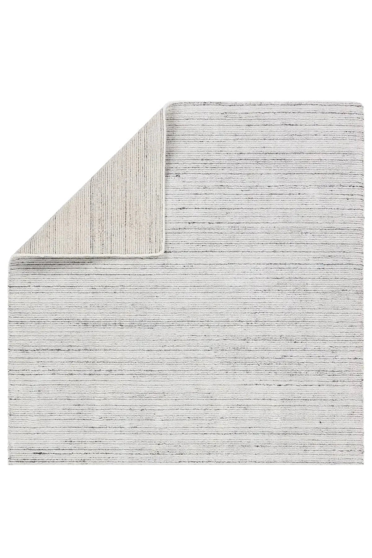 The Aiya rug showcases a subtly striped design in a cream and light gray colorway and includes hints of black. The cut and looped polyester pile creates texture and an easy-care accent piece that thrives both indoors and out.