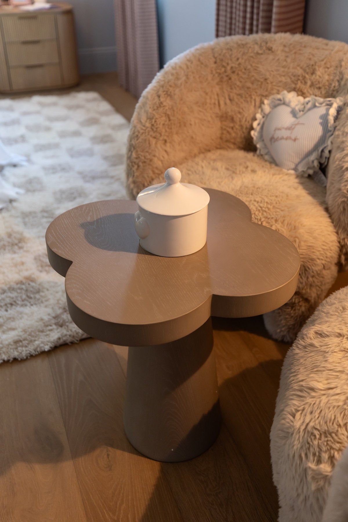 Shaped like a blooming flower, the Allium Side Table brings a playful twist to natural texture and form. Its creamy, smooth-finish top is easy to clean, while the grey-brown ash veneer base and grain detailing add a warm vibe to this sculptural standout.