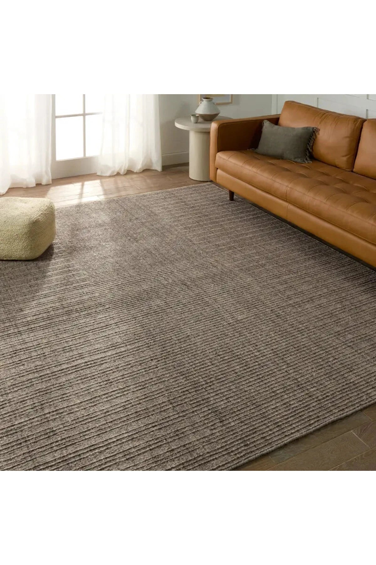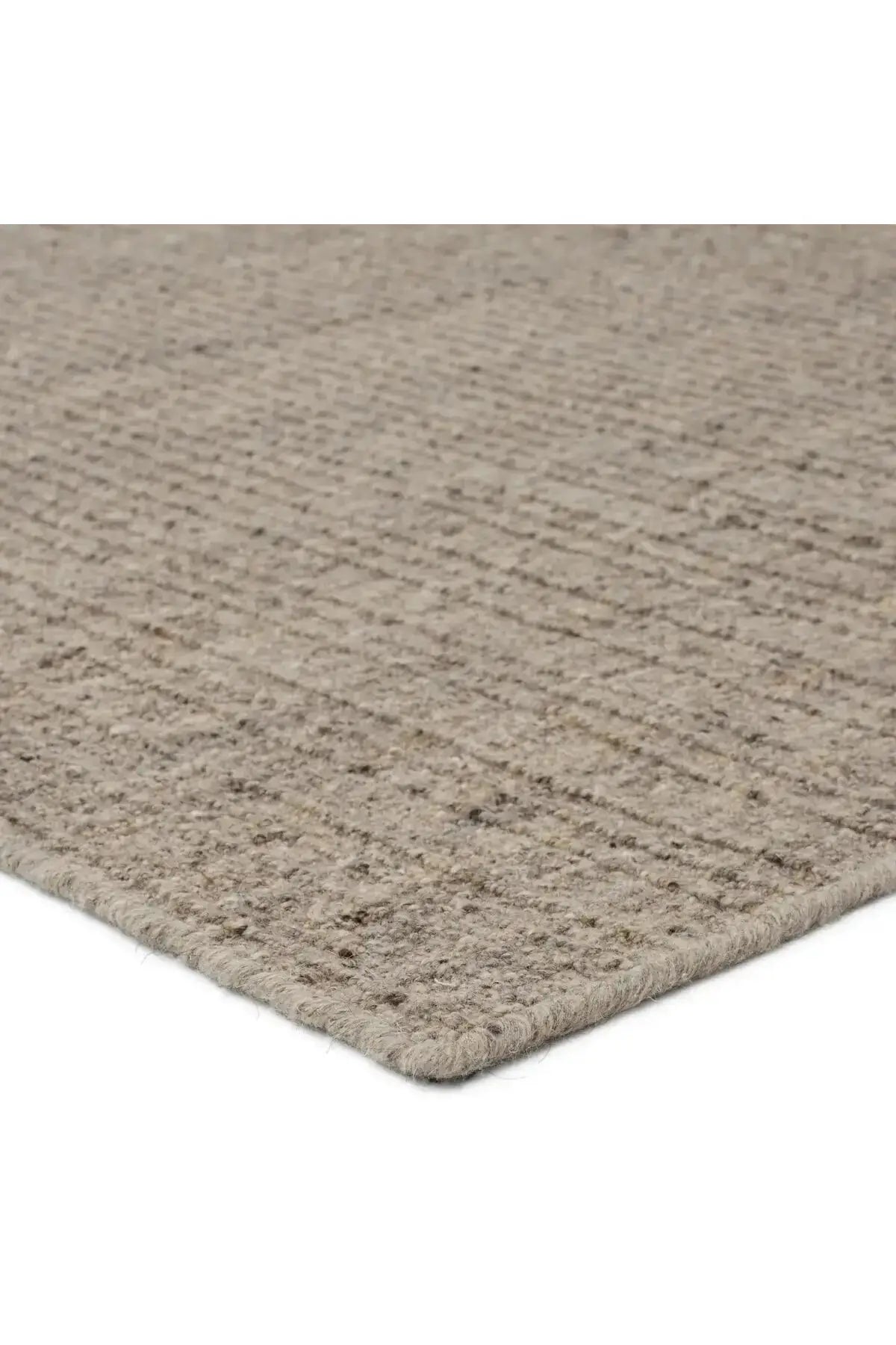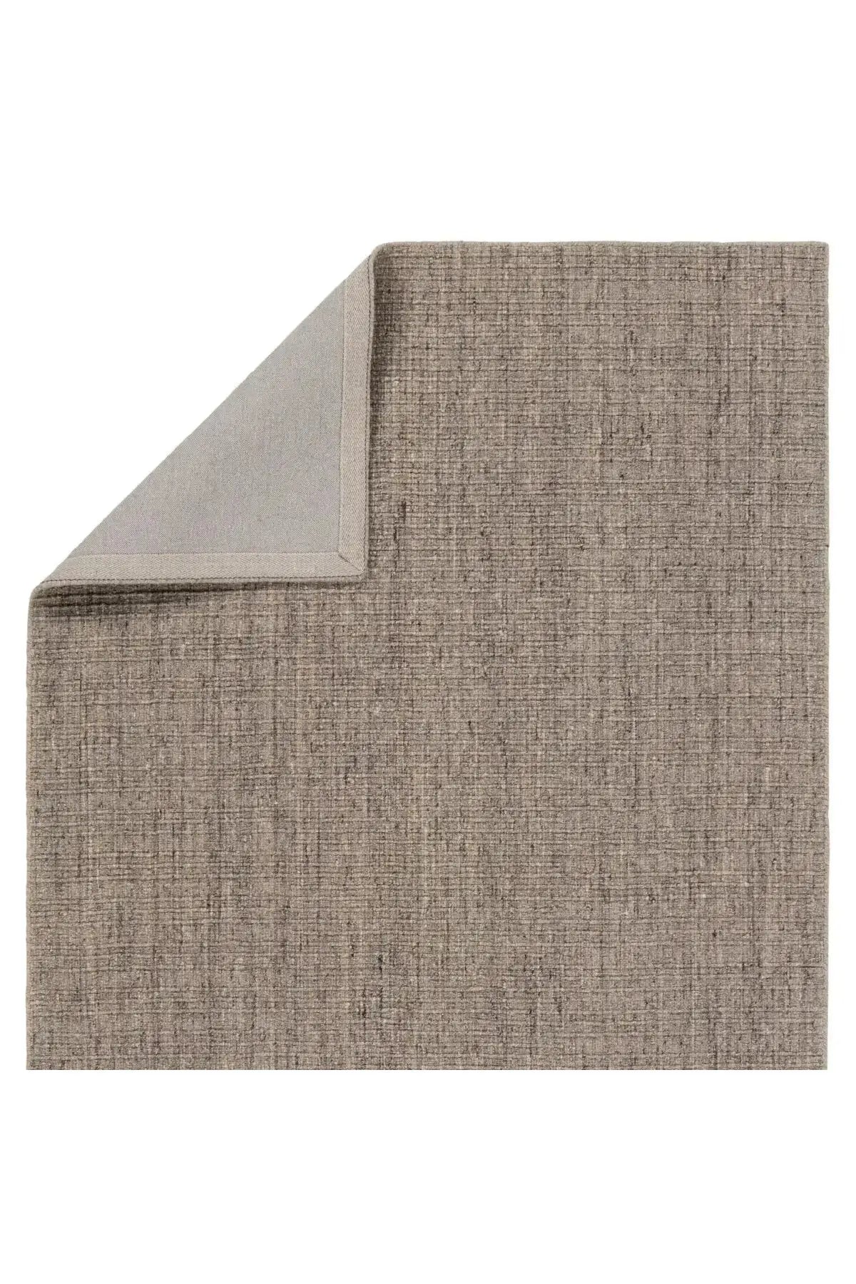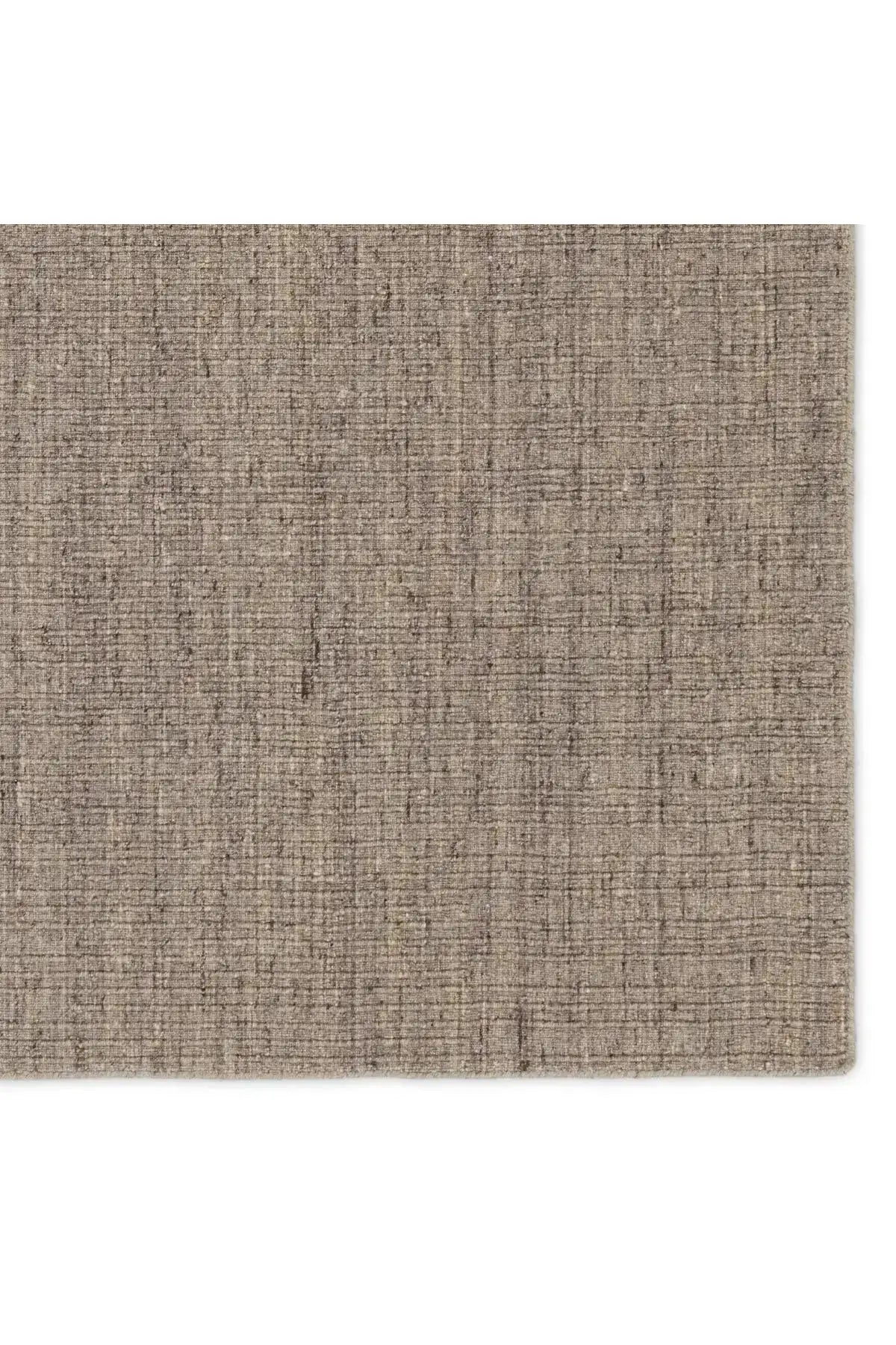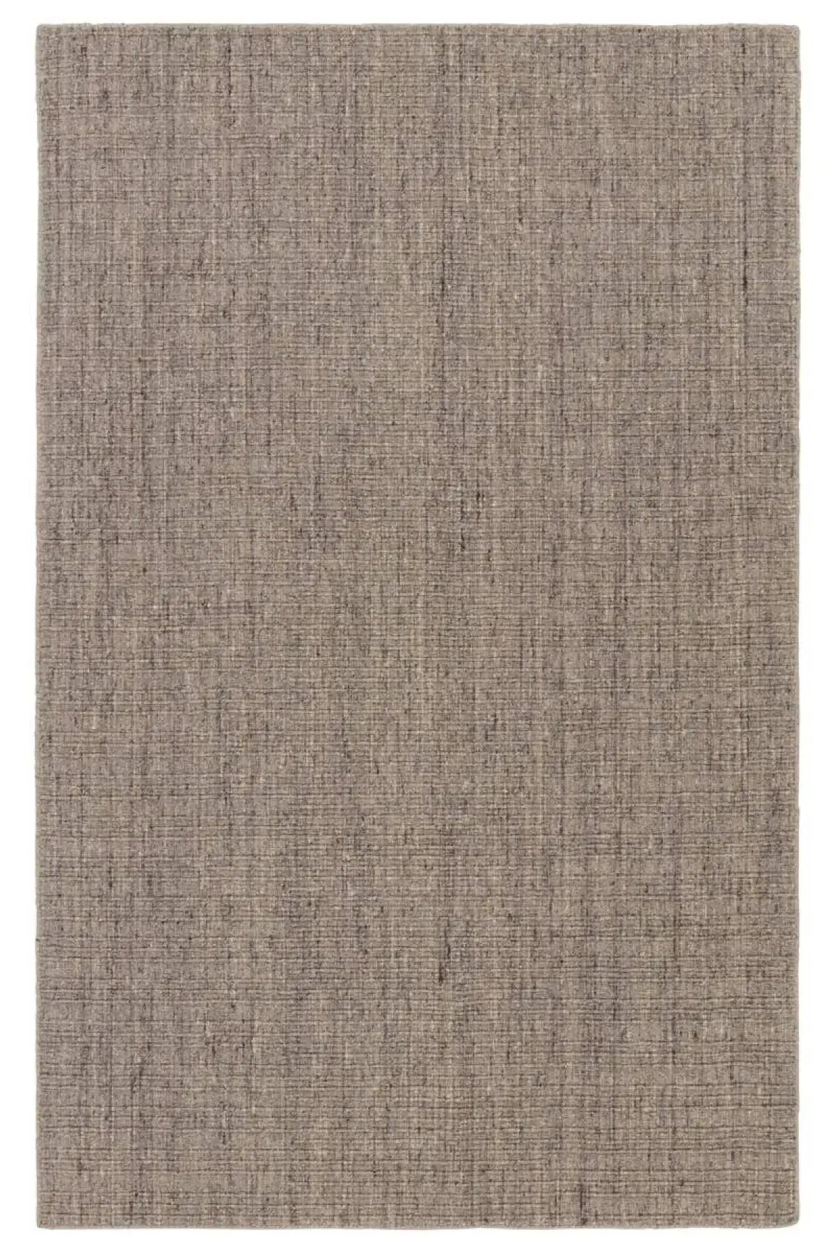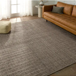 The Amity Rug - Chocolate Torte features a handwoven design with a blend of gray, cream, brown, and dark tones that adds texture and style to any modern room. Made from durable wool and PET fibers, it’s perfect for busy areas like living rooms and hallways.