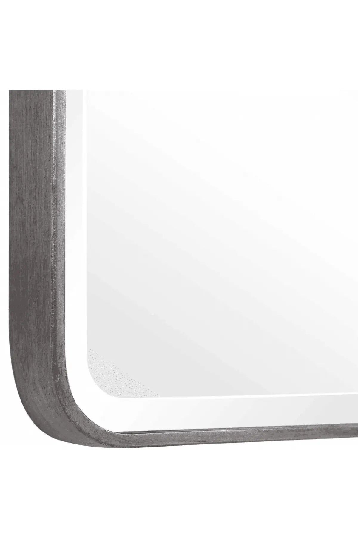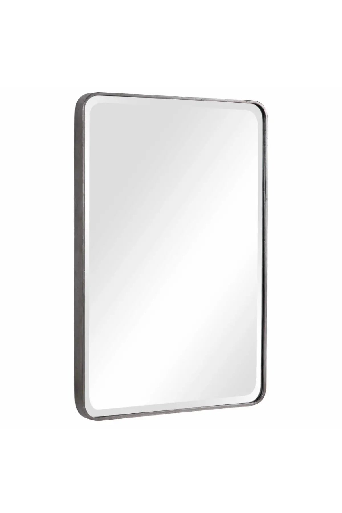 Meet the Aramis Mirror. This iron frame is finished in lightly distressed silver leaf featuring gracefully curved corners. May be hung horizontal or vertical.