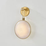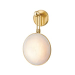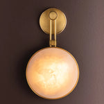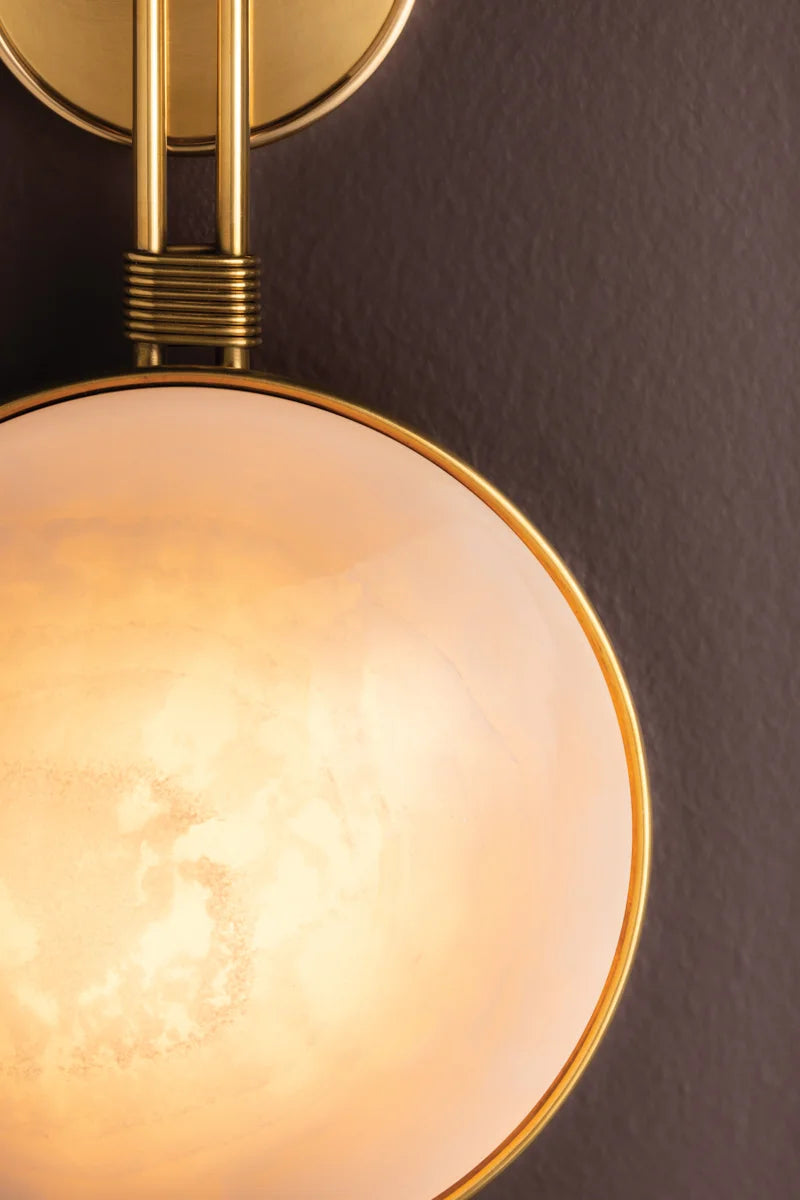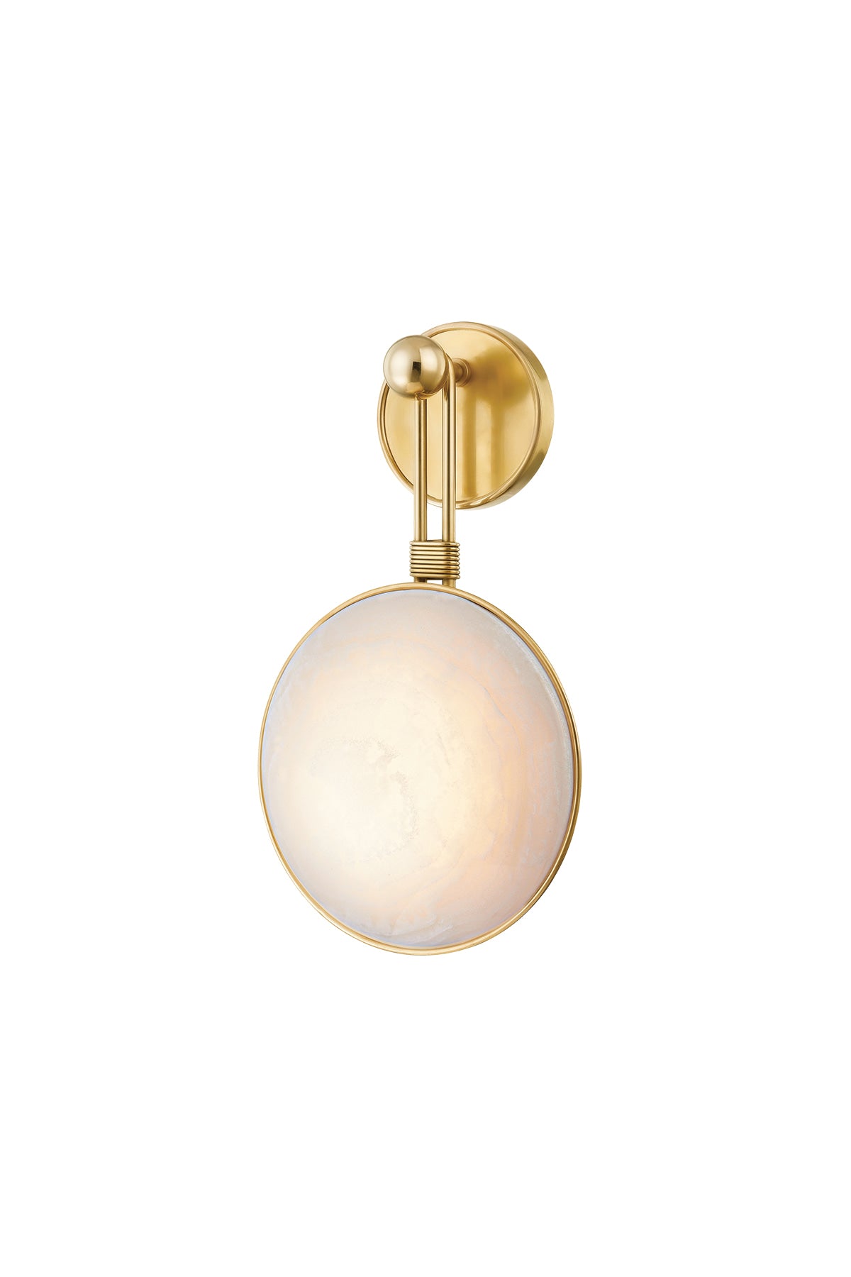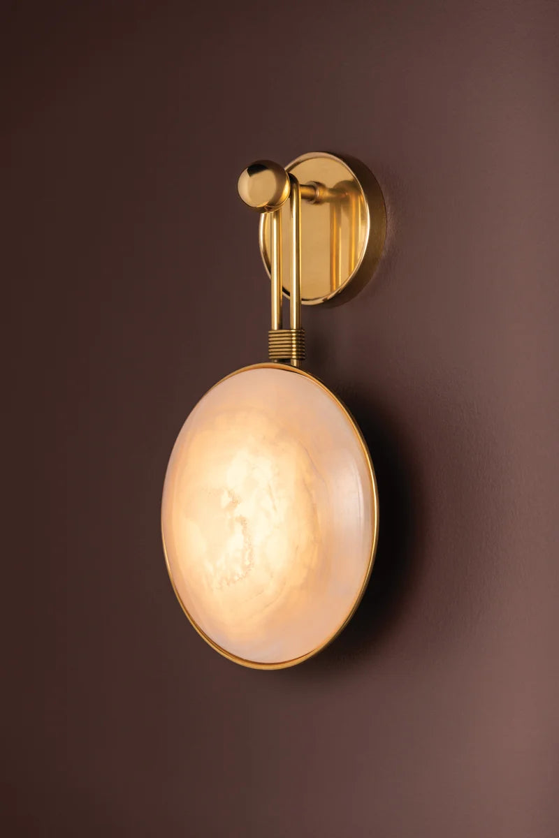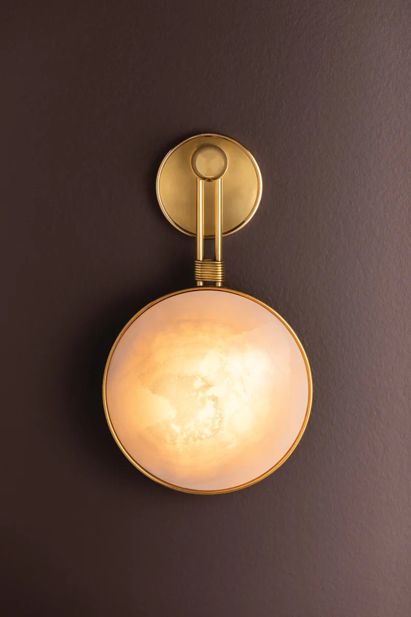 Meet the Ares Sconce. Reminiscent of a dangling jewelry charm, Ares lends an otherworldly beauty to modern interiors. When illuminated, the central LED-lit ice onyx lens glows with a mesmerizing mother-of-pearl-like iridescence. Subtle details, from the stone finial detail to the ribbed metalwork, contribute to the artisanal feel of this wall light. Finished in warm Vintage Brass, Ares adds a note of luxury to a hallway, powder room, or bedside.