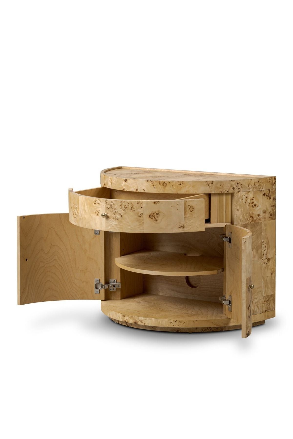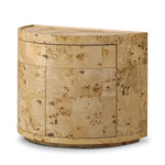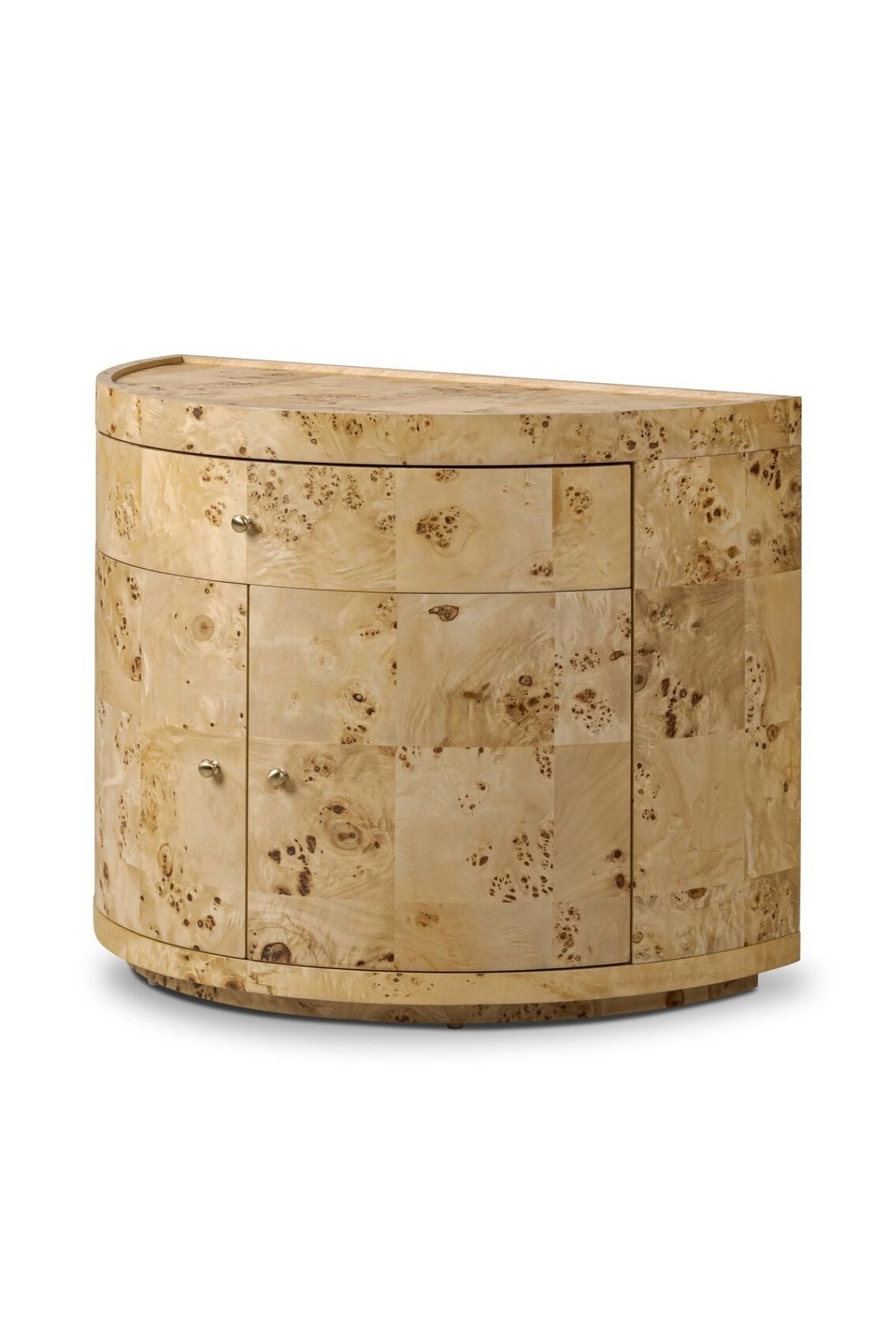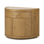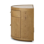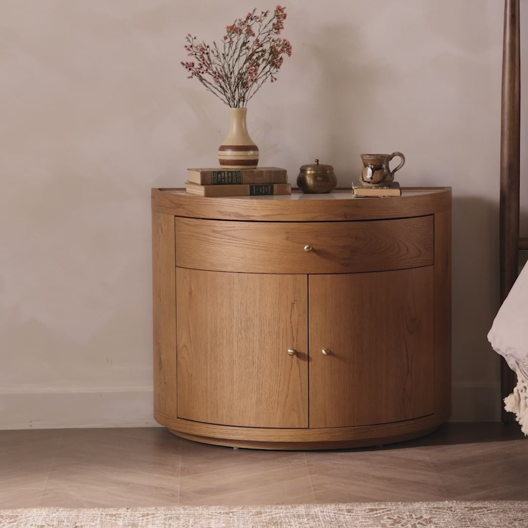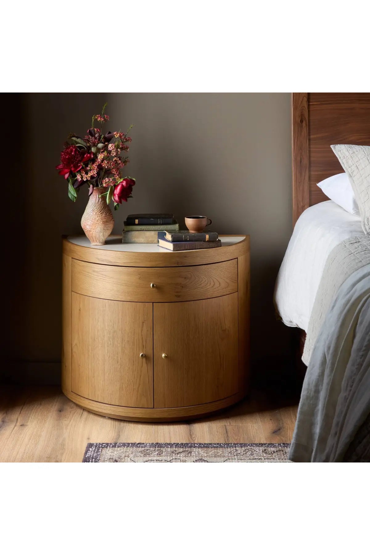 Meet the Ashton Nightstand. Bring a unique look to your bedroom with a demilune nightstand. An oak veneer base opens to generous storage space with removable shelving, while a single drawer keeps your items within reach. A crescent tray-style top of cream marble elevates the whole look. Rear cutout for cord management.
