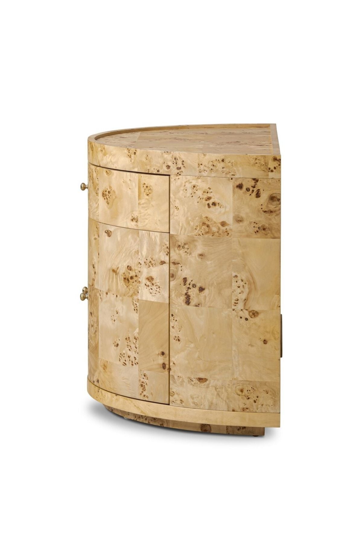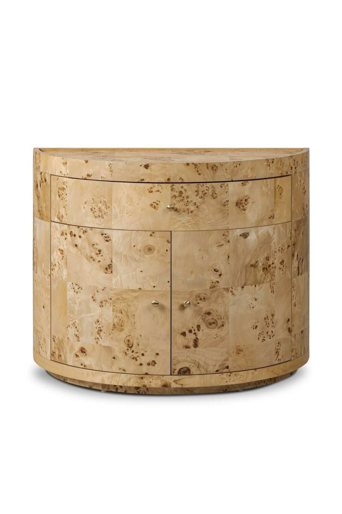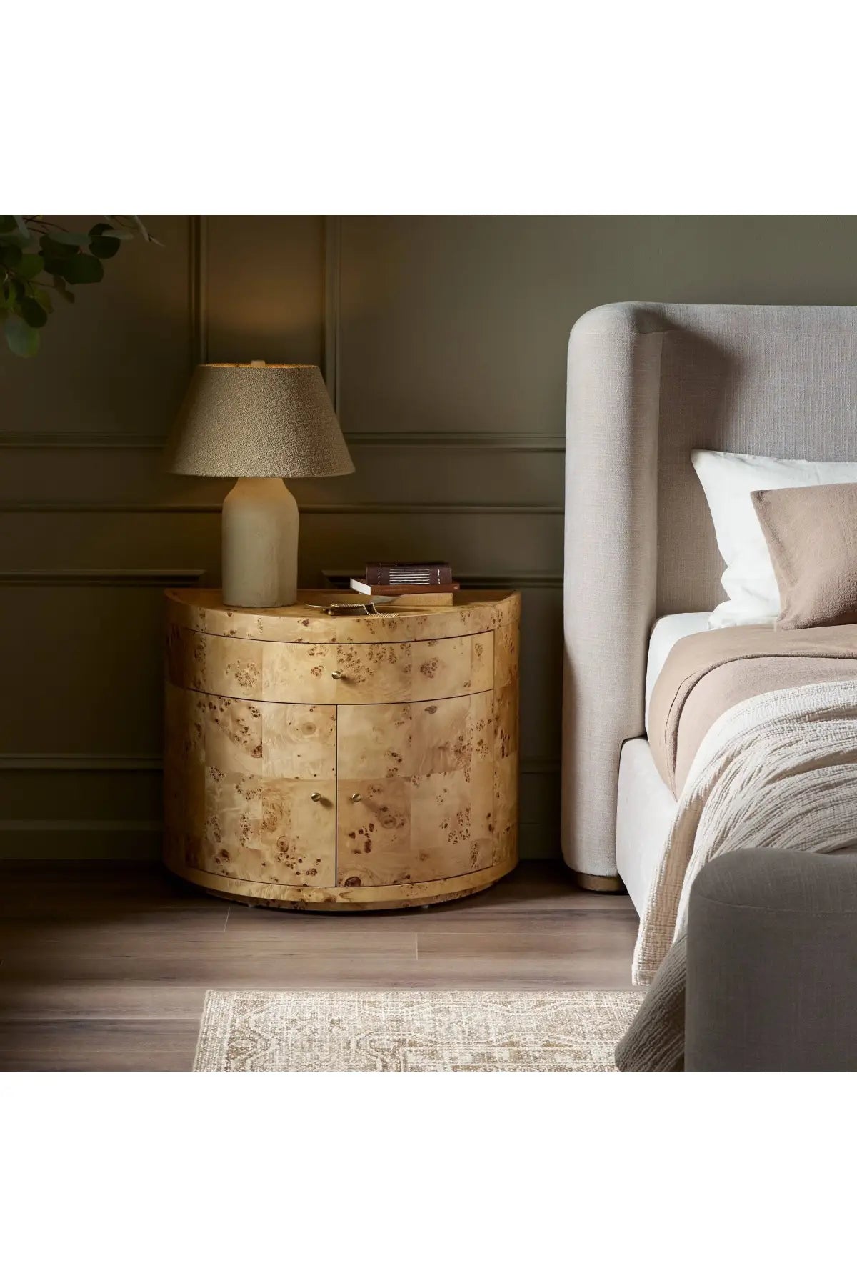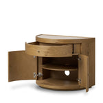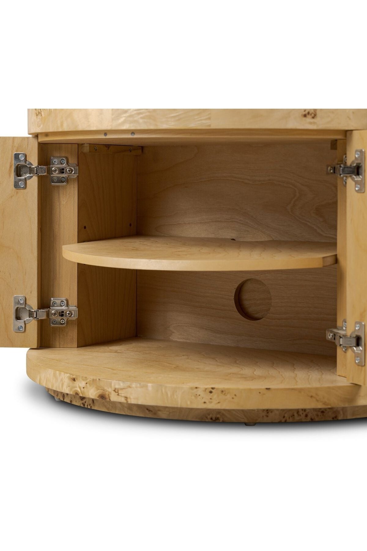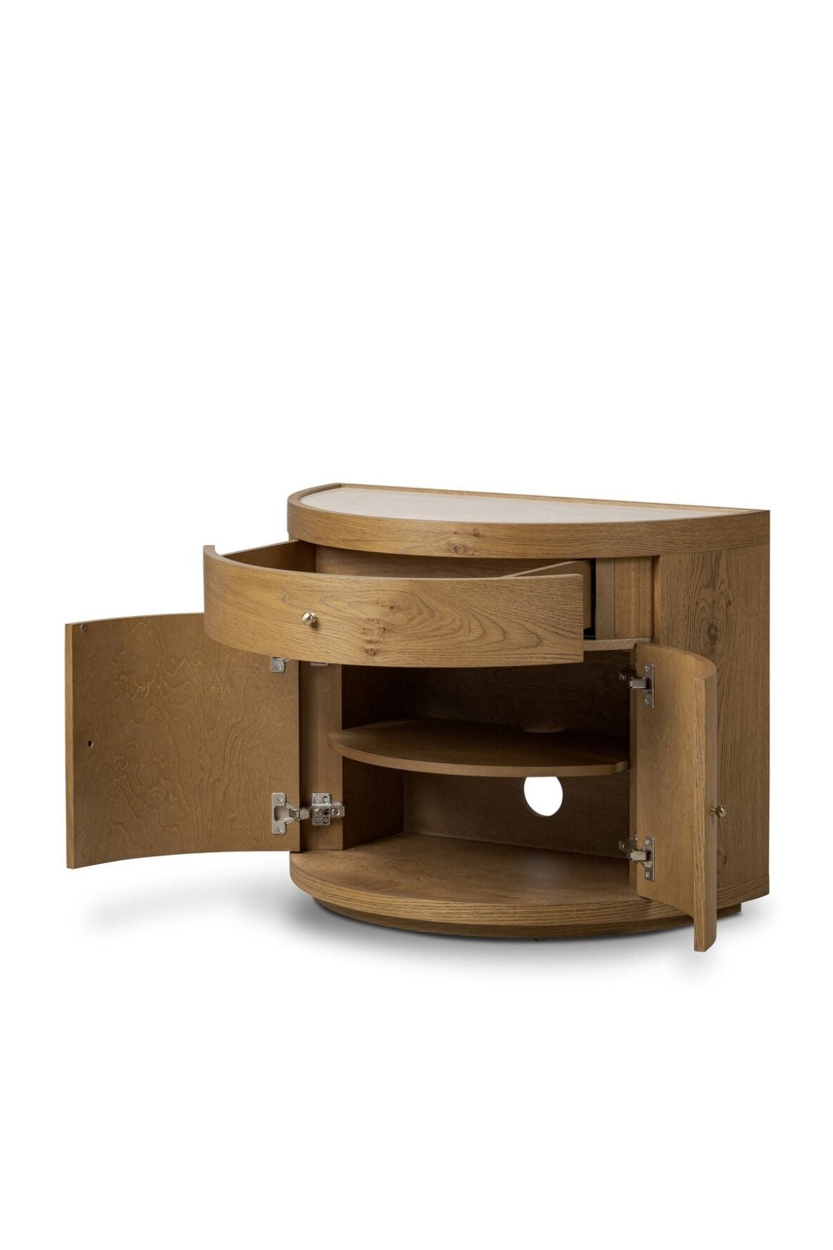Meet the Ashton Nightstand. Bring a unique look to your bedroom with a demilune nightstand. An oak veneer base opens to generous storage space with removable shelving, while a single drawer keeps your items within reach. A crescent tray-style top of cream marble elevates the whole look. Rear cutout for cord management.