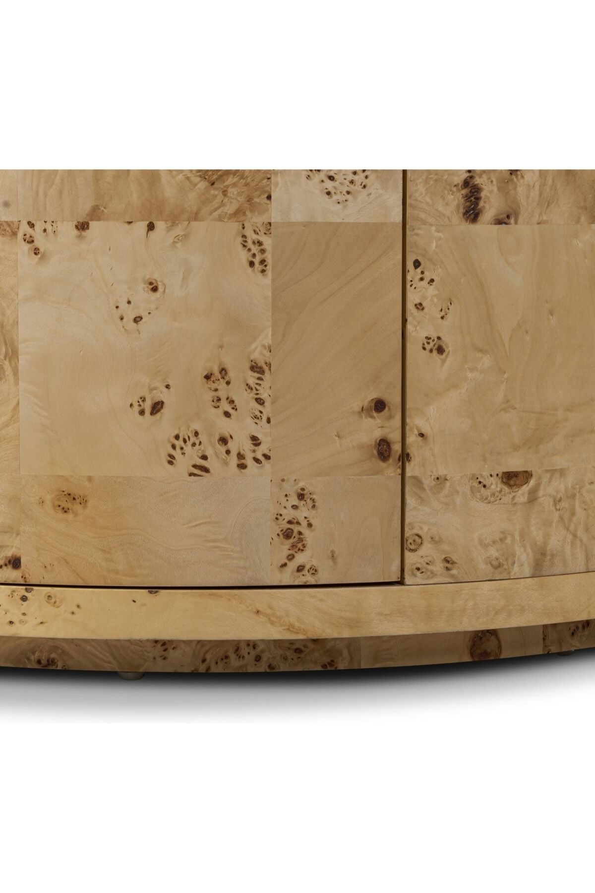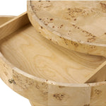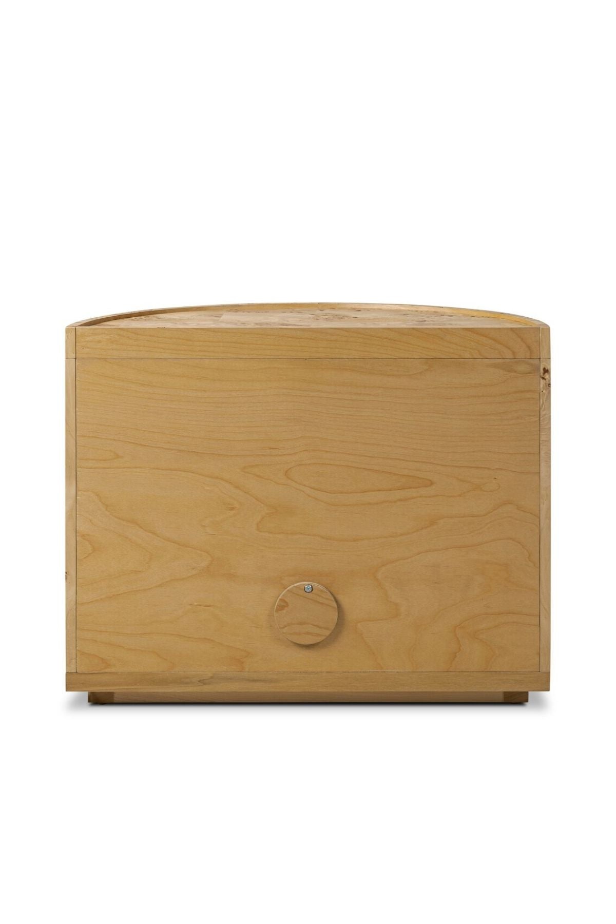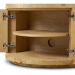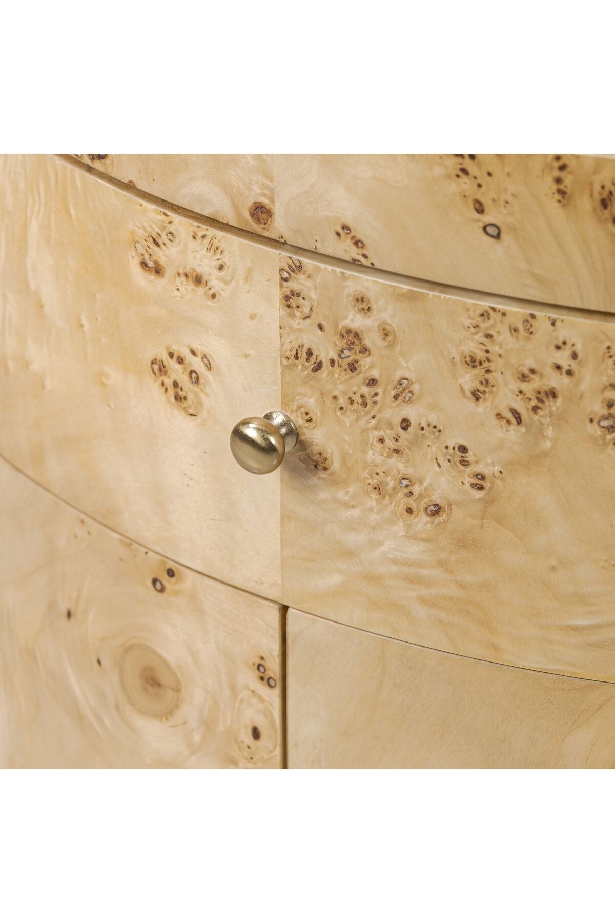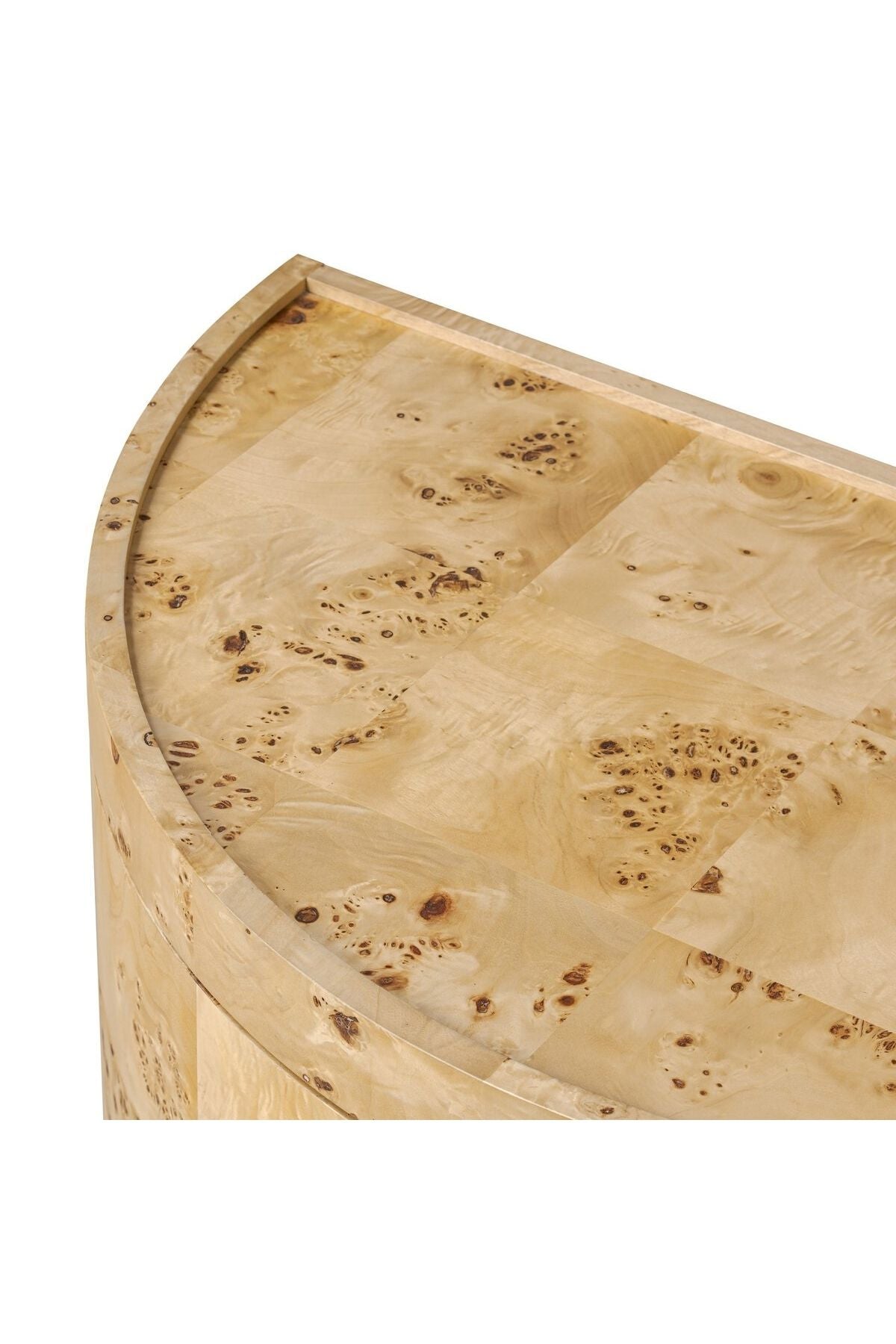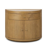 Meet the Ashton Nightstand. Bring a unique look to your bedroom with a demilune nightstand. An oak veneer base opens to generous storage space with removable shelving, while a single drawer keeps your items within reach. A crescent tray-style top of cream marble elevates the whole look. Rear cutout for cord management.