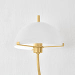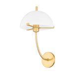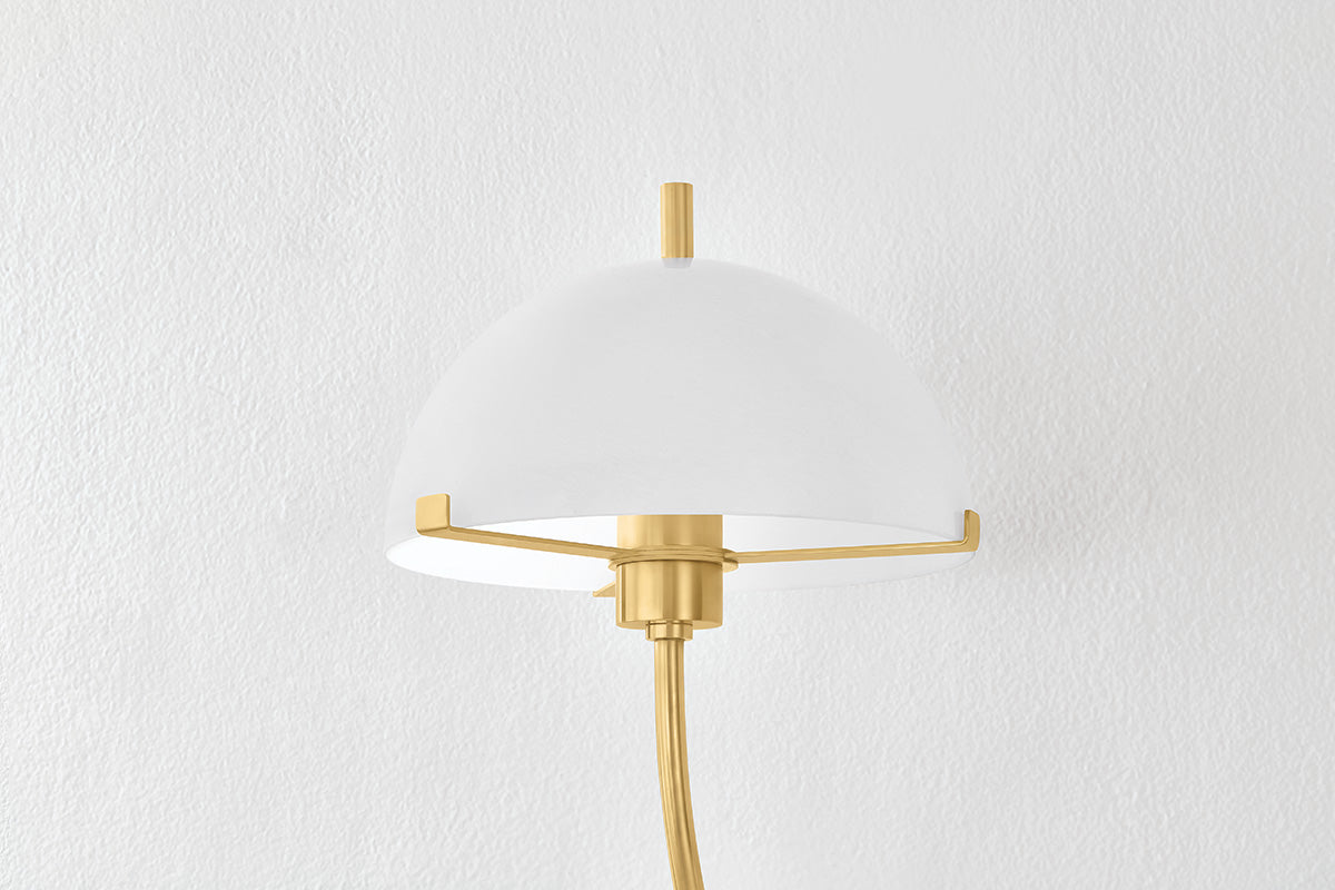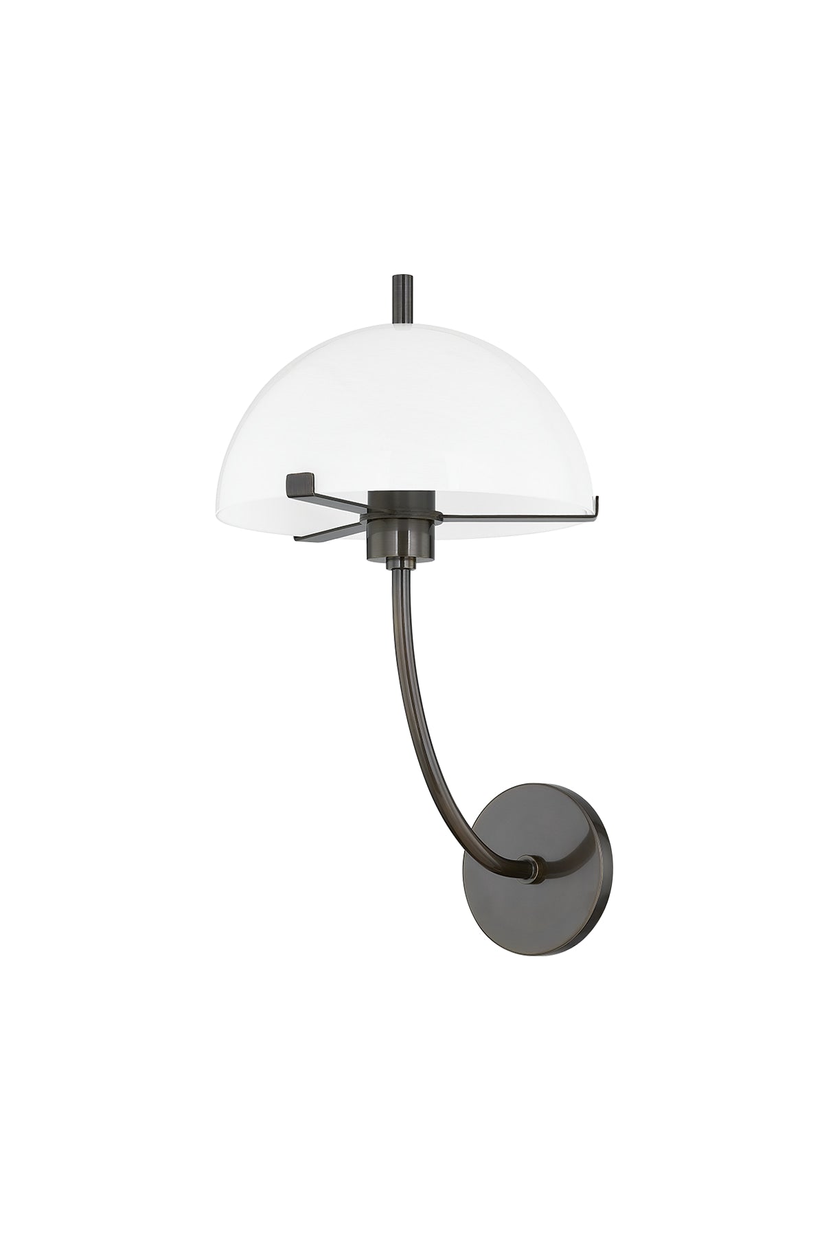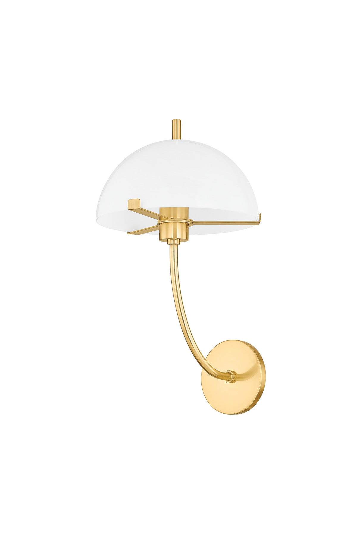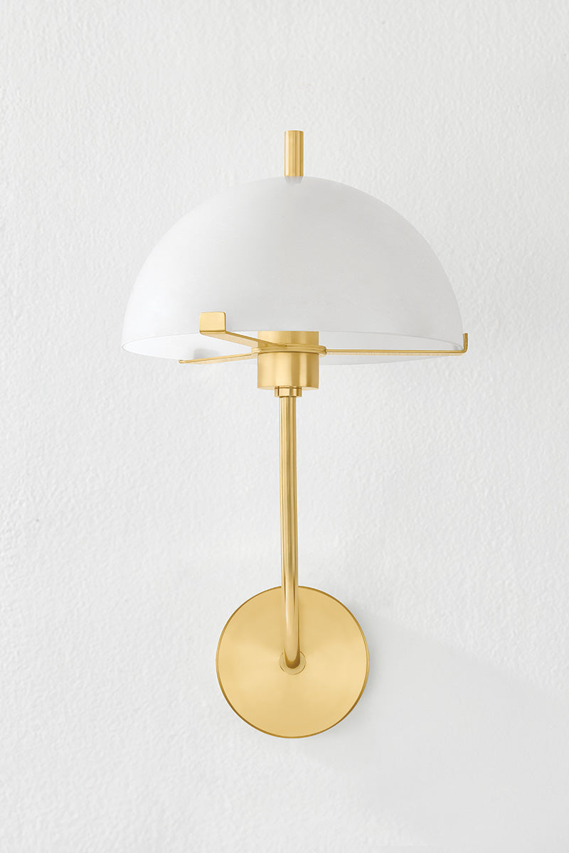 Meet the Atala Sconce. Atala leans wholeheartedly into the mushroom trend with its elongated arm and large dome shade. The graceful curve upwards seems to exude confidence as the fixture emits an inviting glow. Distinctive jewelry-like clasps support the shade while adding decorative flair. Perfect in a vanity setting, this stylish sconce is available in an Aged Brass or True Bronze finish. accent piece. Bulb(s) not included.