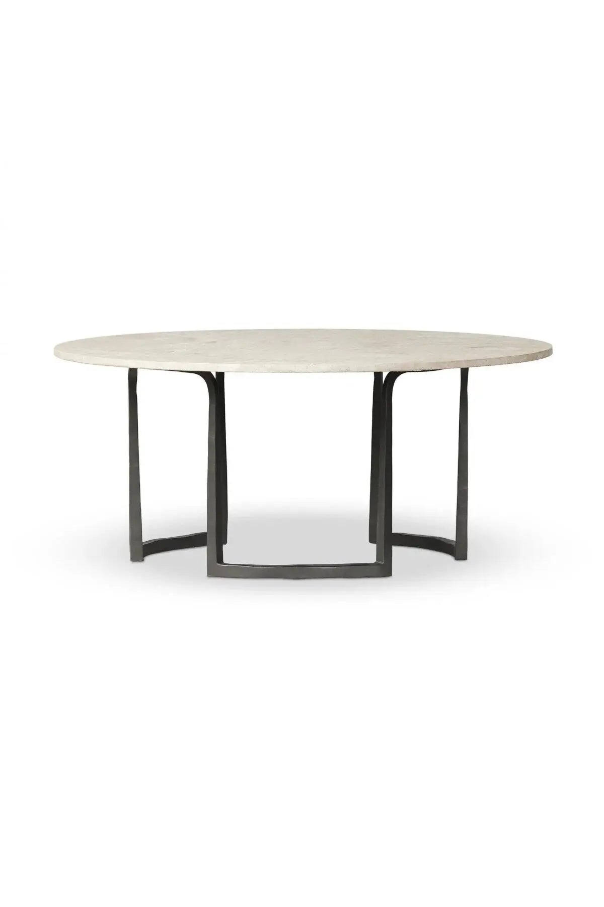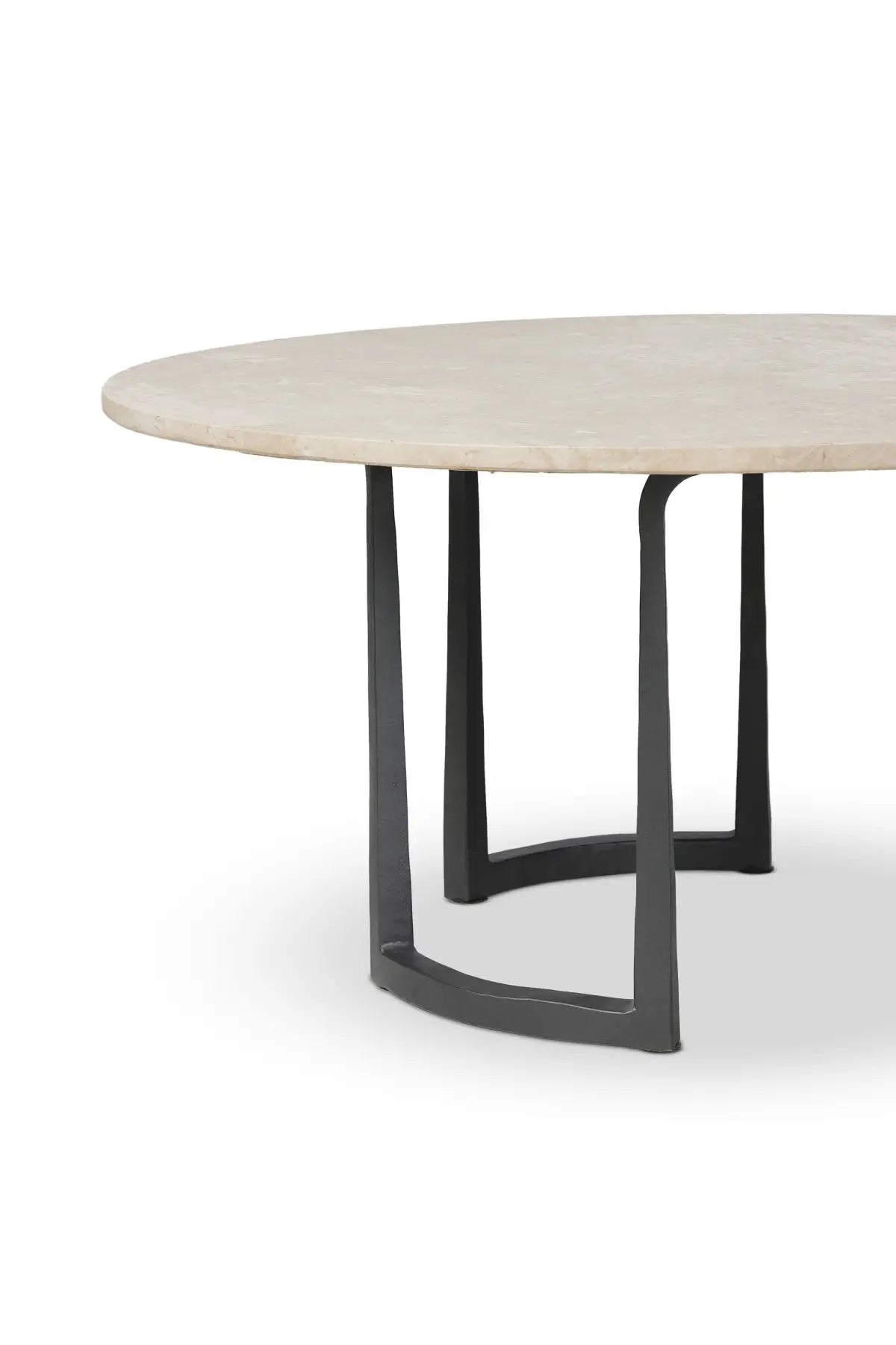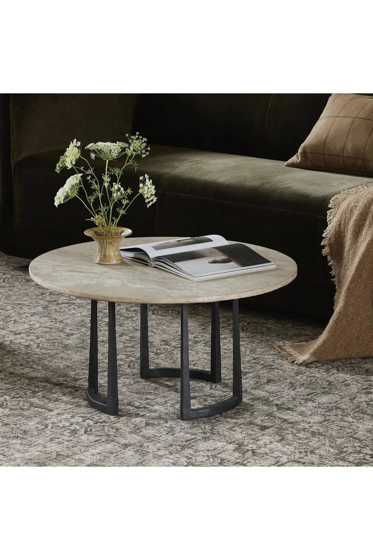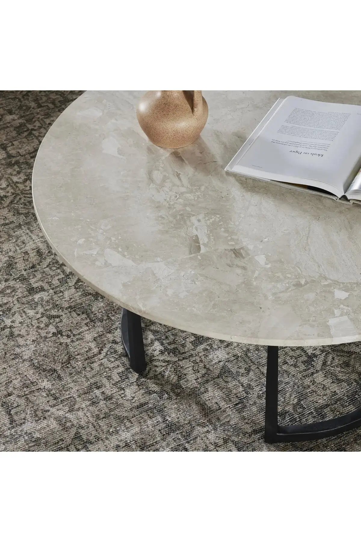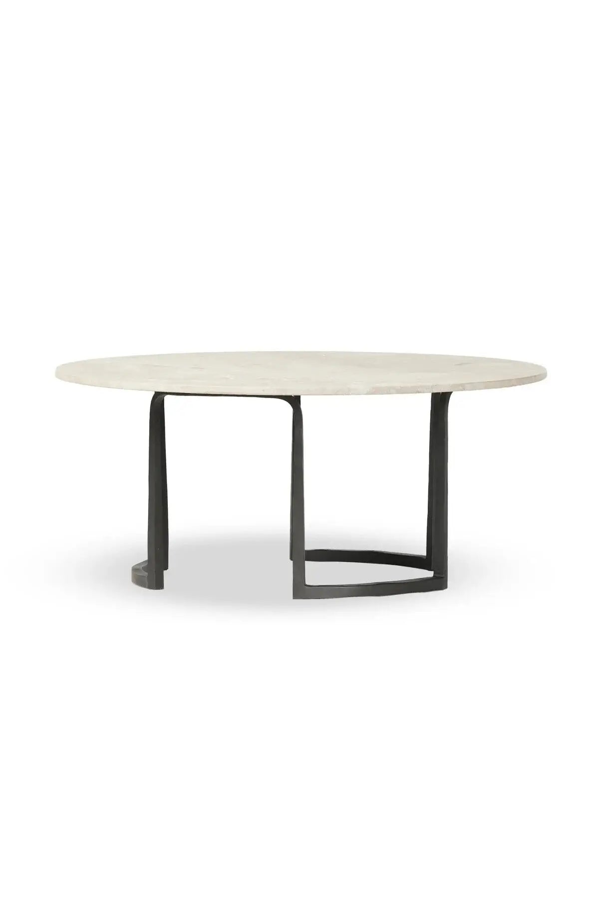 Meet the Axtell Coffee Table. Hammered iron bends seamlessly in a continuous pattern to create the base of this small, mixed-material coffee table. Made from expressive marble, a rounded tabletop displays unique markings and natural patterns.
