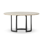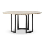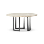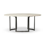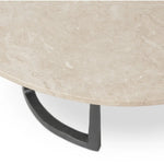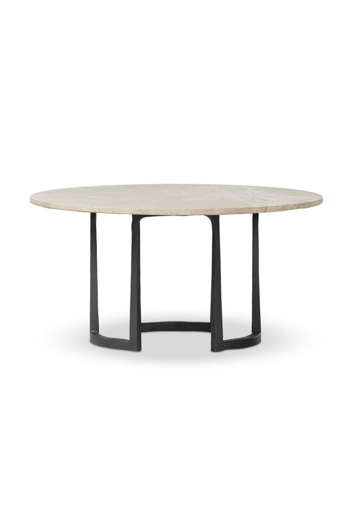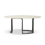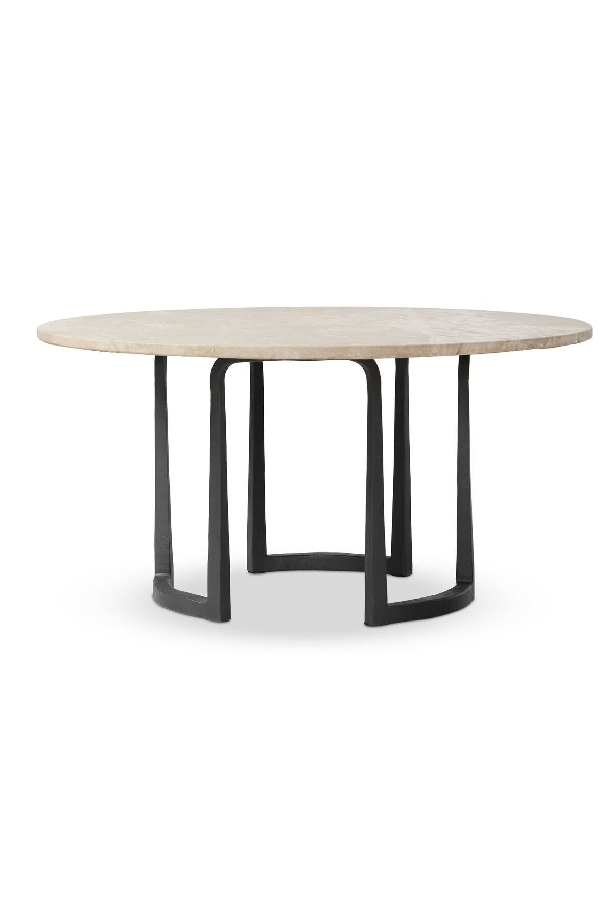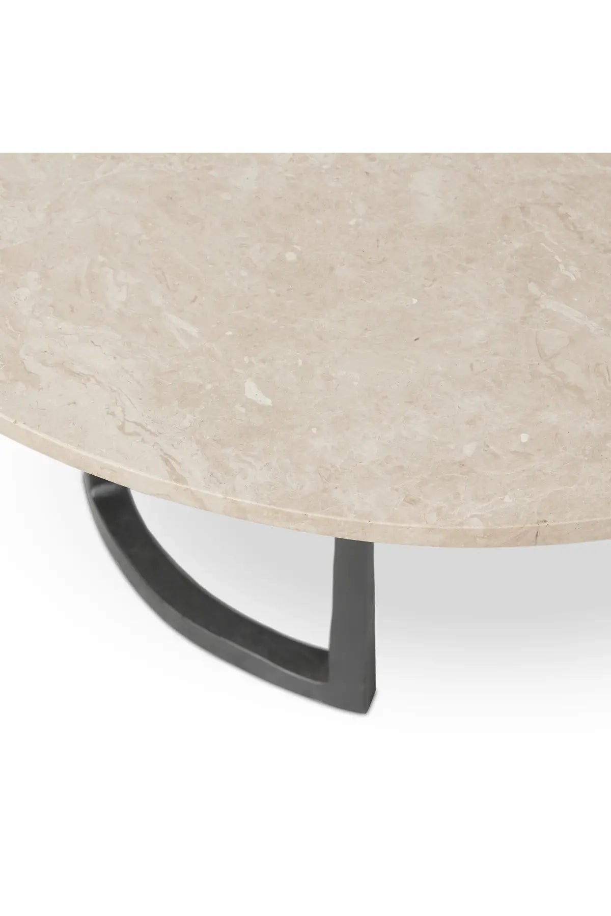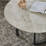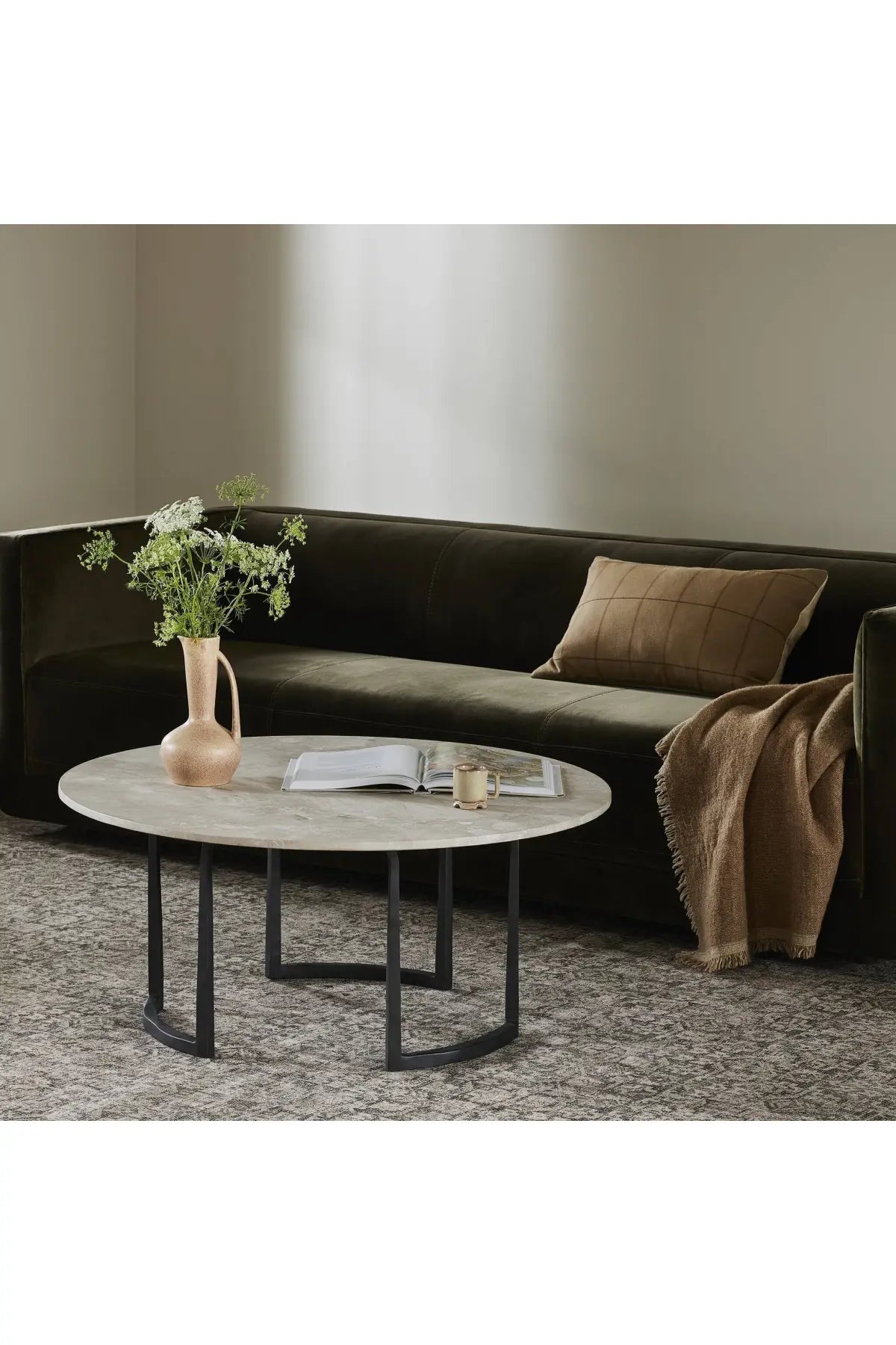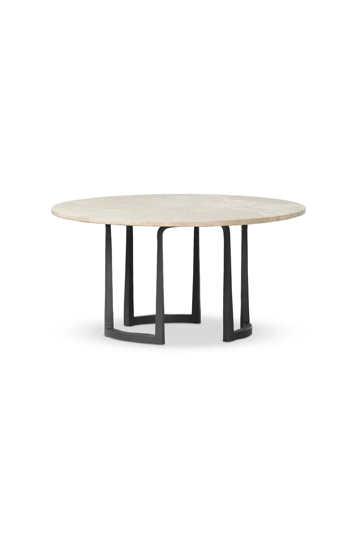 Meet the Axtell Coffee Table. Hammered iron bends seamlessly in a continuous pattern to create the base of this small, mixed-material coffee table. Made from expressive marble, a rounded tabletop displays unique markings and natural patterns.