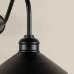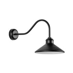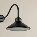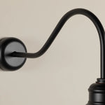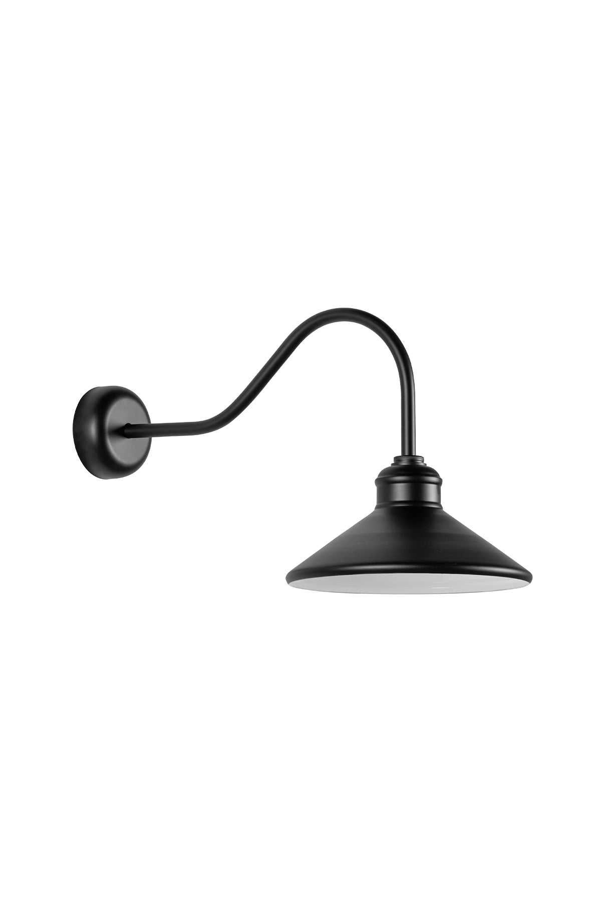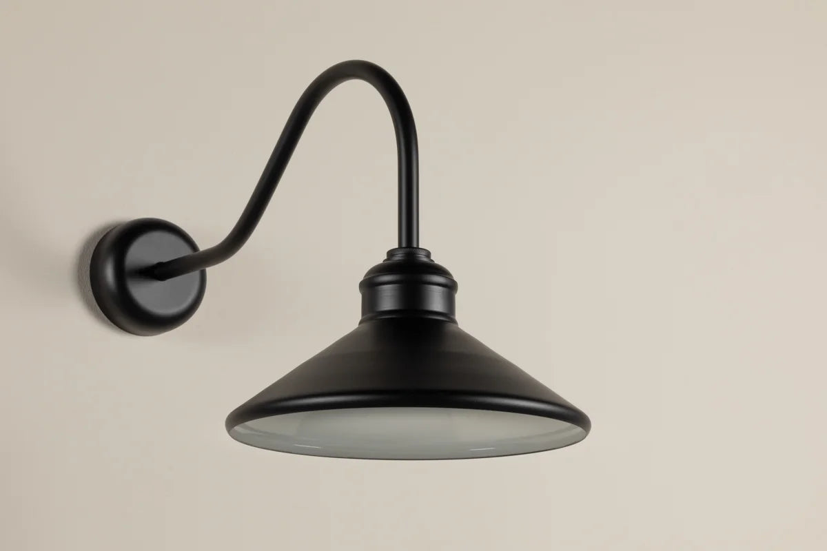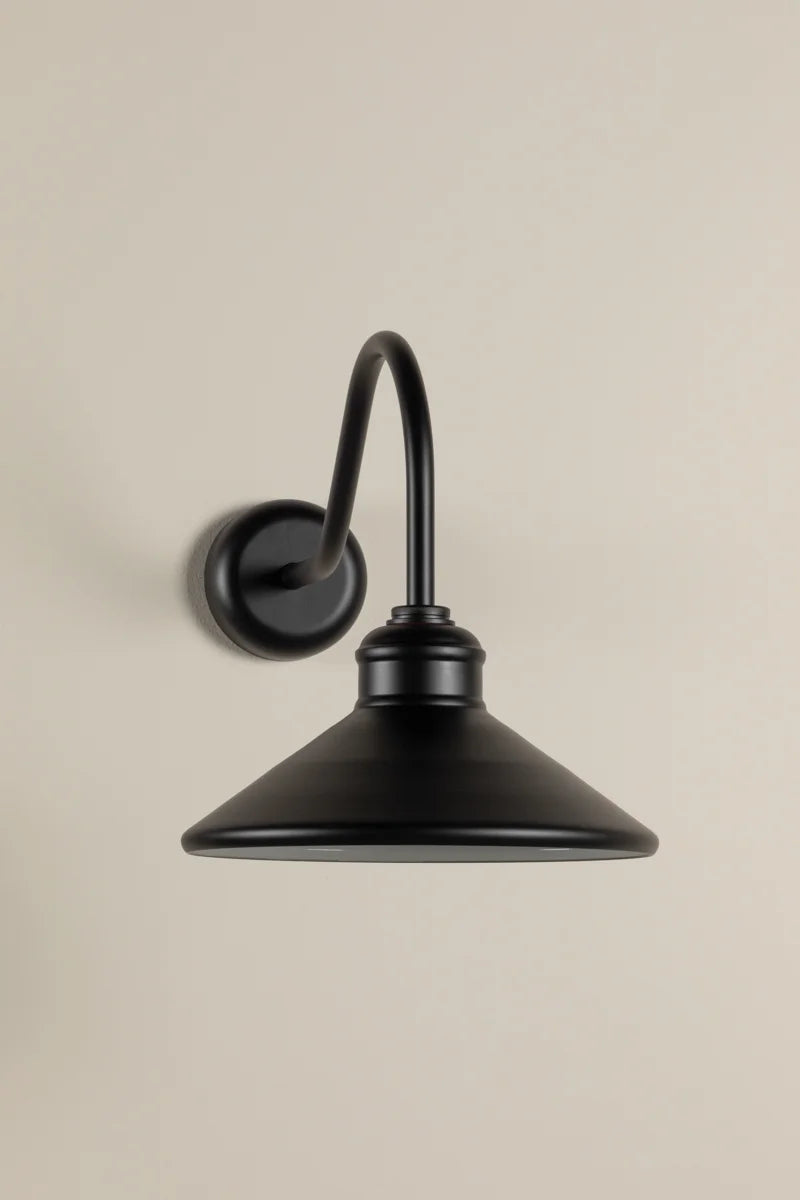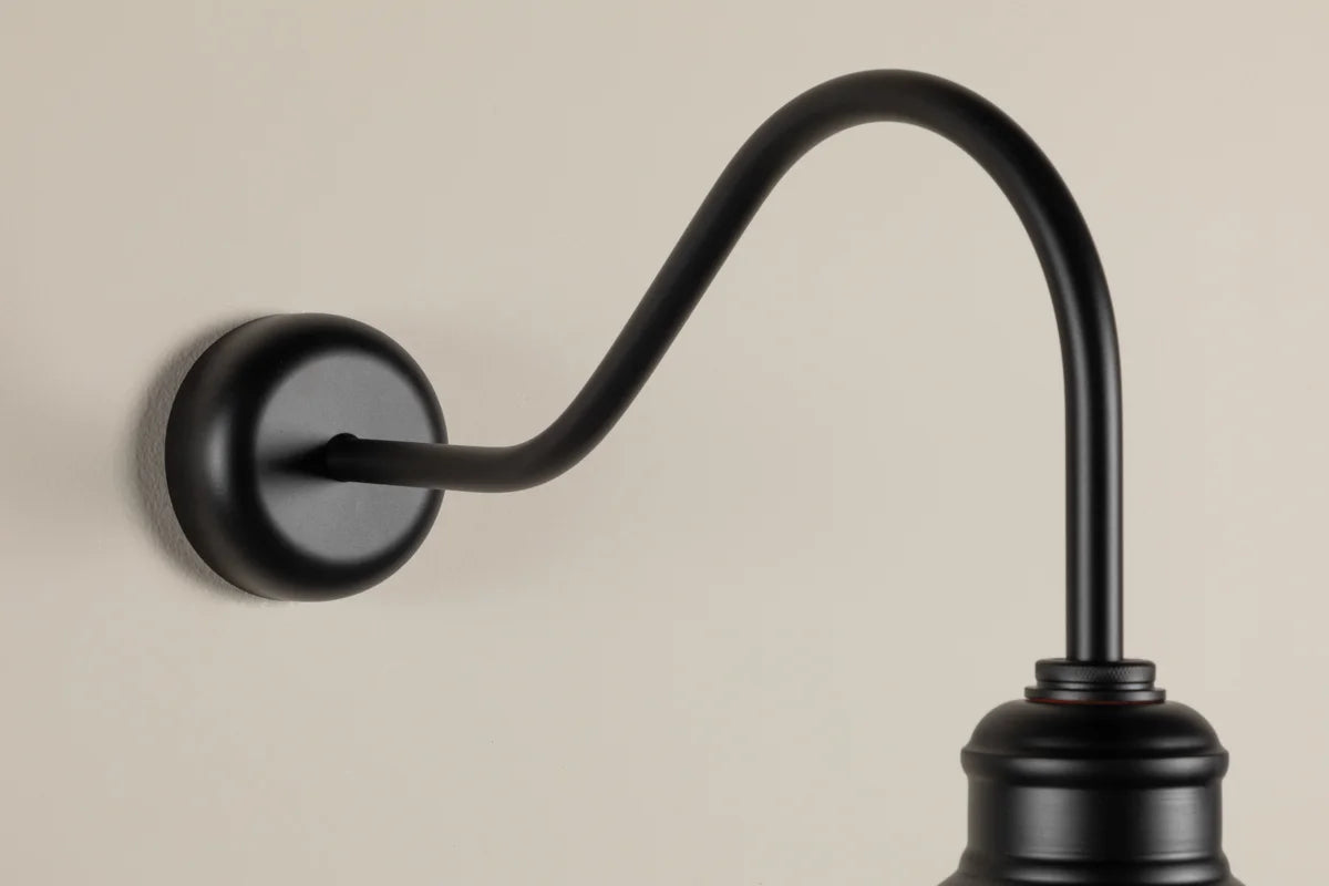 Meet the Bakersfield Sconce. A graceful gooseneck arm supports a sharply tapered shade and caged light source. The allover Matte Black coating adds a timeless finish to this vintage-inspired wall light. Bulb(s) not included.