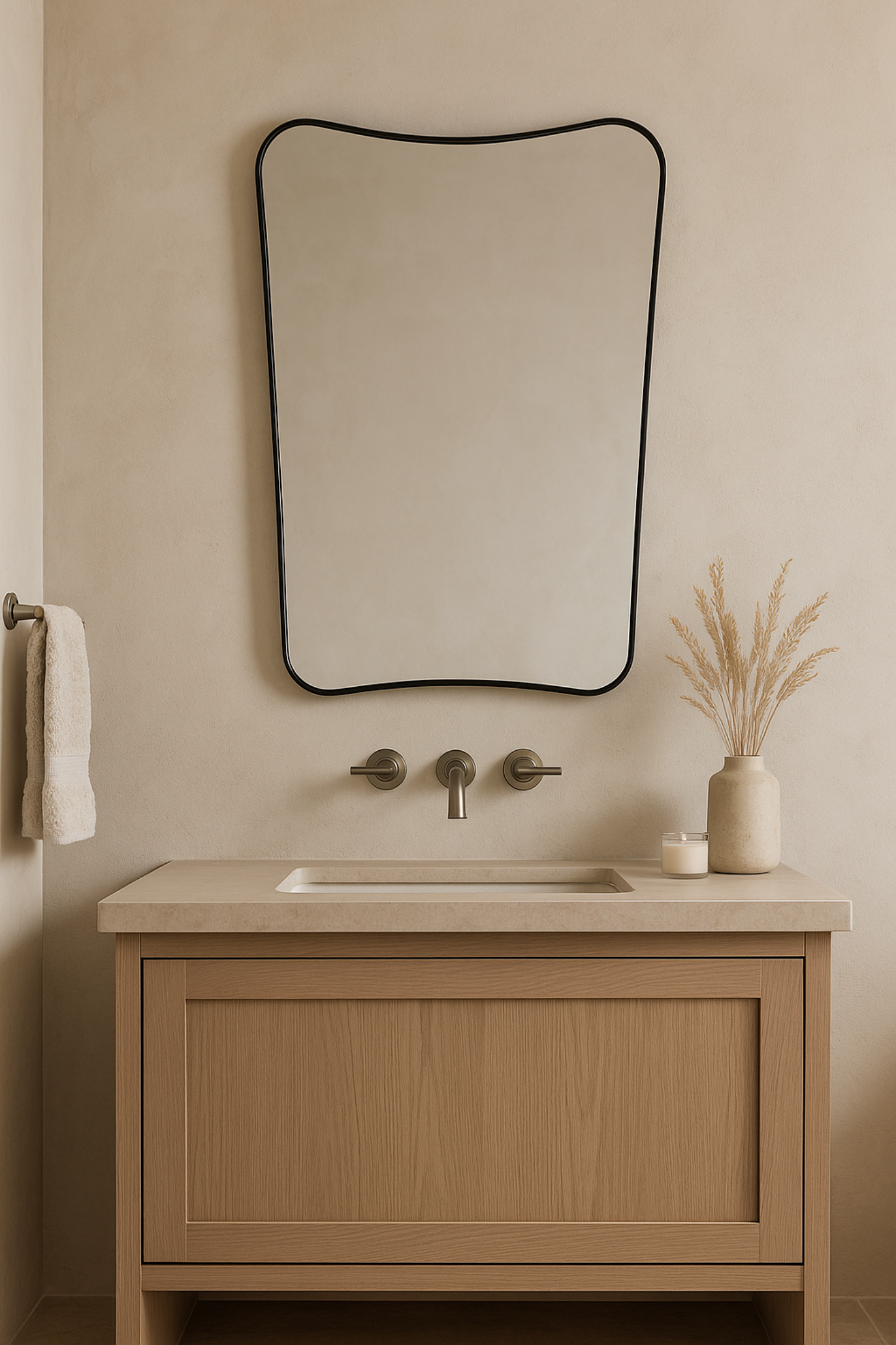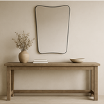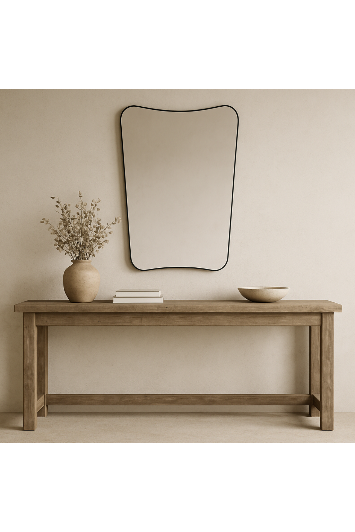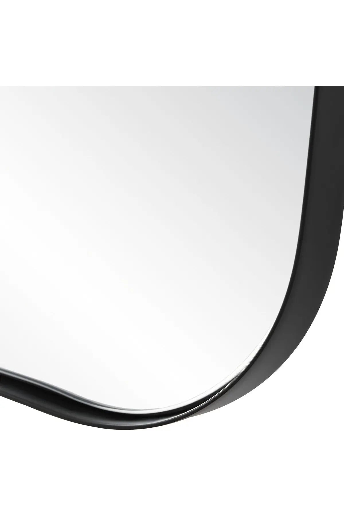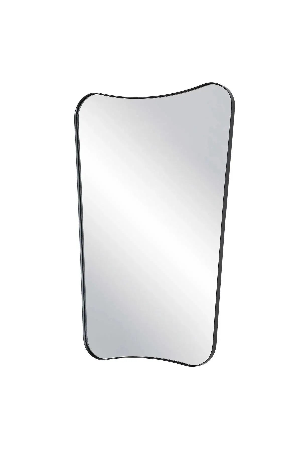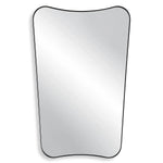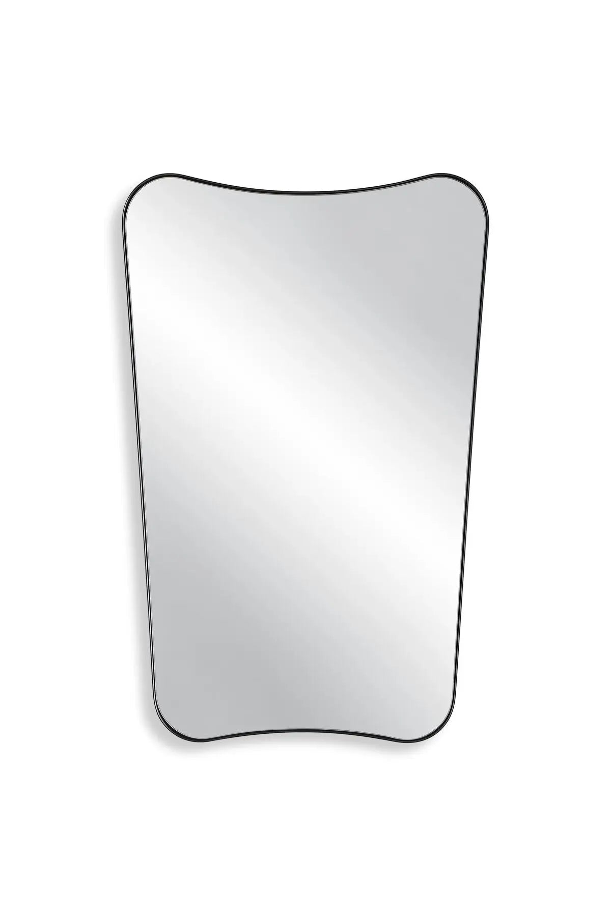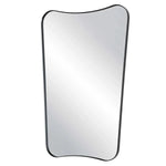 Meet the Belvoir Mirror. This vanity mirror features a sophisticated iron frame finished in a sleek satin black, surrounding a floating polished-edge mirror. The curved silhouette adds a contemporary feel to this piece.