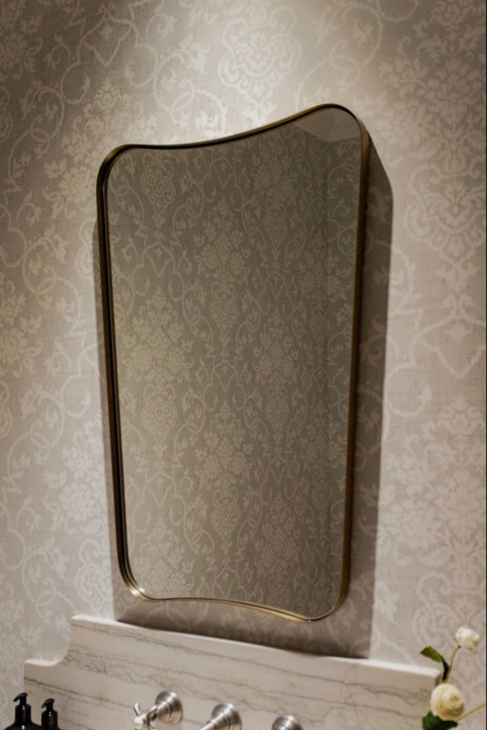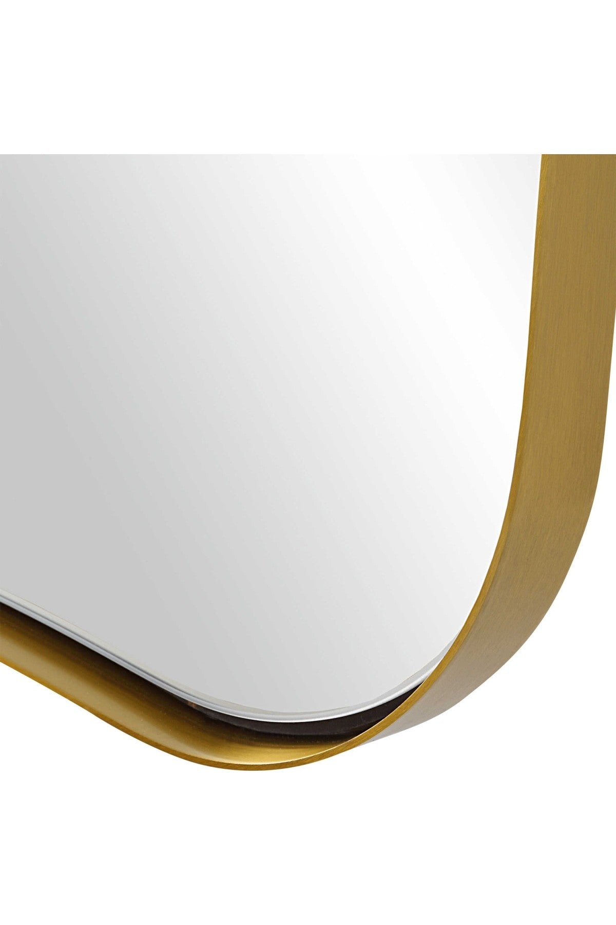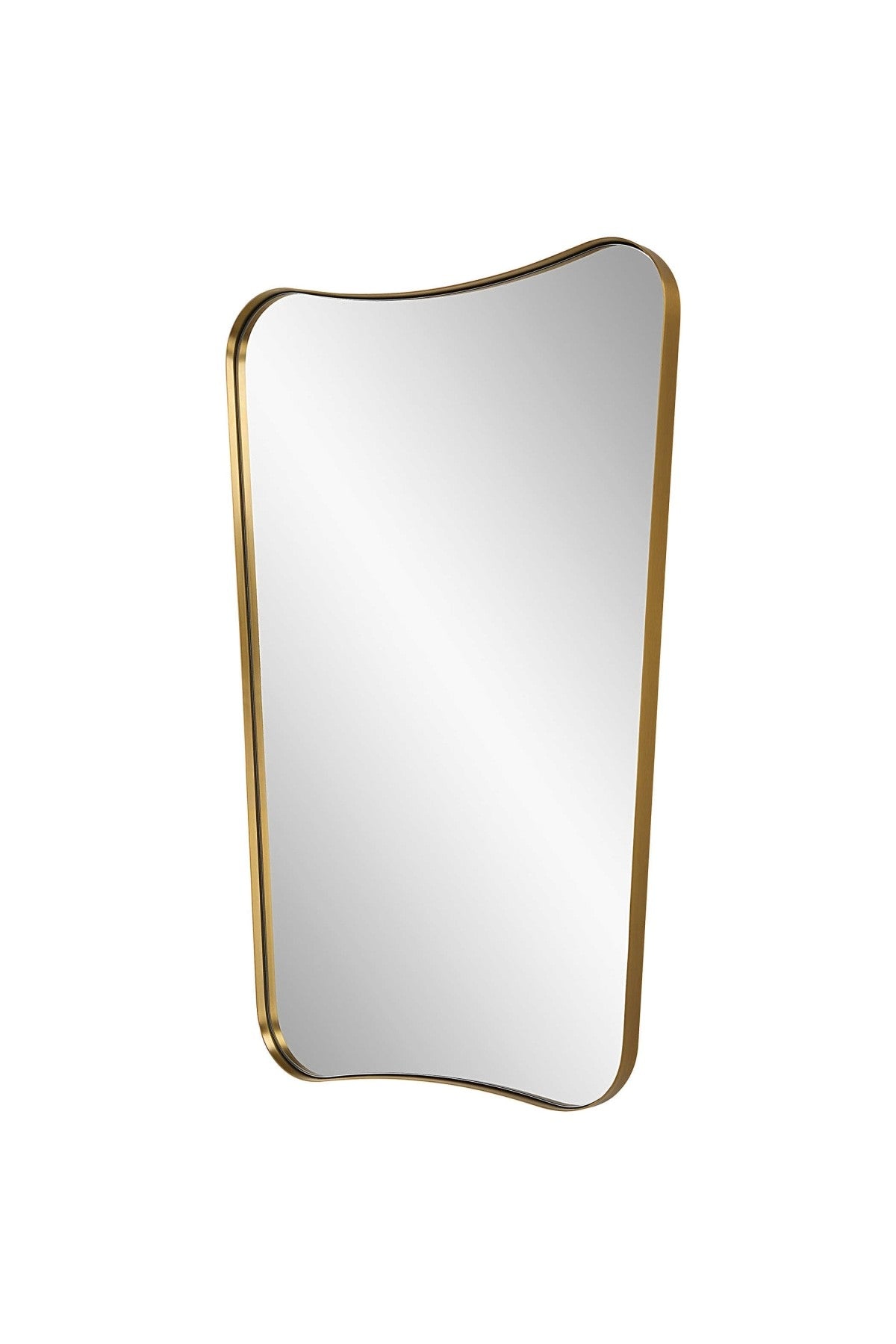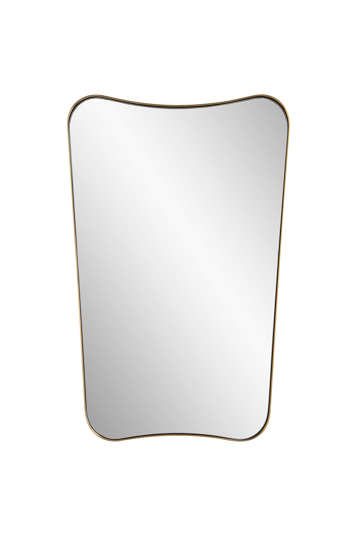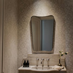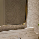 The Belvoir Mirror features a sophisticated stainless steel frame finished in a rich antique brass. The curved silhouette adds a contemporary feel to this piece.