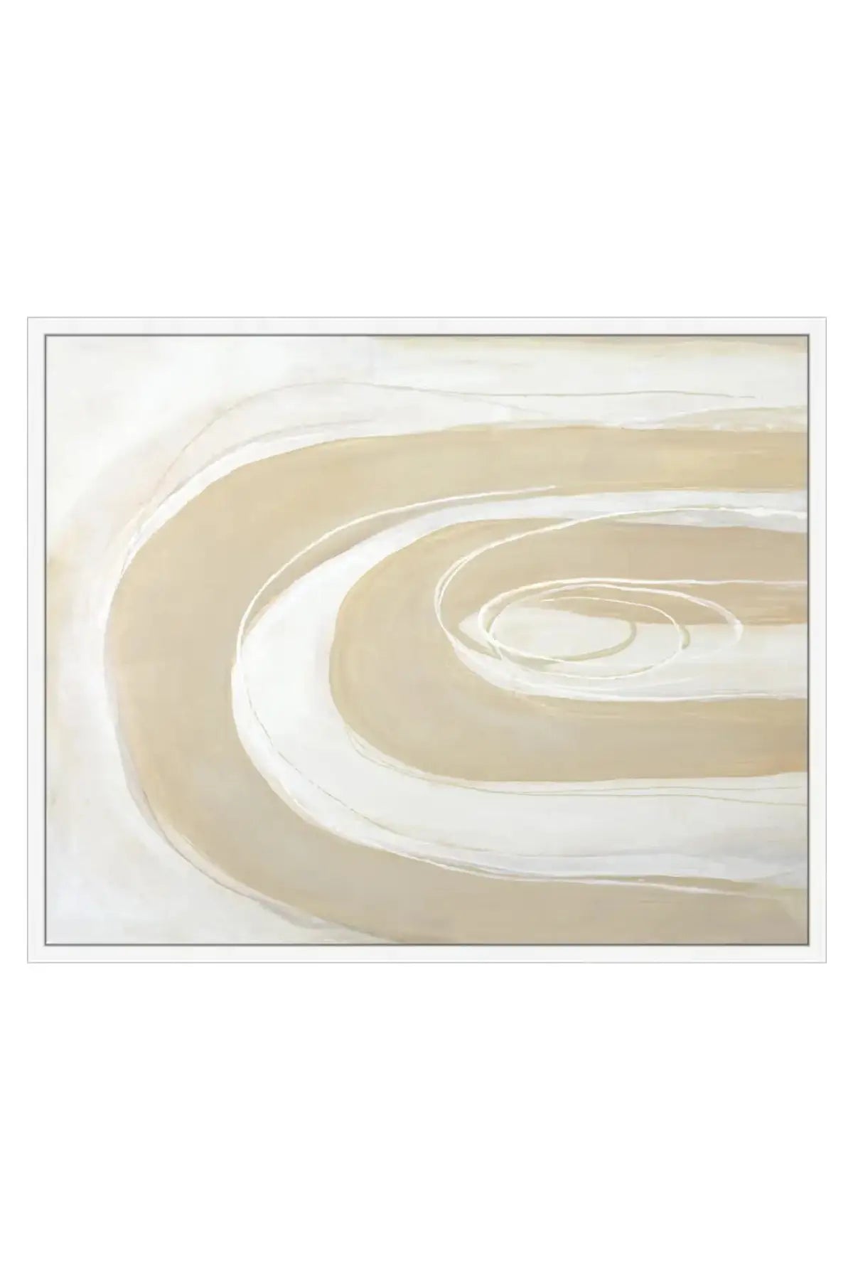 Meet the Bends 1 Wall Art. This artwork features soft, swirling beige and white forms, evoking a sense of calm and fluidity reminiscent of natural marble or desert sands. Printed as a fine art giclée on premium artist-grade canvas, ensuring exceptional color accuracy and detail for a gallery-quality piece. A gel finish is a hand-applied with brushstrokes that follow the contours of the original image, adding a subtle and authentic texture. Crafted from sustainable polystyrene, the floater frame creates a striking effect by suspending the artwork within the frame, adding depth and a touch of modern elegance. Professionally framed and ready to hang.