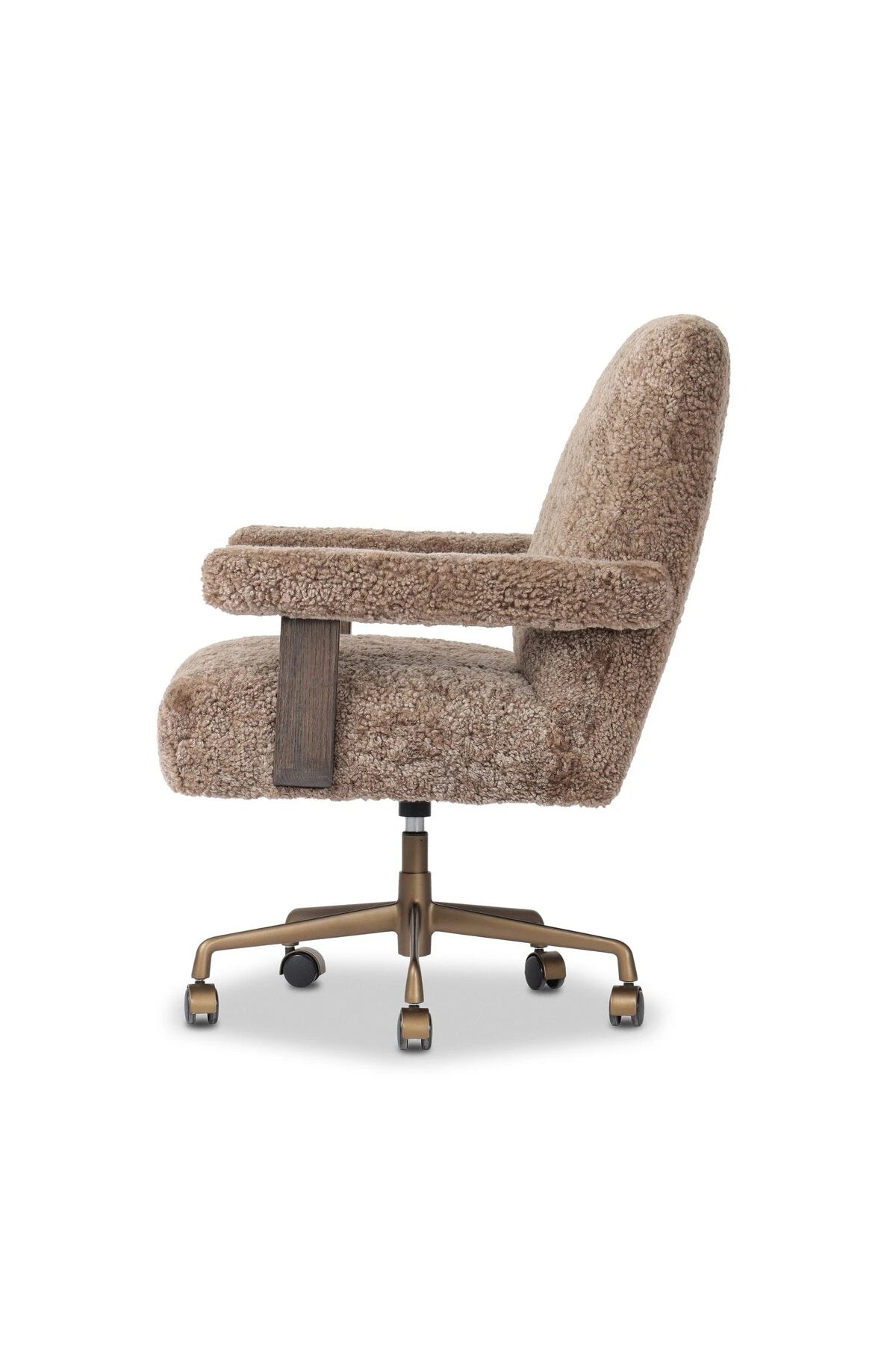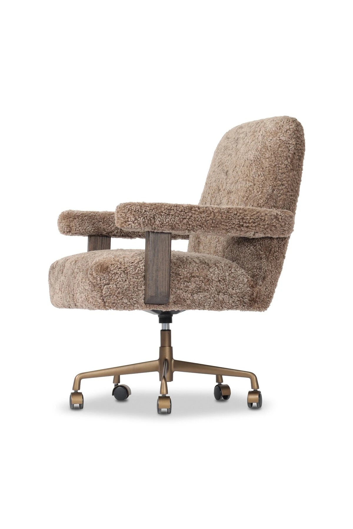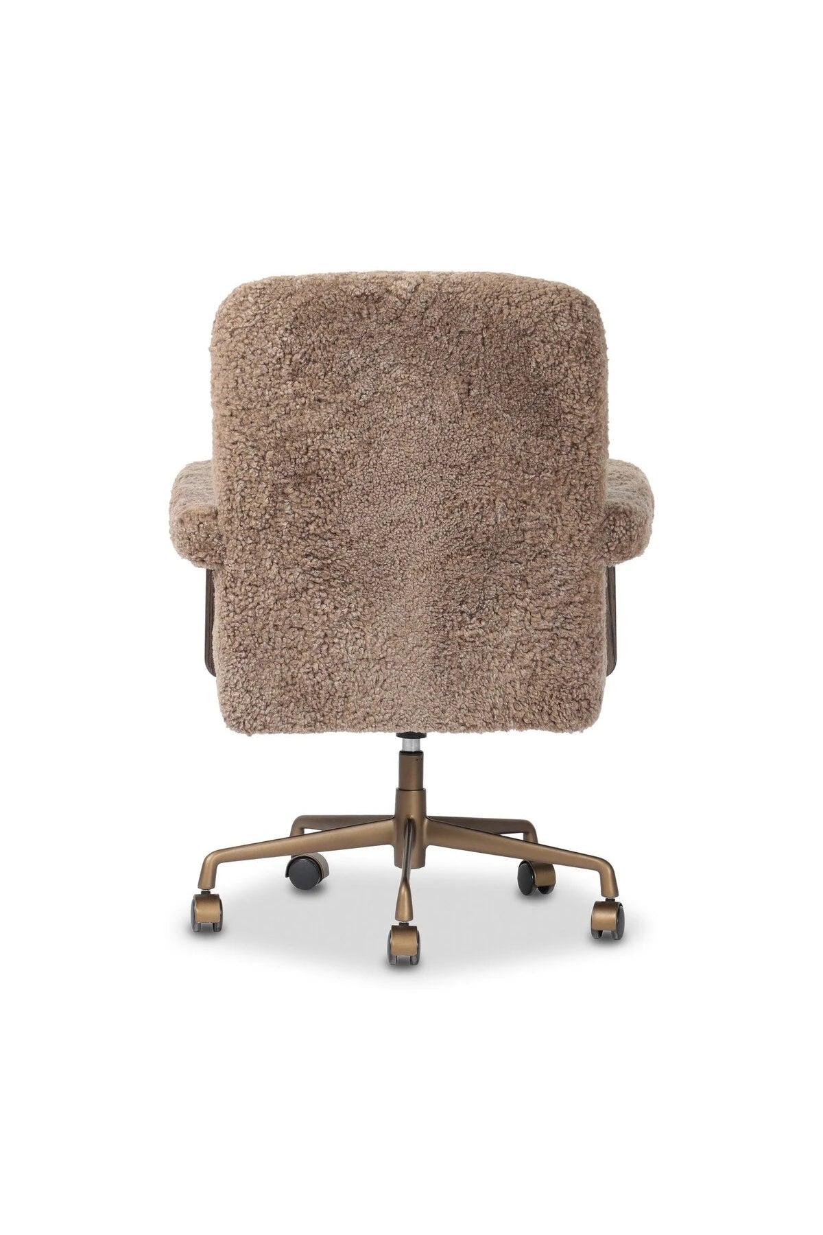 Meet the Bergen Desk Chair. A large, comfort-driven desk chair of taupe shearling tops a 360-degree swivel, for a luxurious take on office styling.