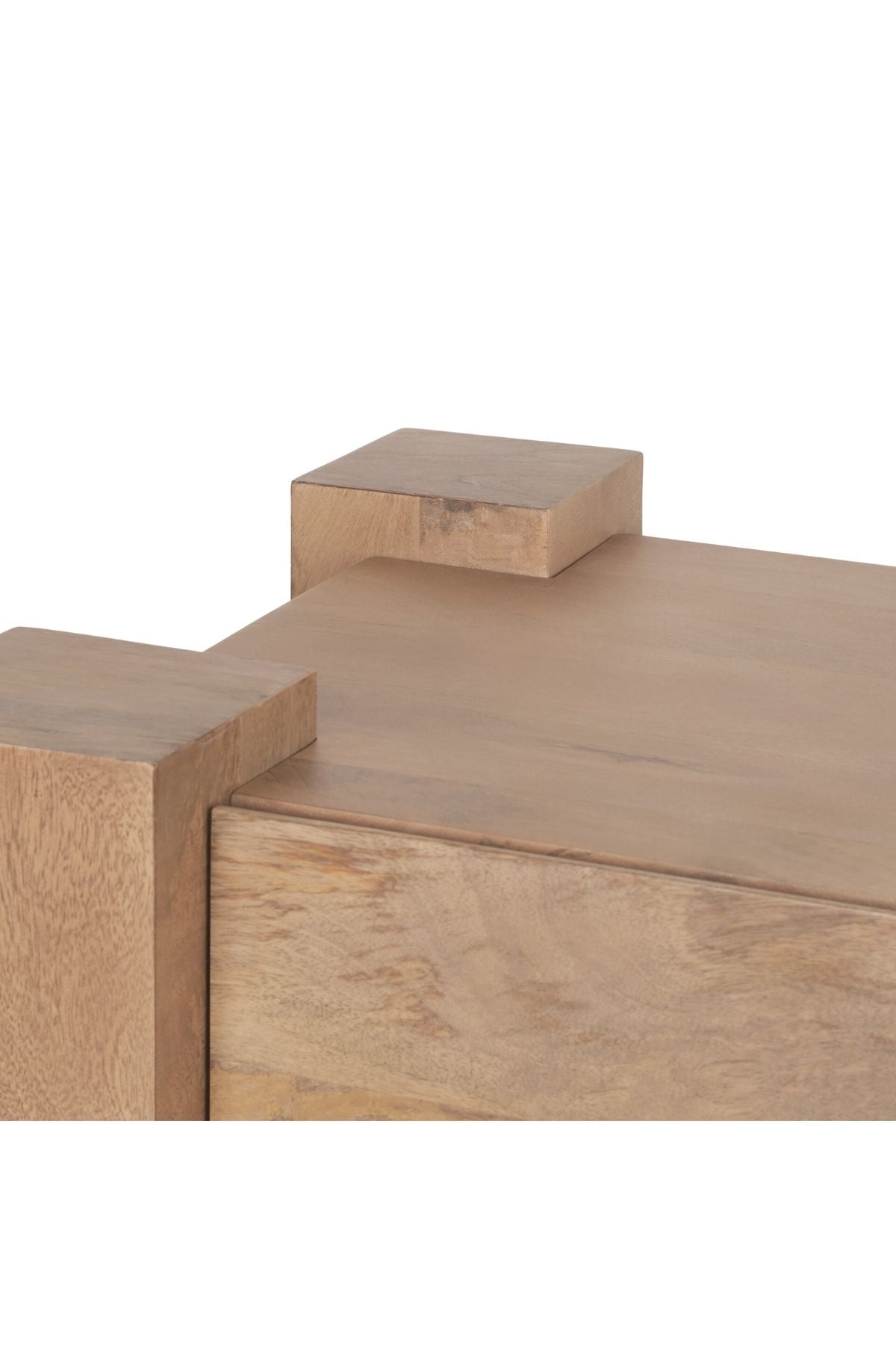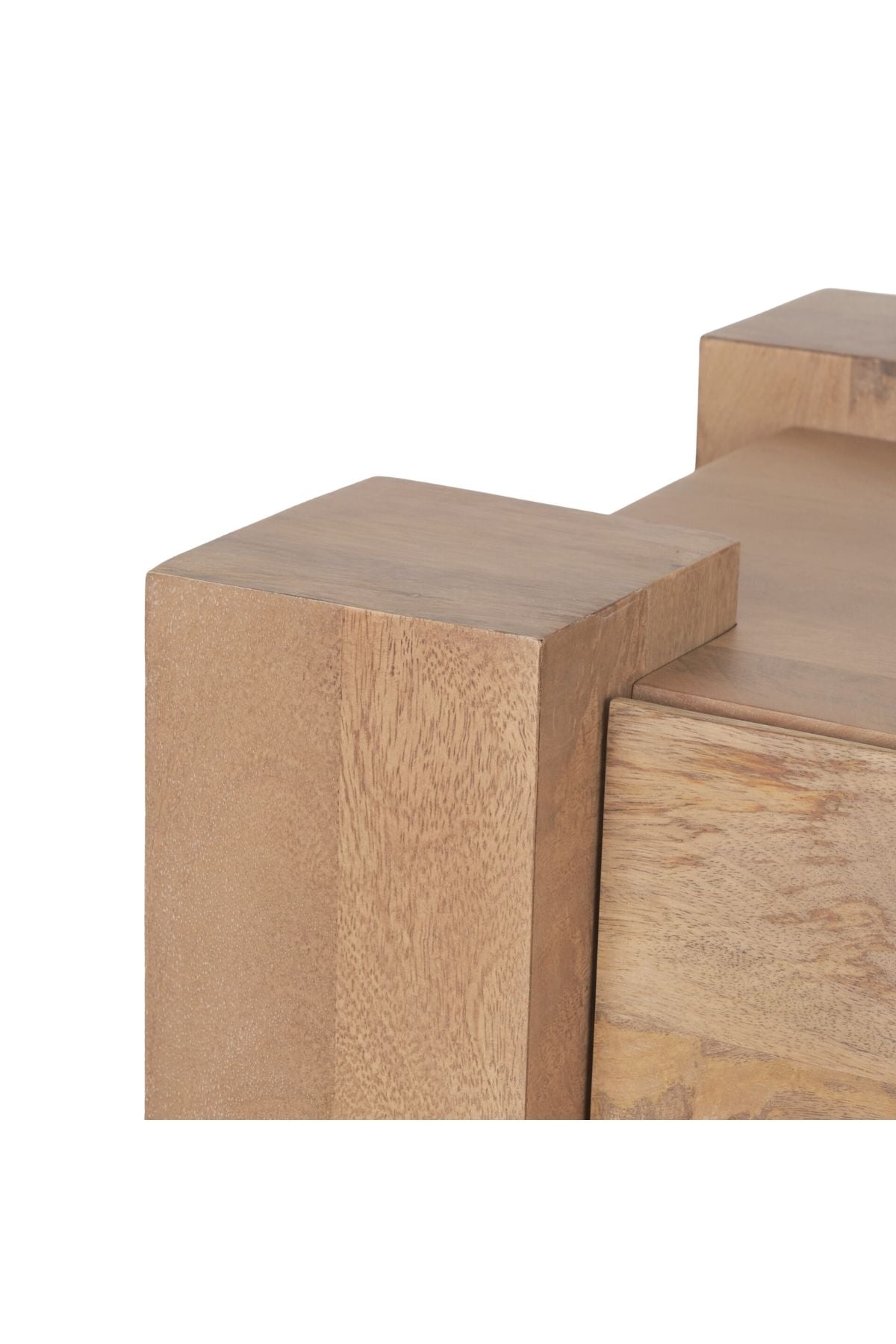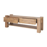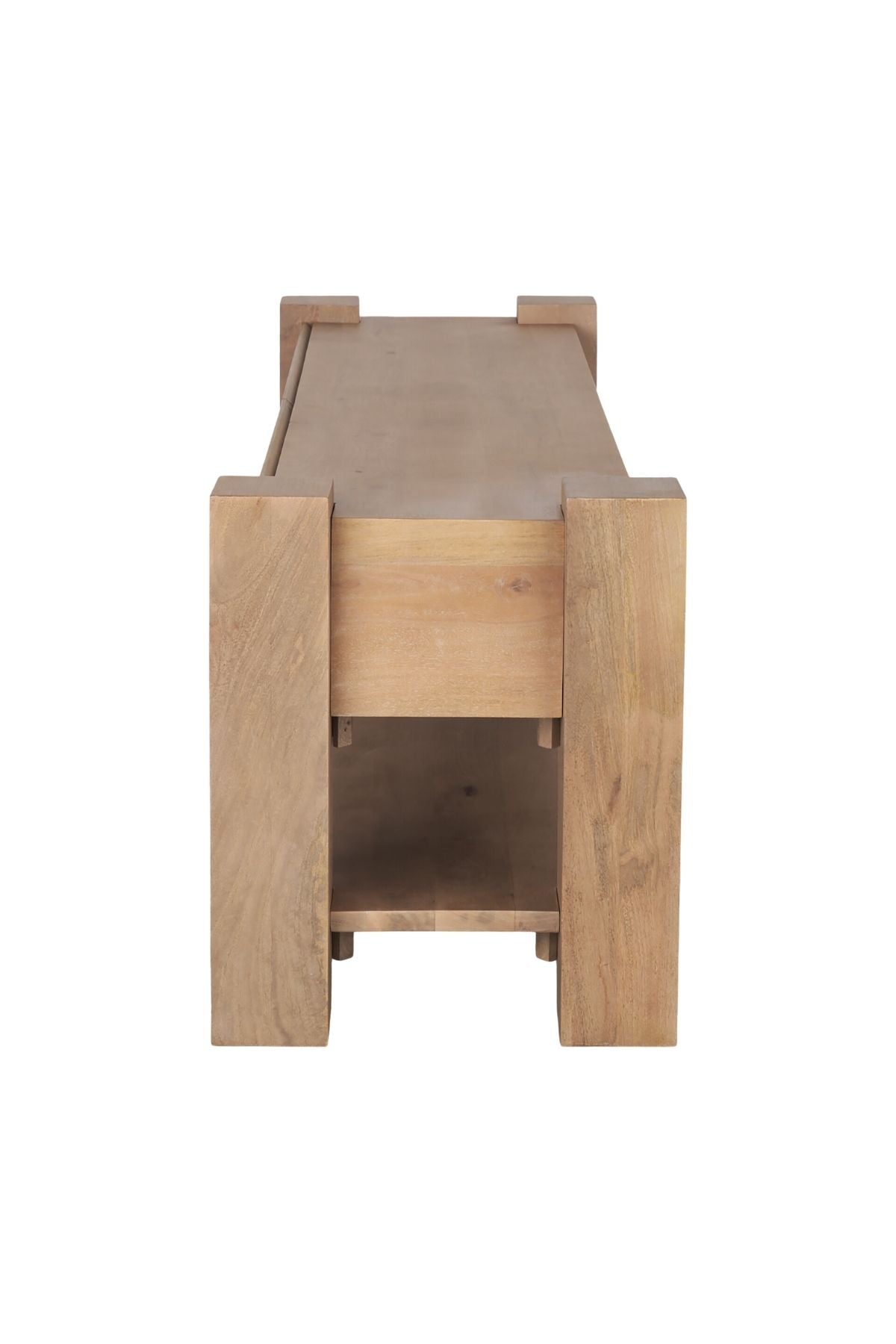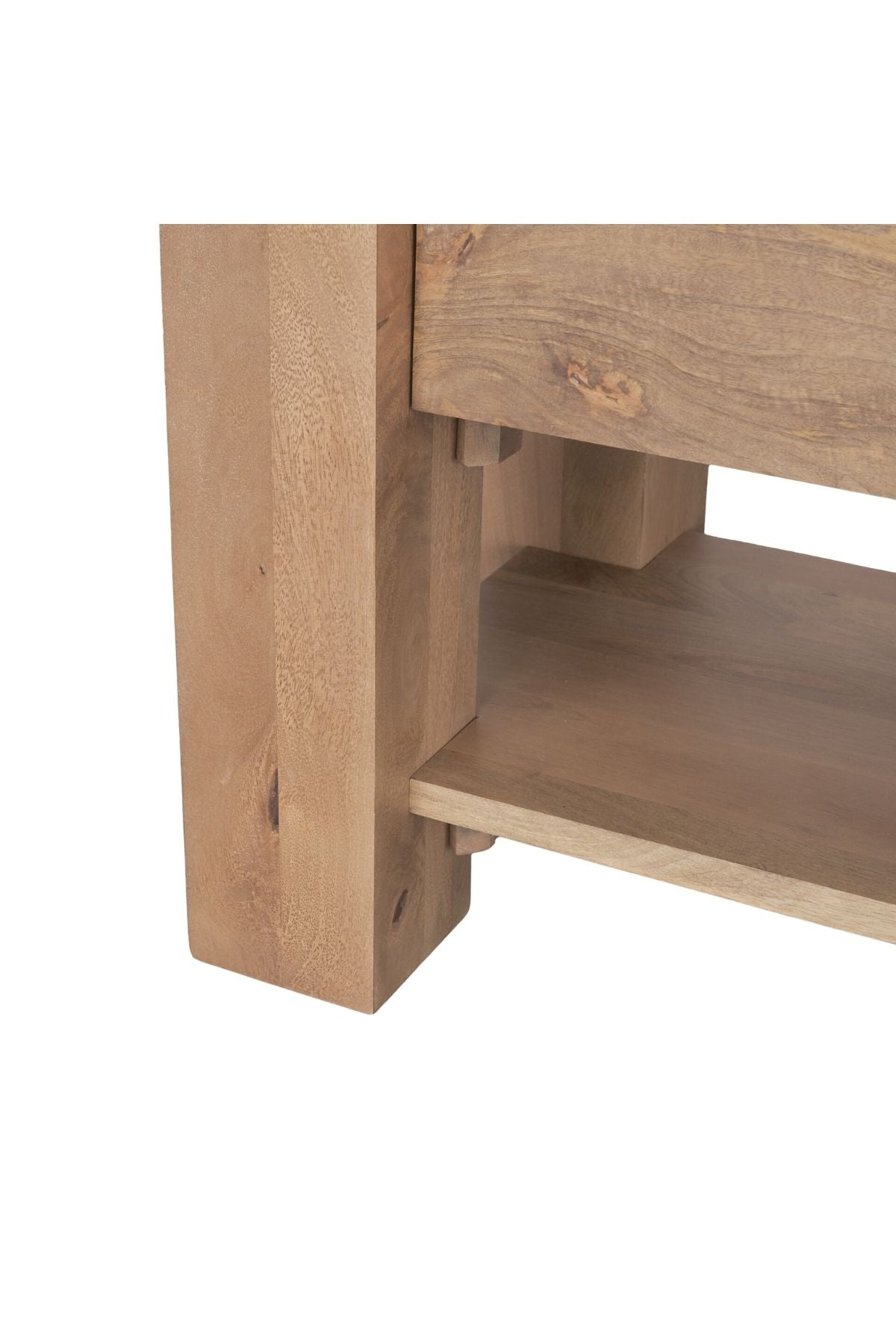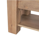 Meet the Beth Media Console. Skillfully constructed from solid mango wood, enriched with a gentle light brown stain, and complemented by subtle white pickling. This intricate finish not only accentuates the natural wood grain but also imparts a touch of refinement, balancing the accent table's substantial and enduring design.