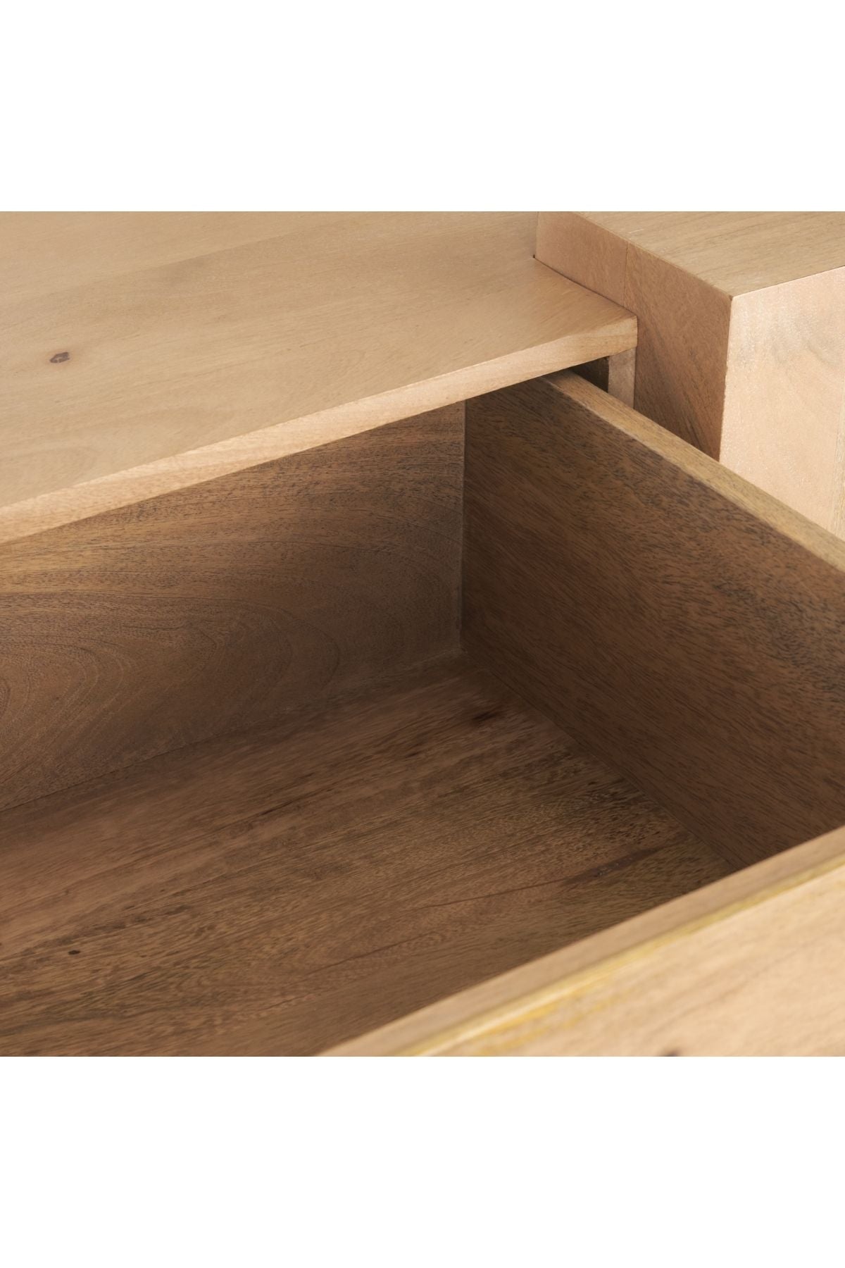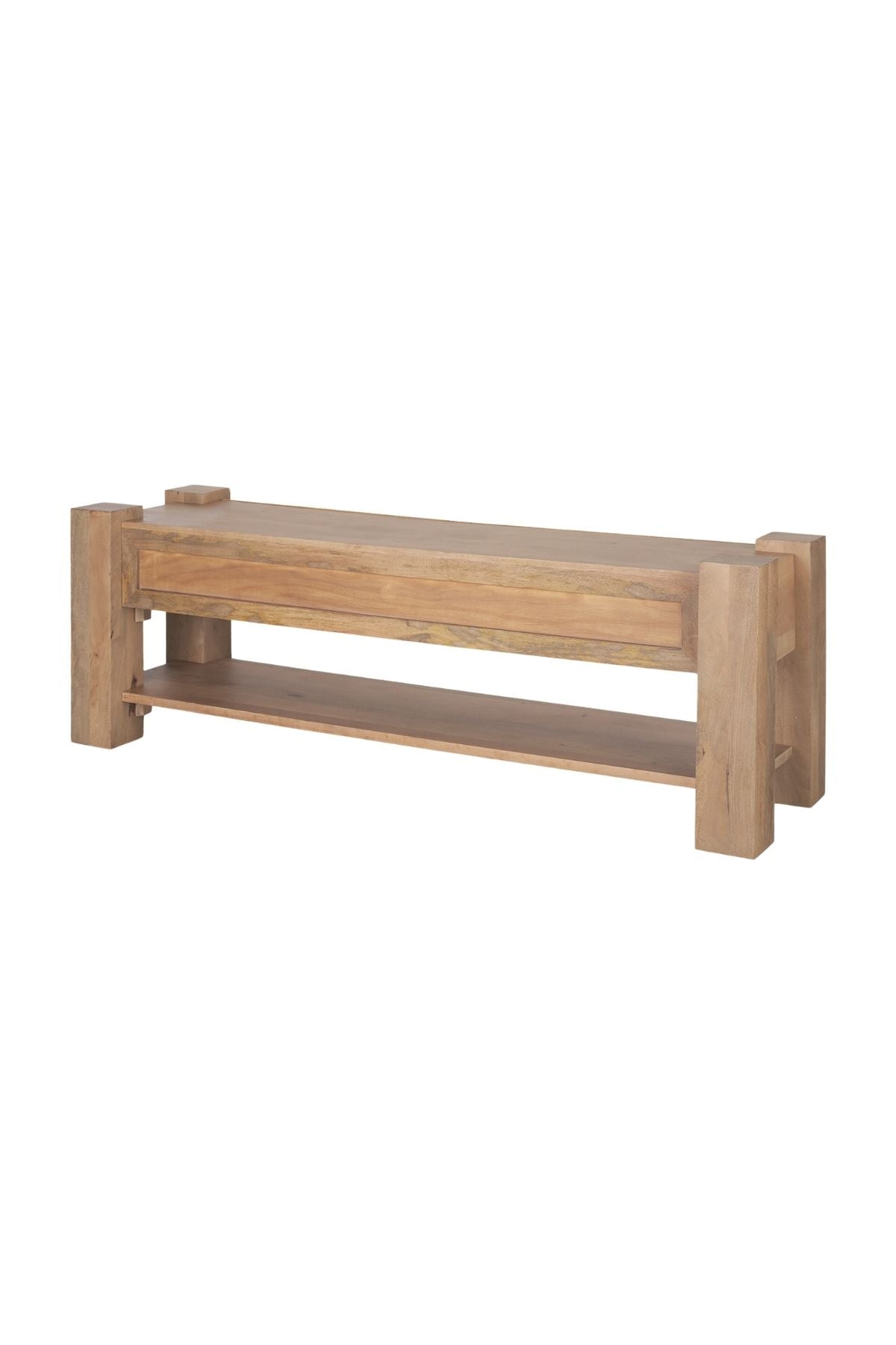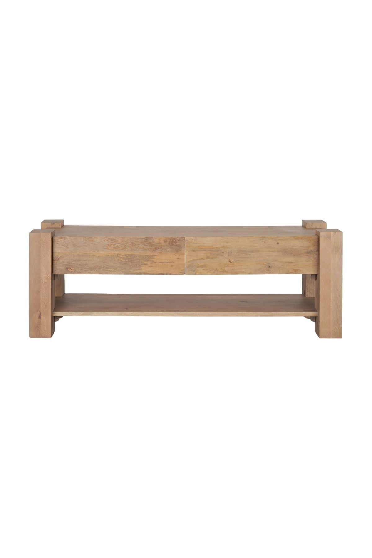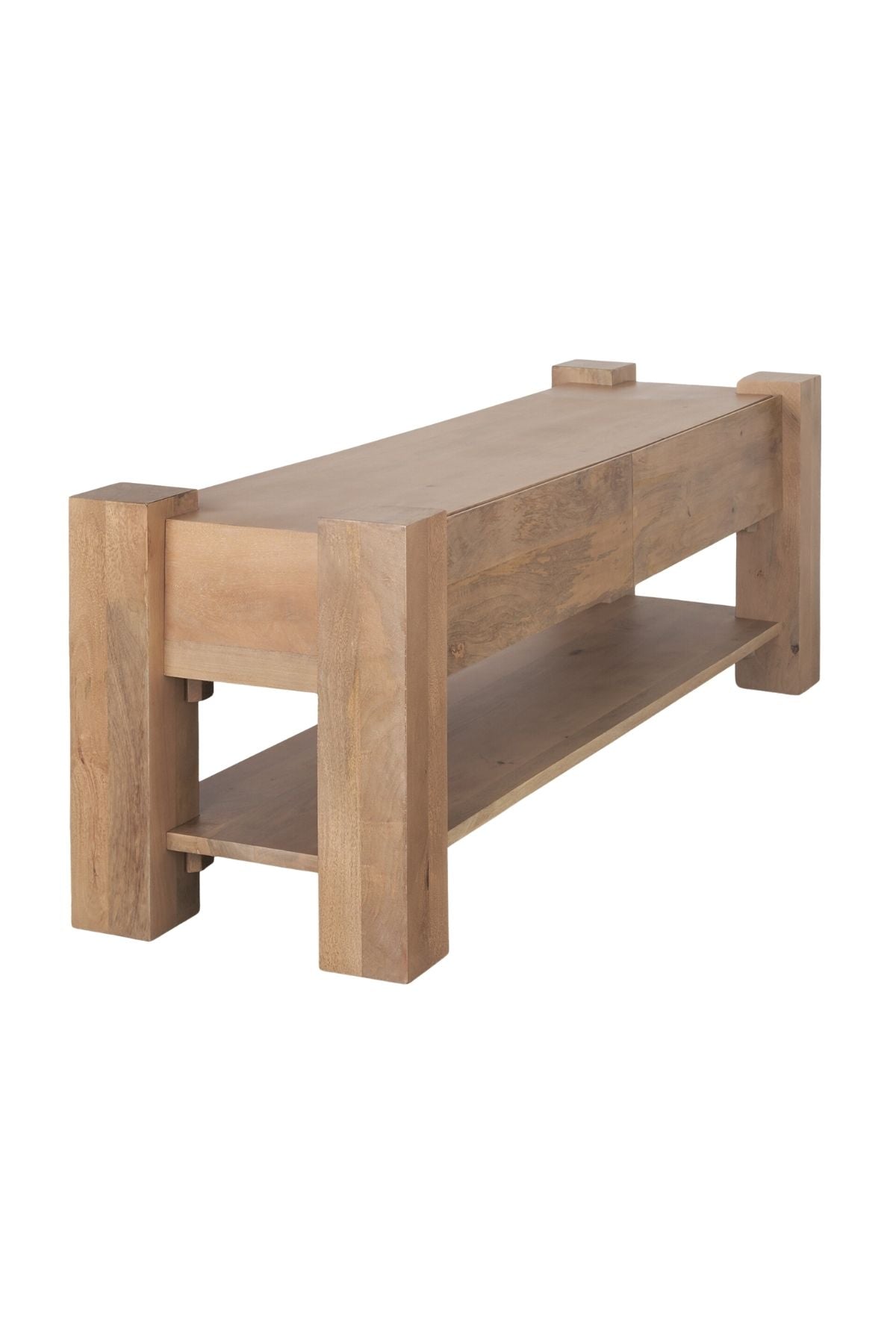 Meet the Beth Media Console. Skillfully constructed from solid mango wood, enriched with a gentle light brown stain, and complemented by subtle white pickling. This intricate finish not only accentuates the natural wood grain but also imparts a touch of refinement, balancing the accent table's substantial and enduring design.