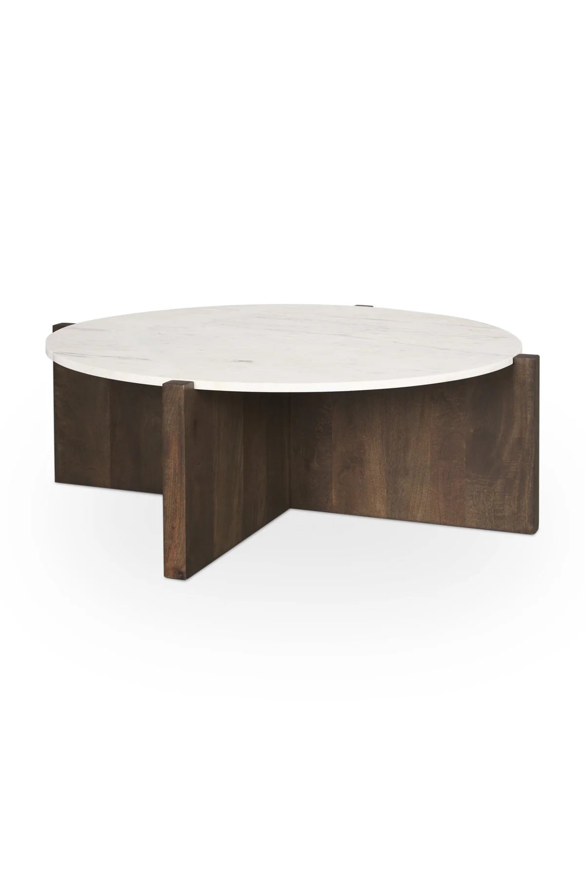 Meet the Bianca Coffee Table. A combination of exquisite materials and craftsmanship to create a sophisticated focal point for any living space. Its white, solid round Banswara marble tabletop boasts distinctive gray and mauve veining, adding a touch of natural elegance.