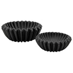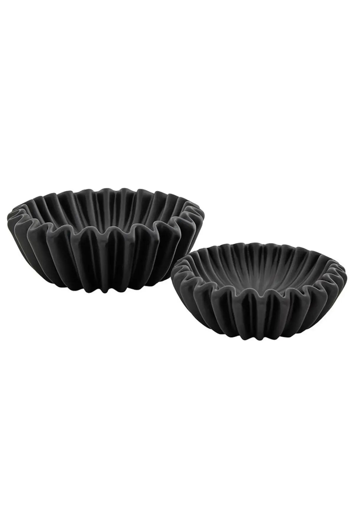 Meet the Lehriya Bowls. Discover the perfect blend of contemporary elegance and intricate craftsmanship with our Black Porcelain Lehriya Bowls. This set of two features a striking ruffle texture on a sleek black porcelain surface, offering a unique touch to any table setting or decor.