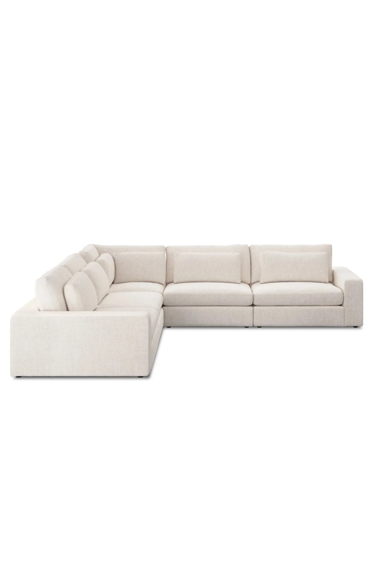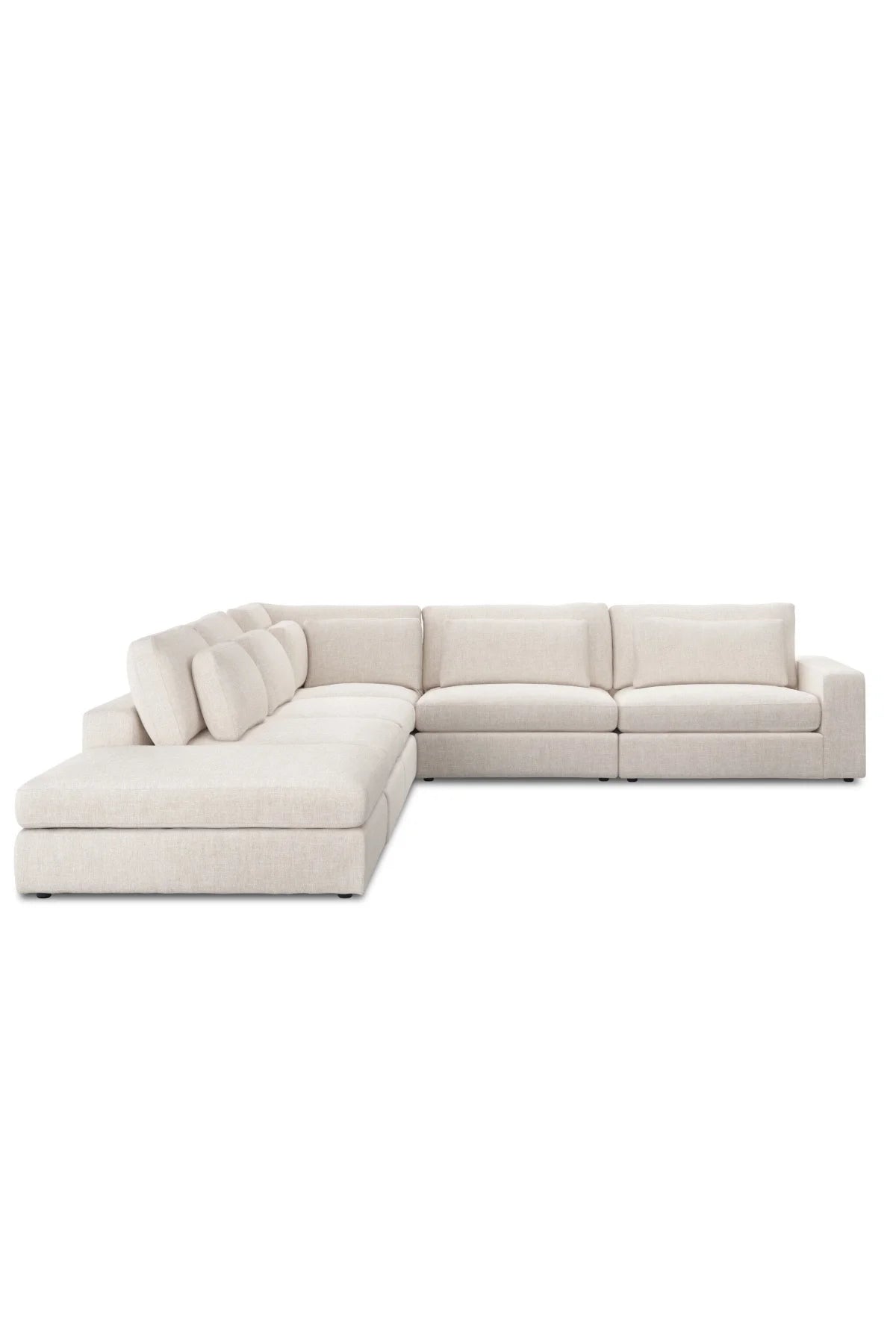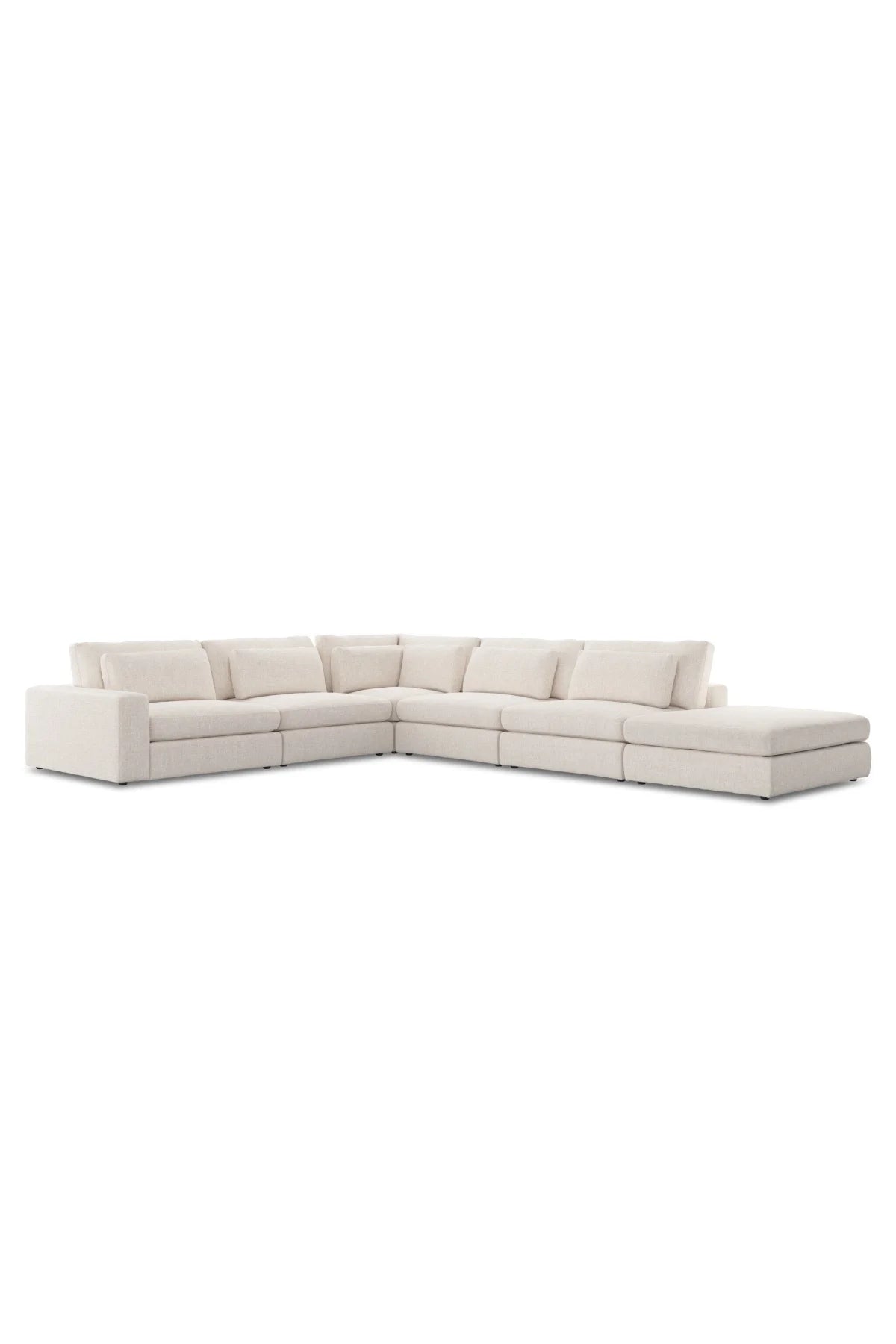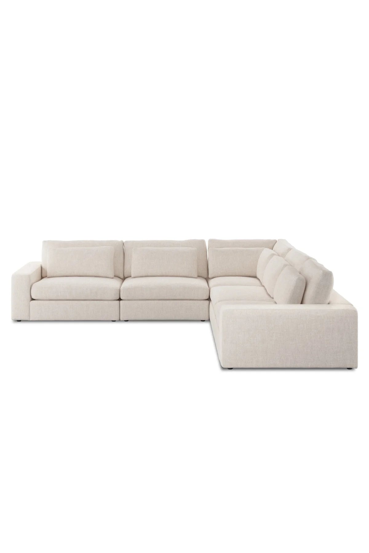 Meet the Bloor 5-Piece Sectional. Deep, low seating says relax. A flexible, one-armed chair is covered in an inviting, durable light grey woven fabric. Modular components allow the perfect combination for any space.