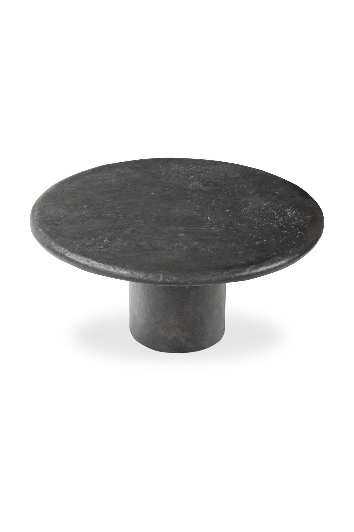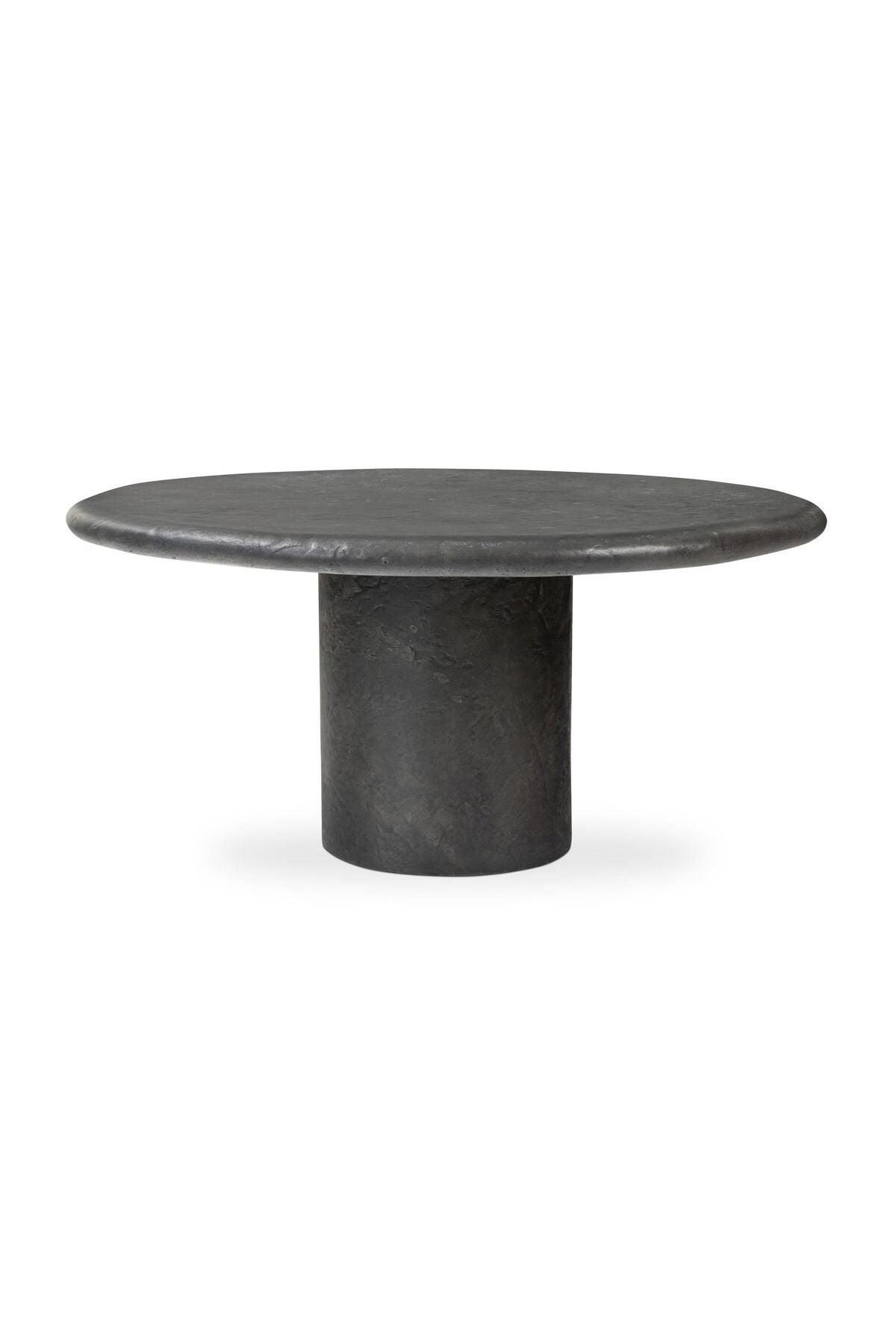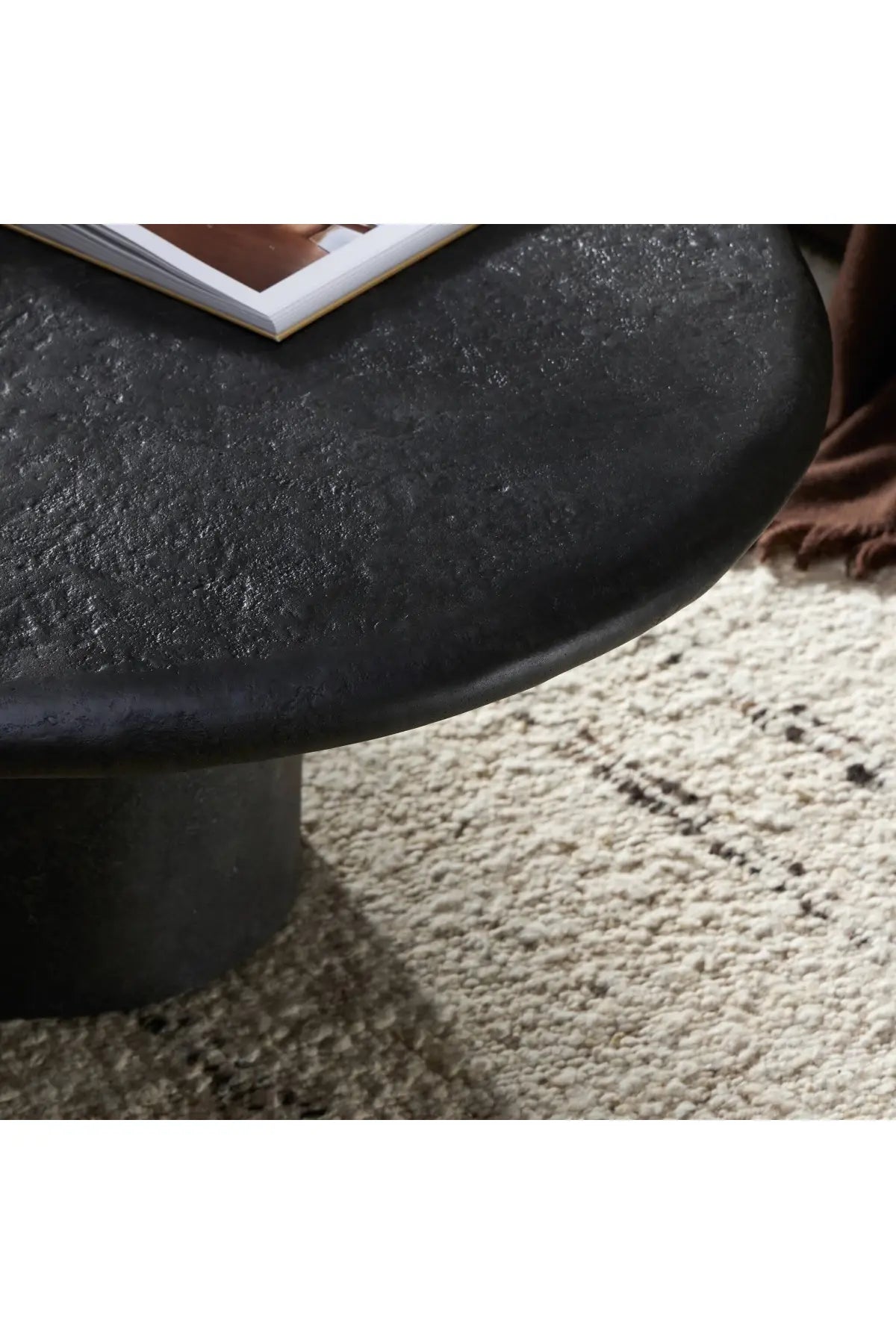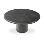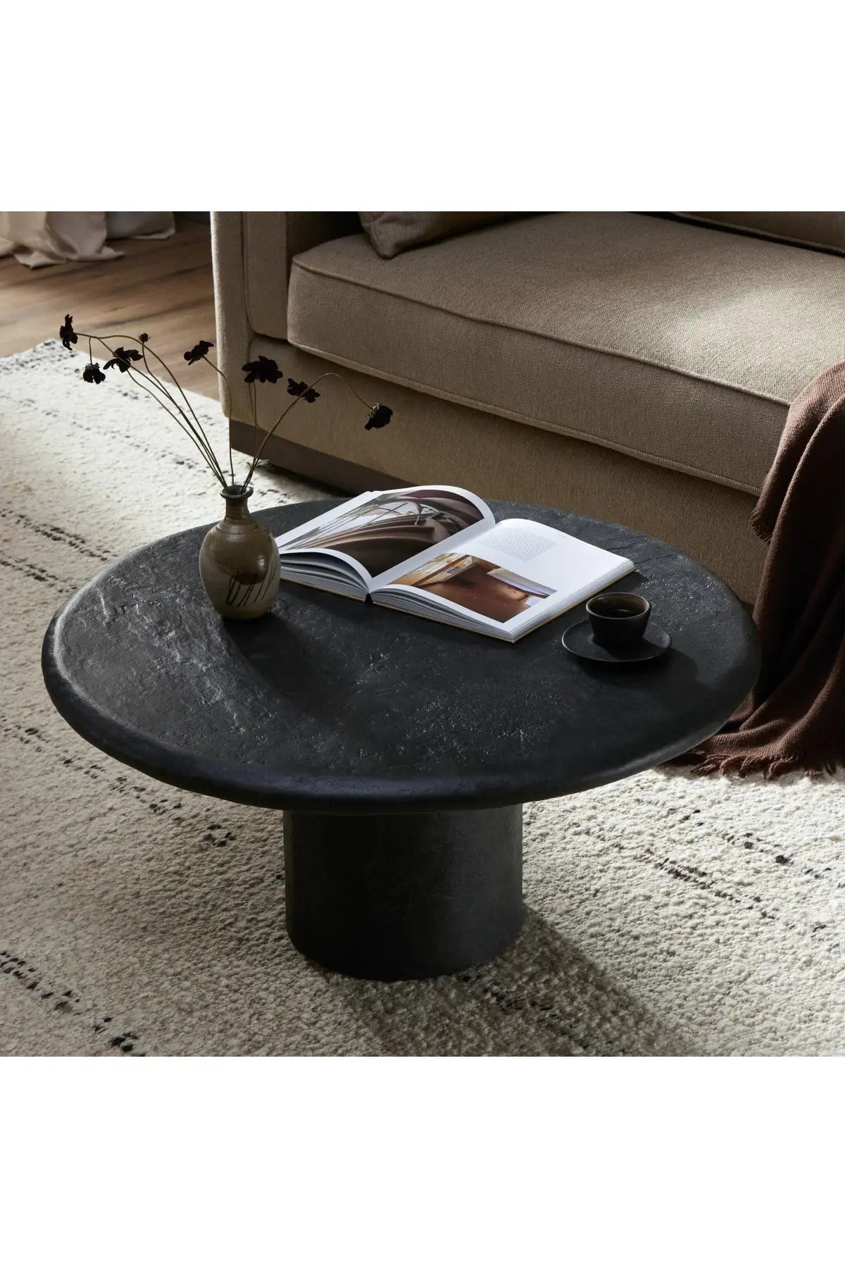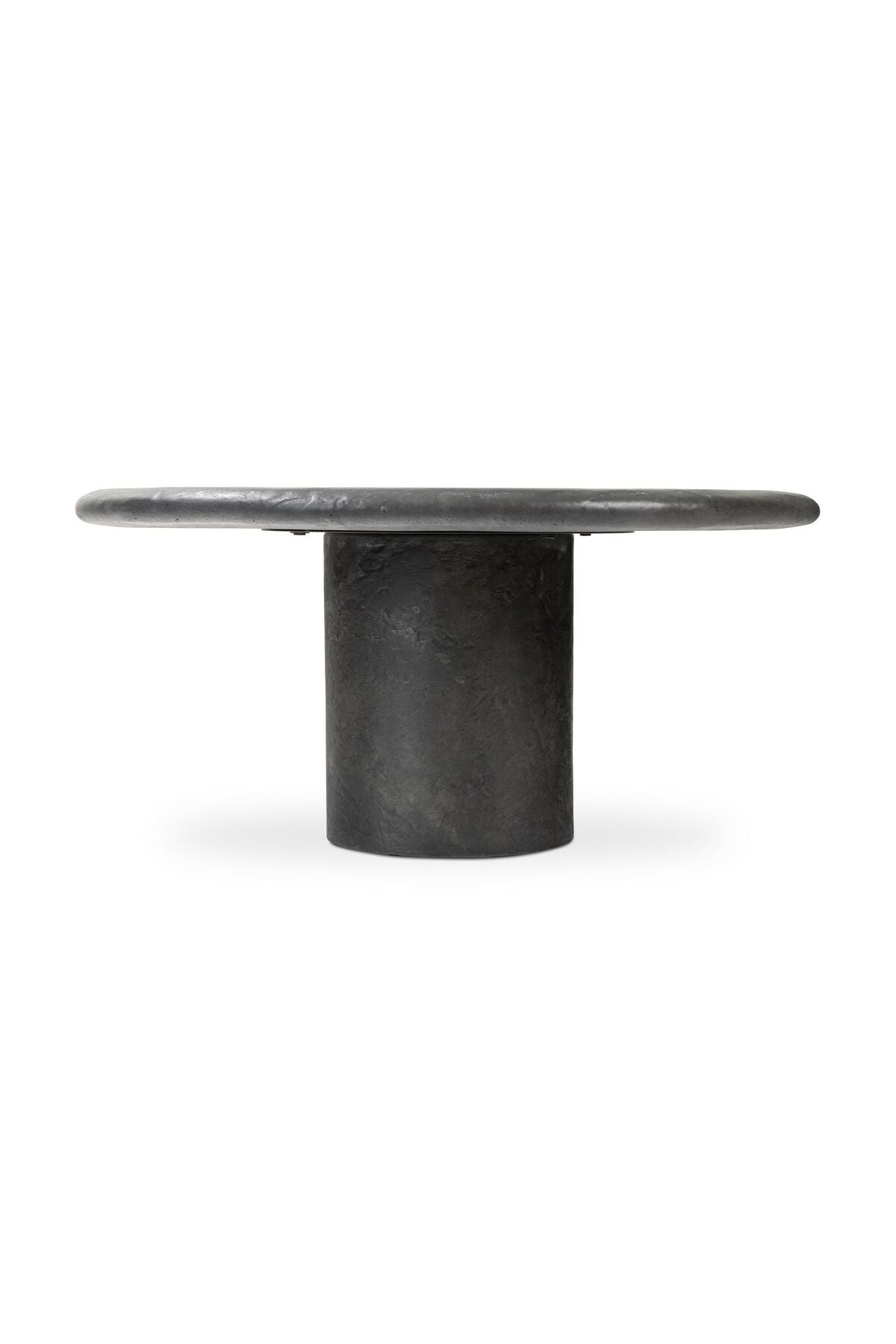 Meet the Bonnie Coffee Table. A cylindrical pedestal base delivers a touch of softness to a a heavily textured tabletop of slate-like concrete.