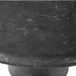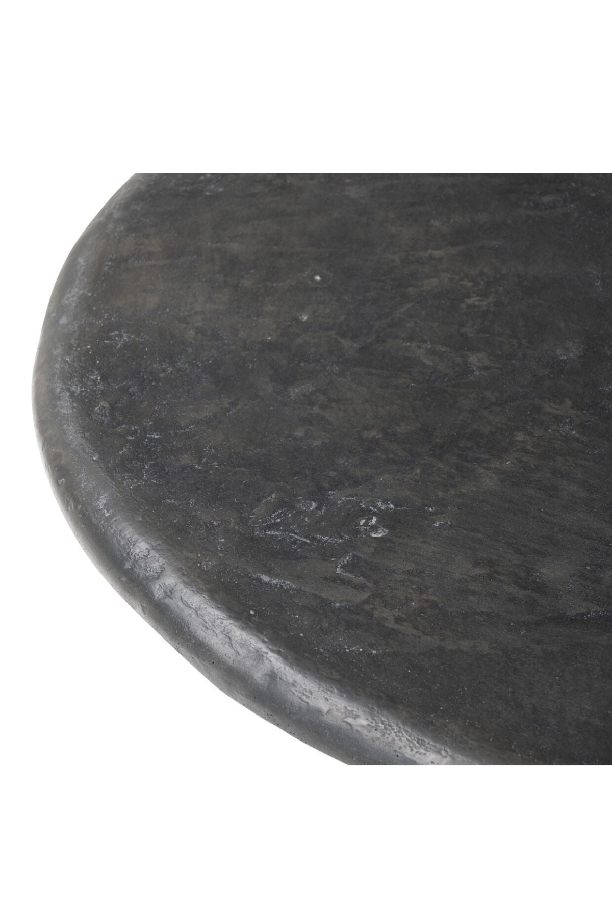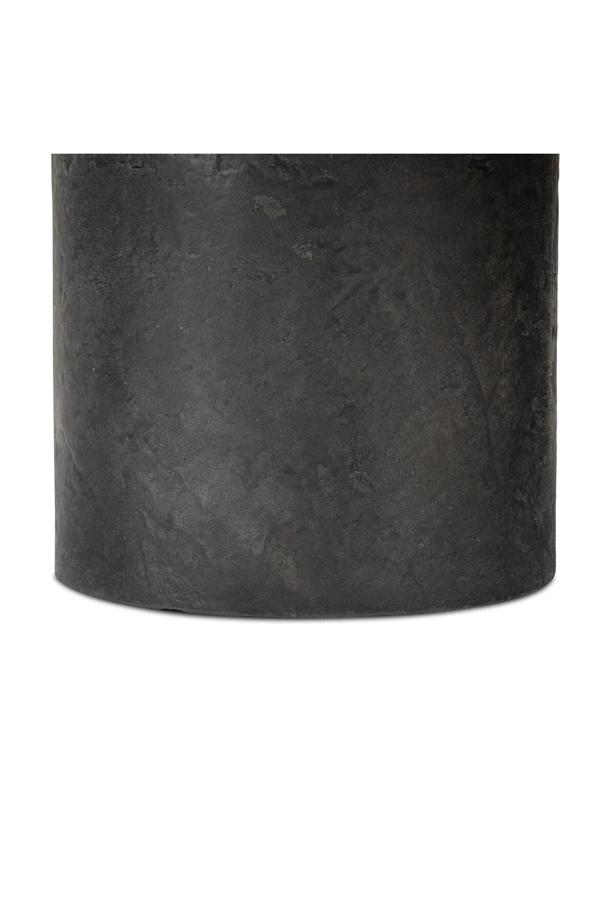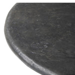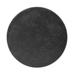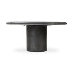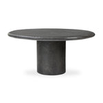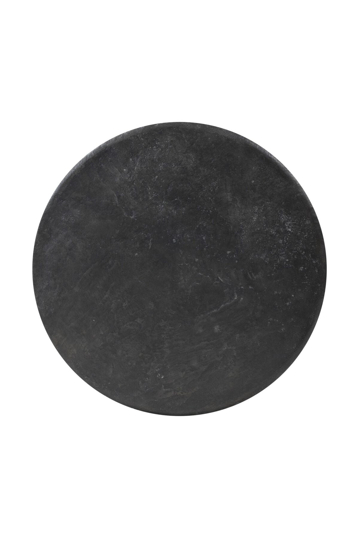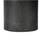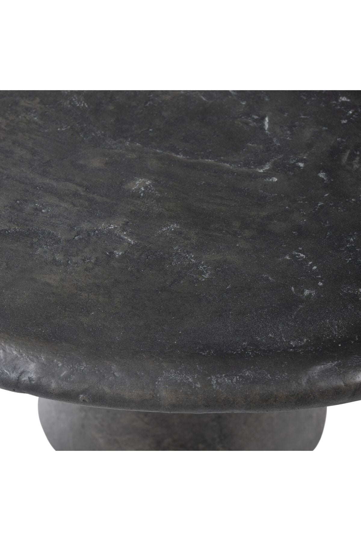 Meet the Bonnie Coffee Table. A cylindrical pedestal base delivers a touch of softness to a a heavily textured tabletop of slate-like concrete.
