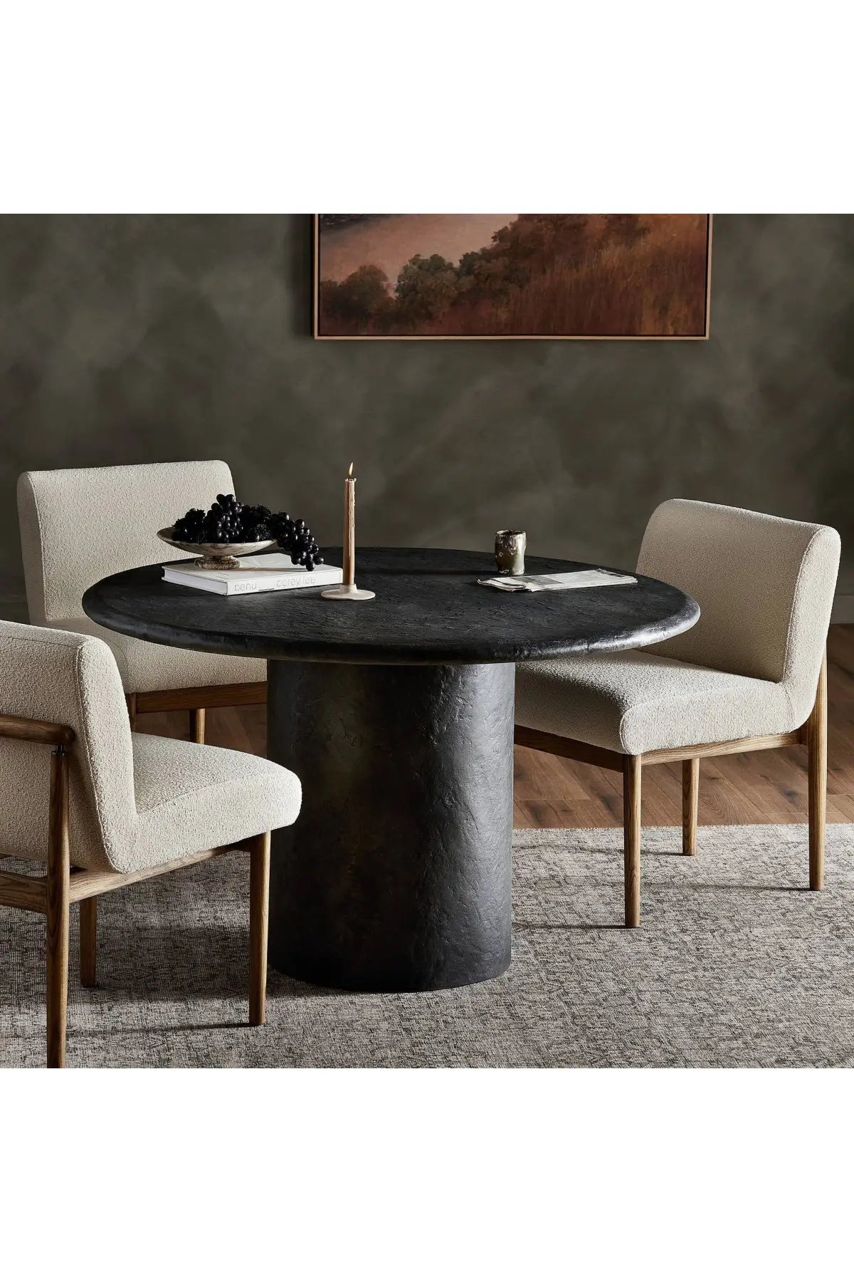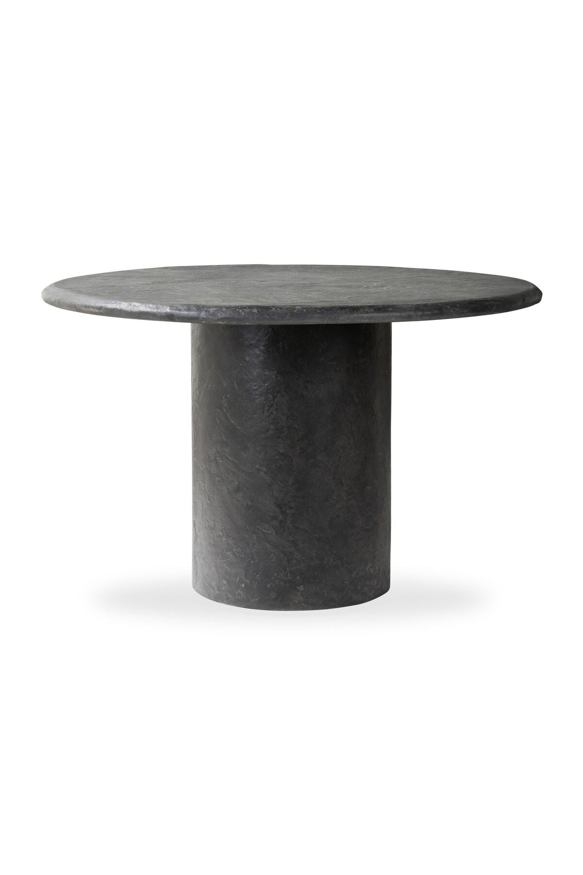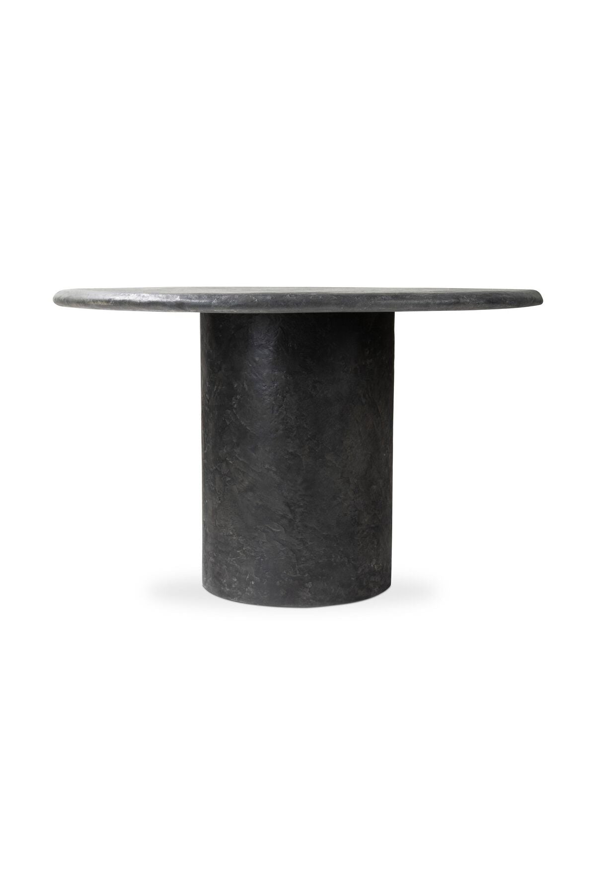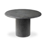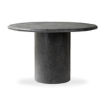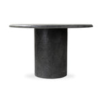 Meet the Bonnie Dining Table. Made from textured black concrete, for a sculptural showstopper. A cylinder pedestal base and thick tabletop keep this design sleek and simple. At 48 inches, it's perfect for a bistro or hall table.