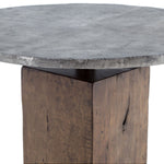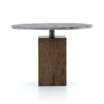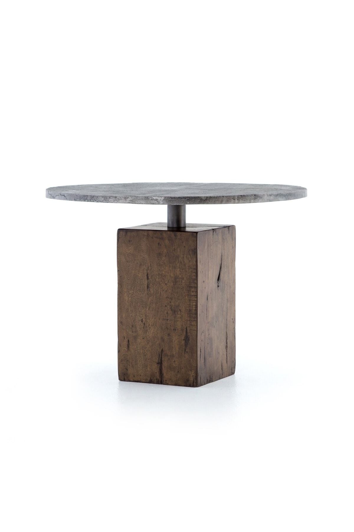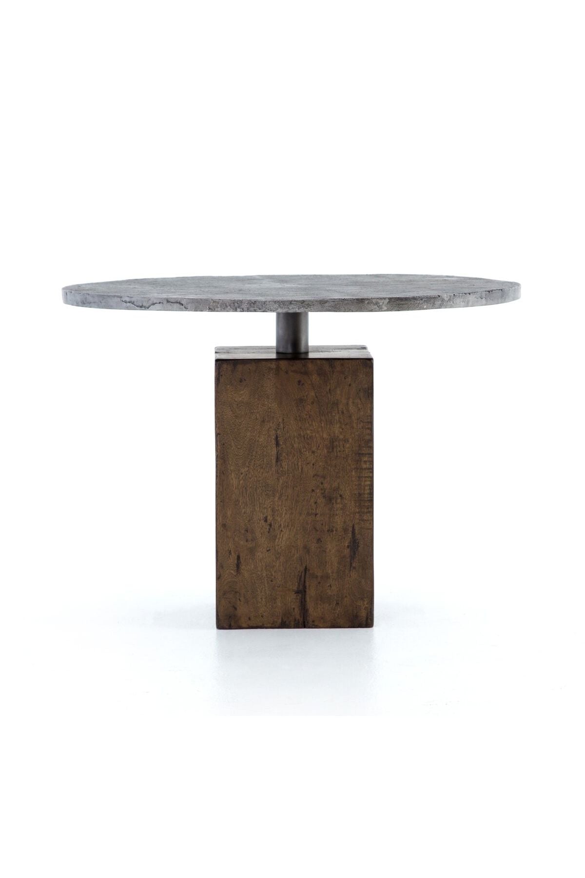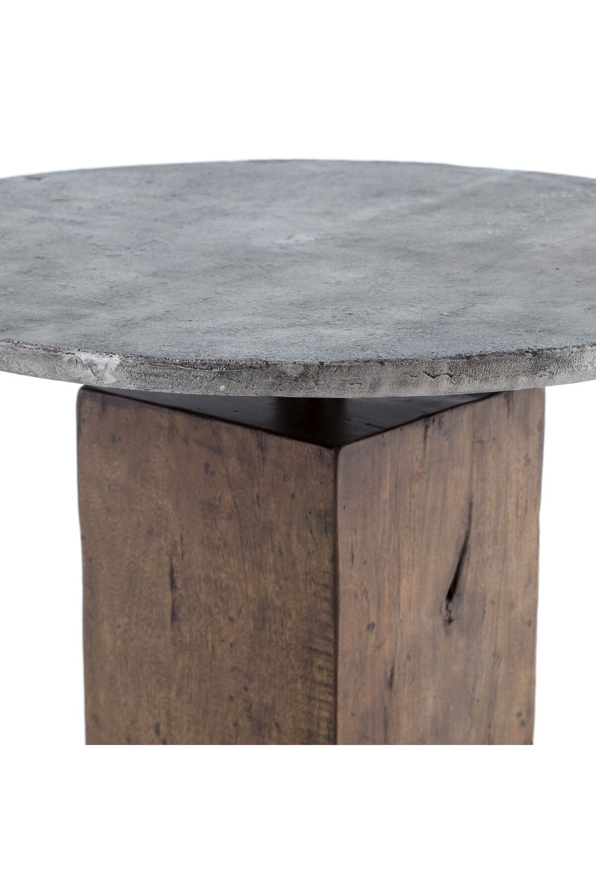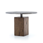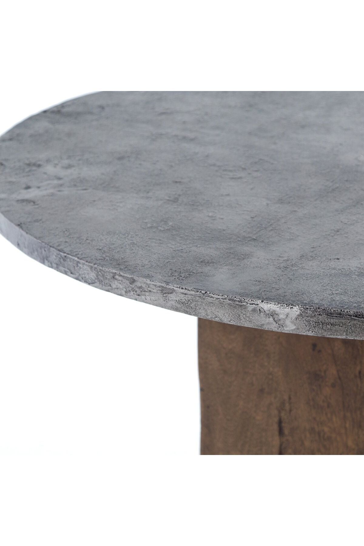Shape and texture blend for instantaneous impact with the Boomer Bistro Table. A rectangular slab of weathered reclaimed woods provide a solid base to offset a slender aluminum neck before dramatically brimming into a round tabletop. Light gunmetal finish reveals industrial texture and metallic edge.