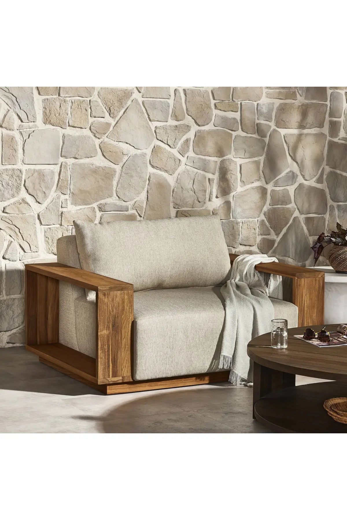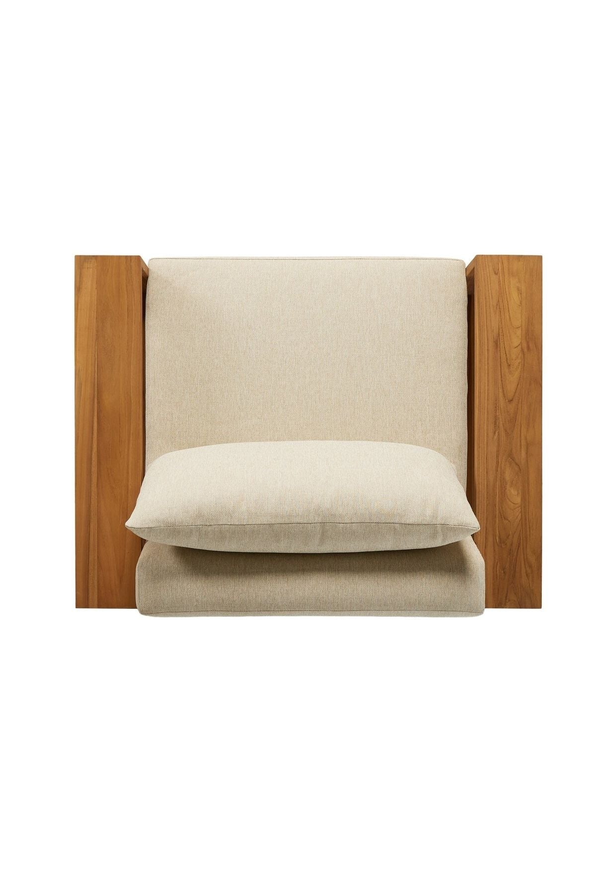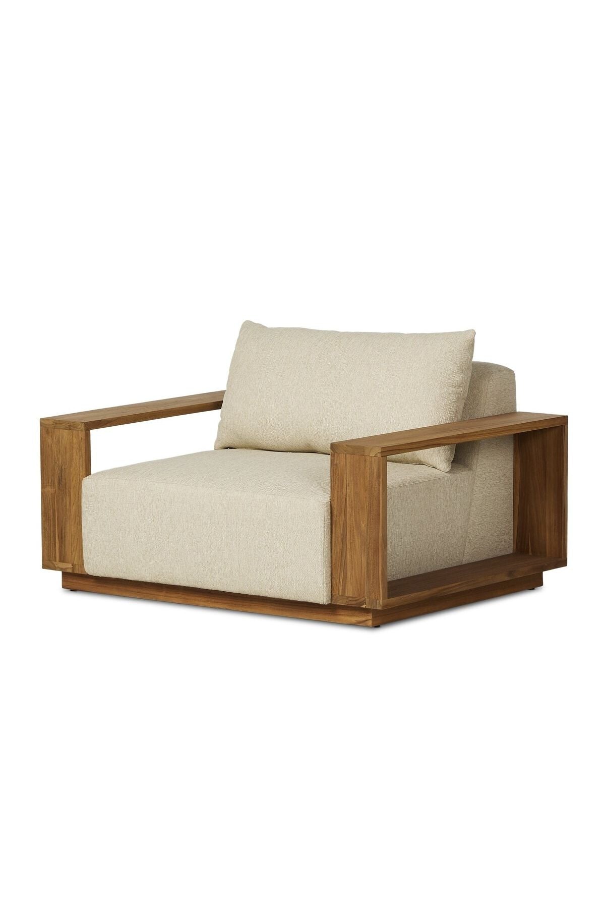 The Branford Outdoor Chair is grand scale sophistication. This wide format outdoor chair features heavy teak framing and upholstery with an inviting sit. Cover or store indoors during inclement weather and when not in use.