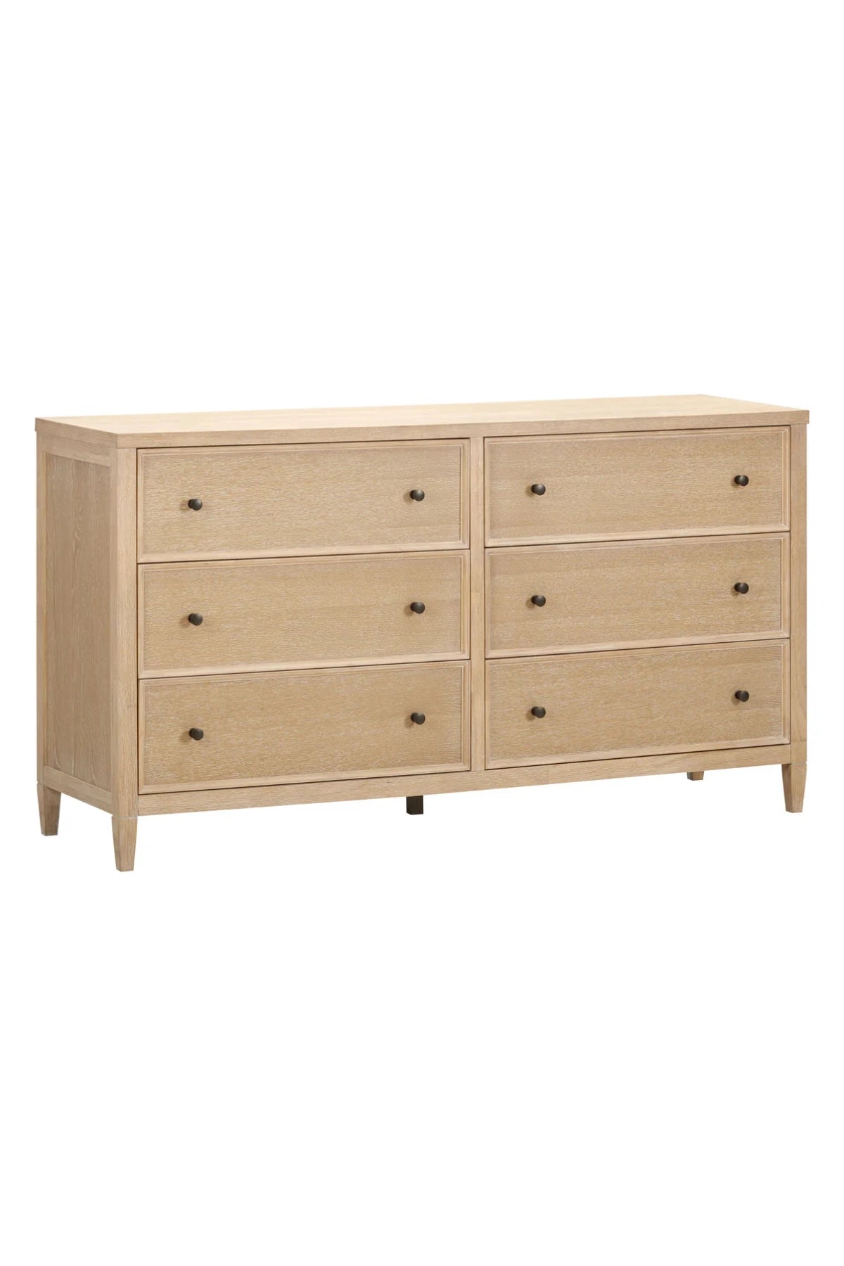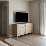 The Bristol Park 6-Drawer Dresser offers timeless design and ample storage for your bedroom. Finished in natural oak, this dresser showcases a warm and inviting aesthetic that complements any decor. With six spacious soft-closing drawers, it ensures smooth, quiet operation while providing generous space to organize your wardrobe and essentials. Accented with aged bronze hardware, it combines elegant craftsmanship with practical functionality, making it a versatile and stylish addition to your home.