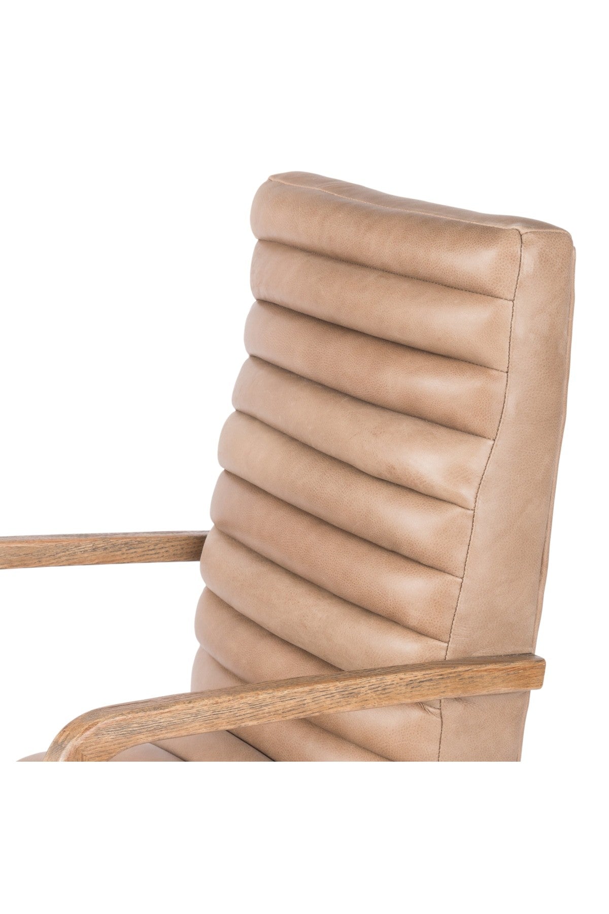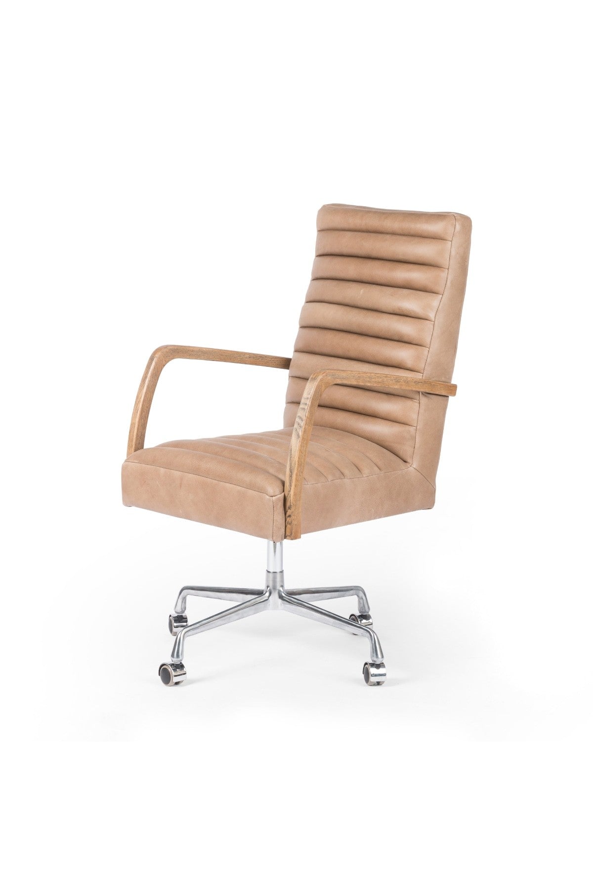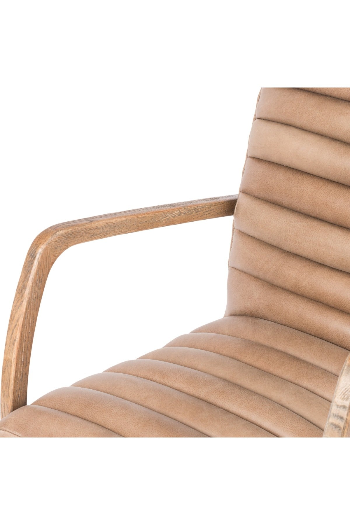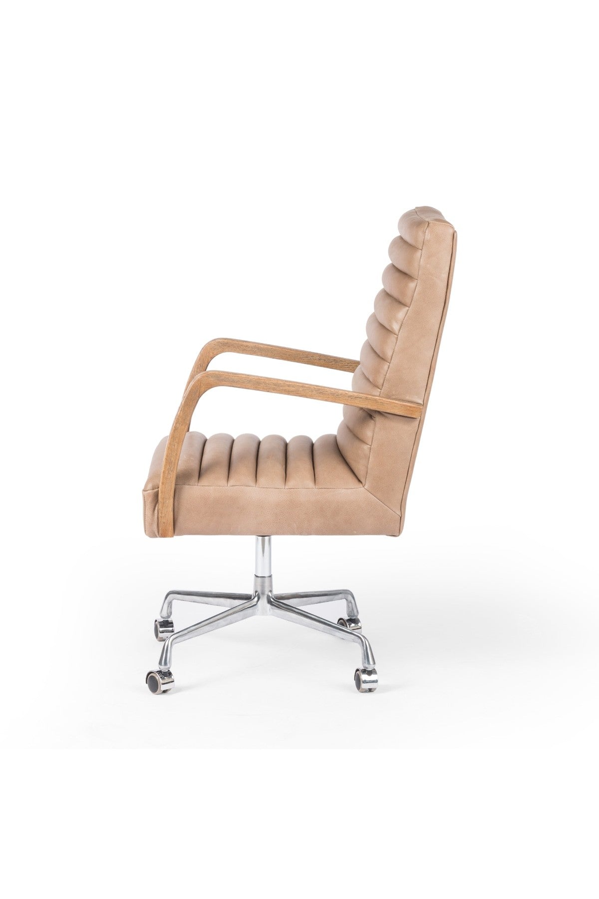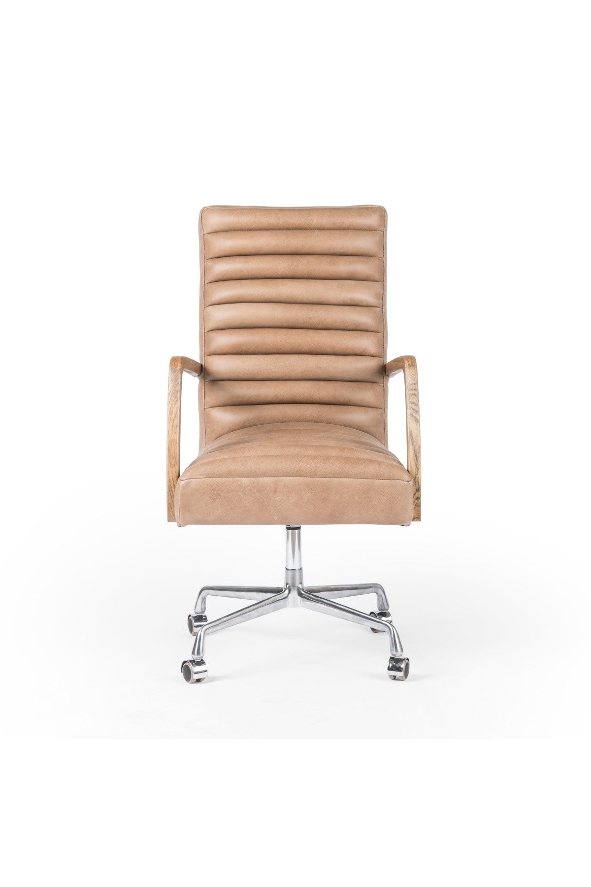 The Bryson Channeled Desk Chair is high style. Light tan top-grain leather covers a sculpted seat and back, with elegantly arched arms of solid oak. Stainless steel casters make for ease in the modern workplace. Height not adjustable.