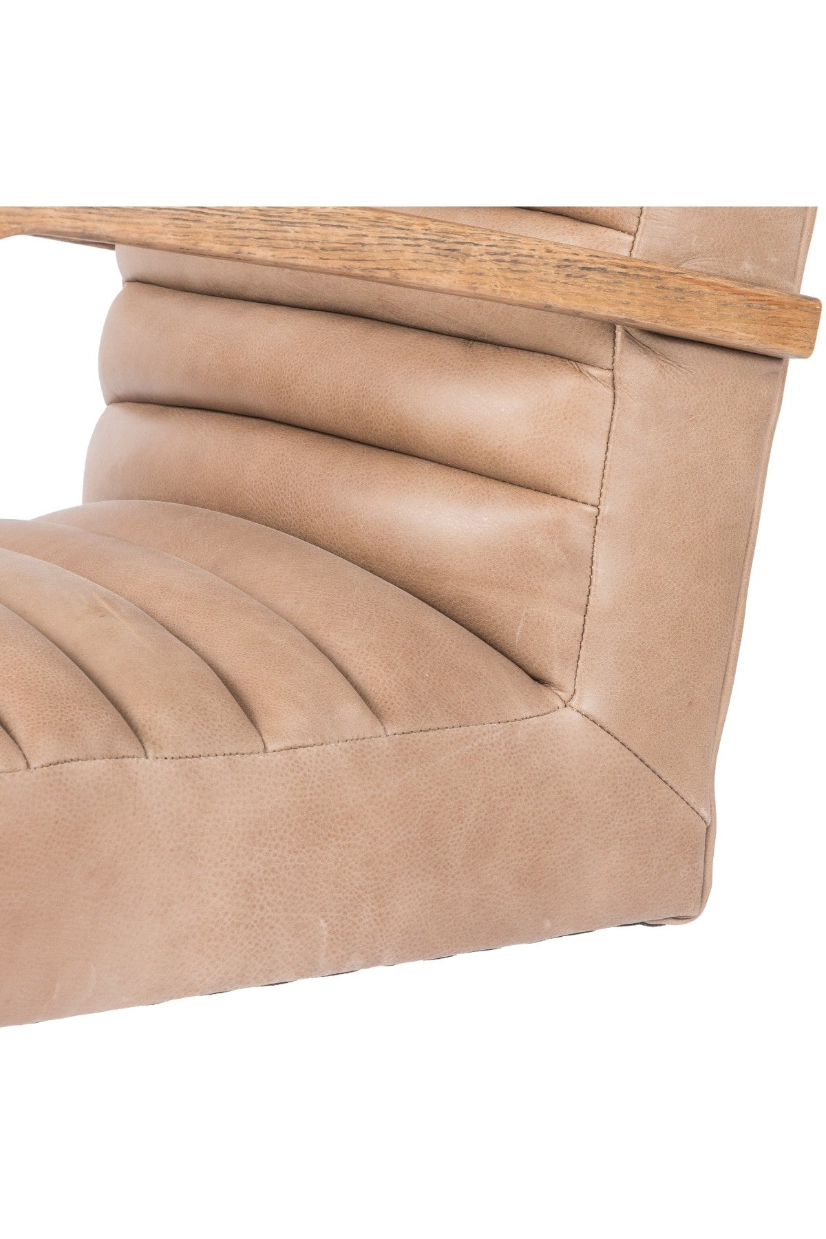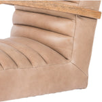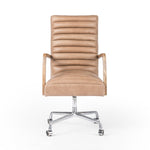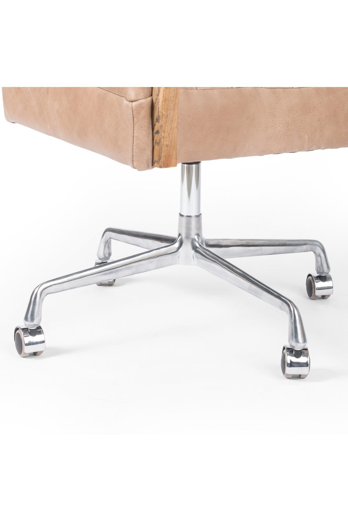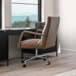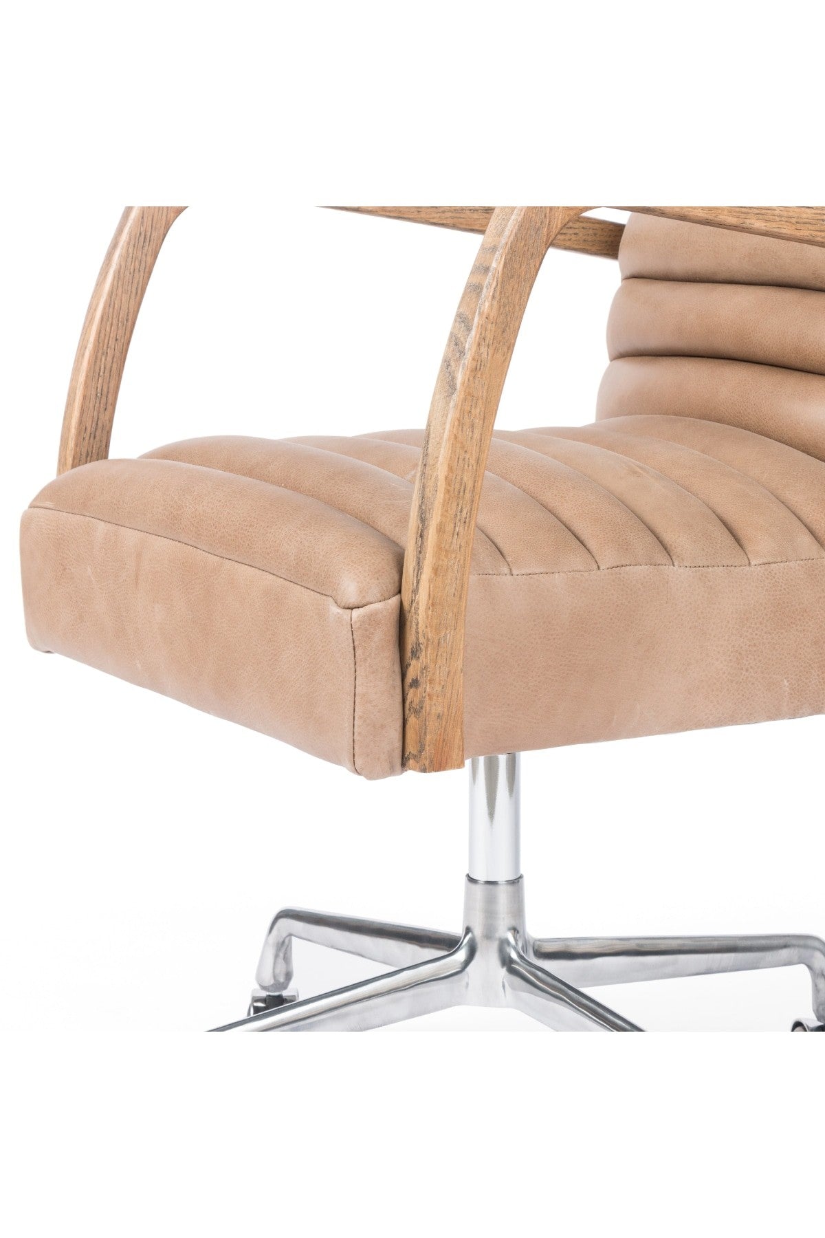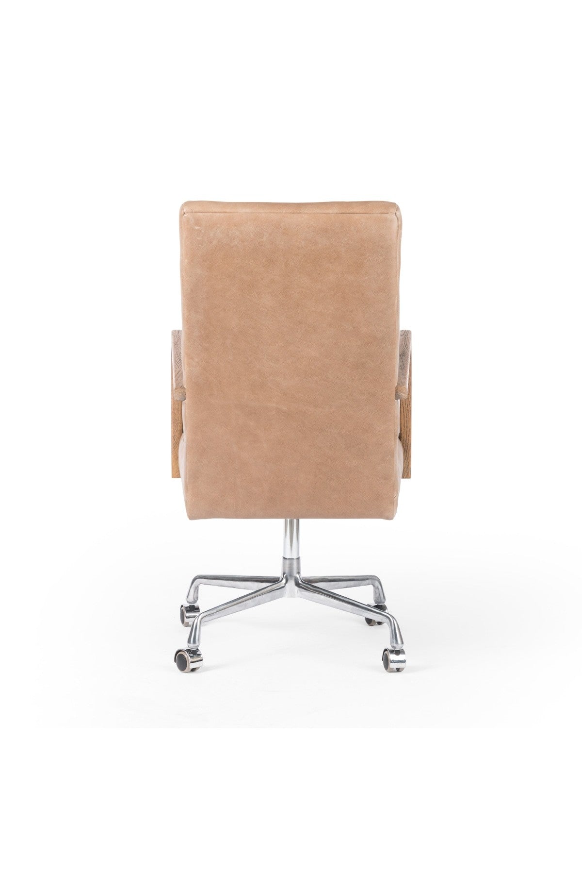 The Bryson Channeled Desk Chair is high style. Light tan top-grain leather covers a sculpted seat and back, with elegantly arched arms of solid oak. Stainless steel casters make for ease in the modern workplace. Height not adjustable.