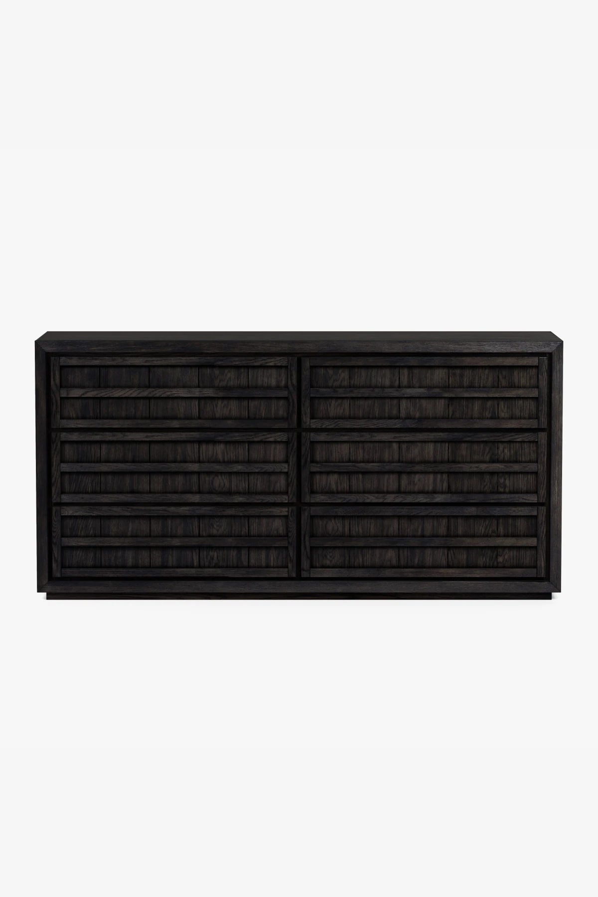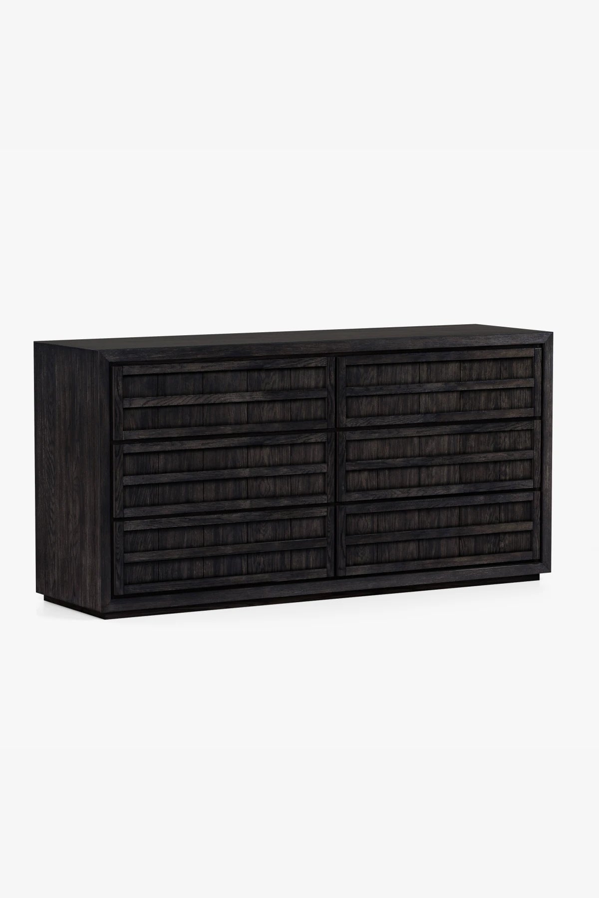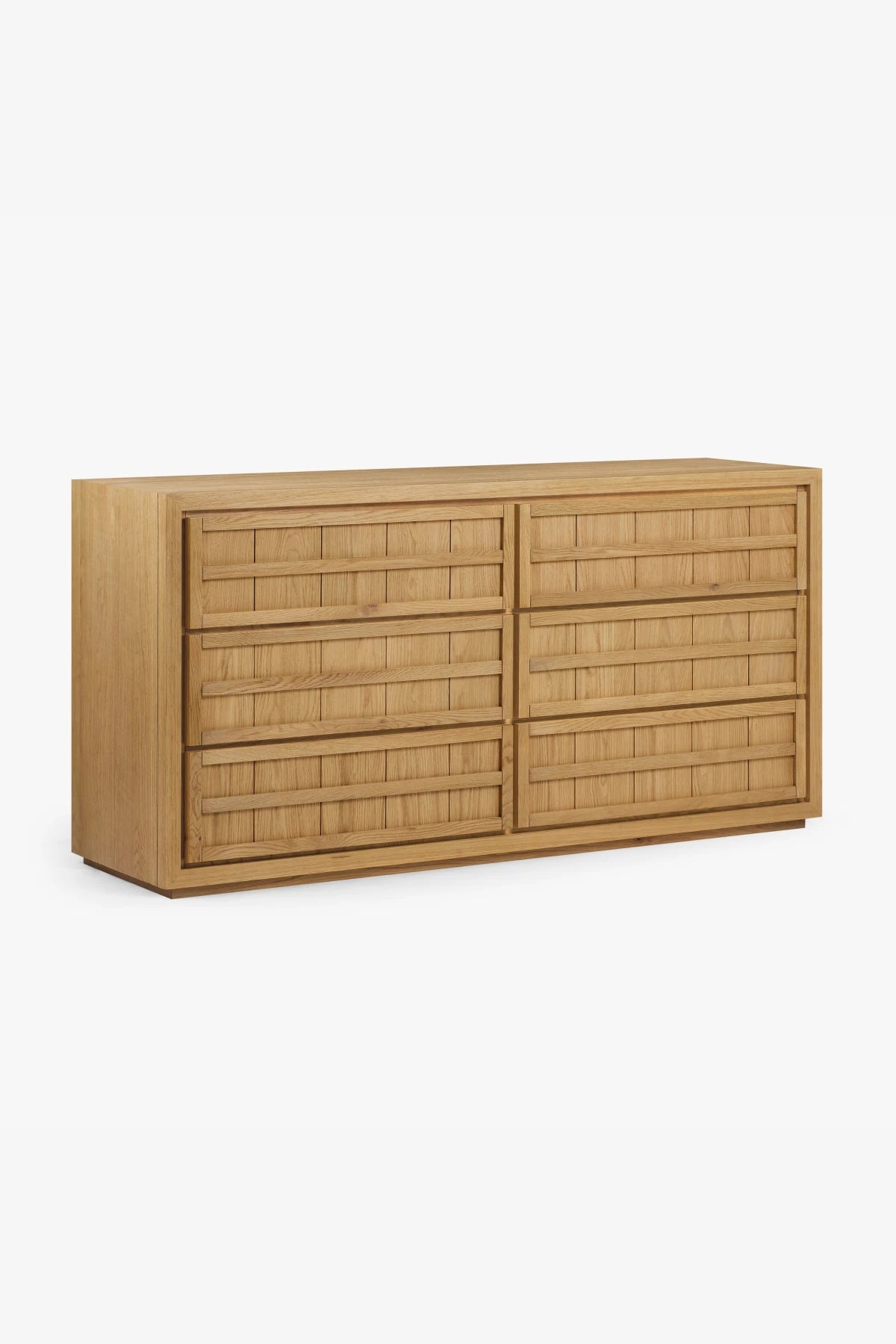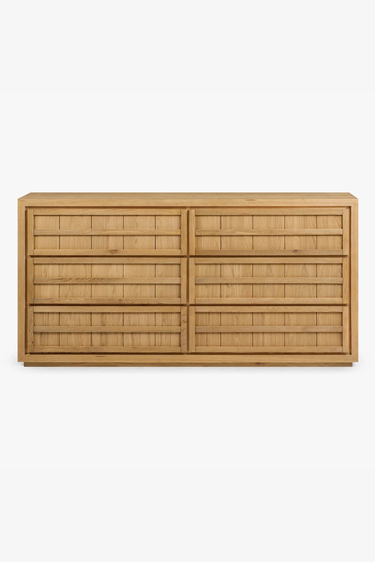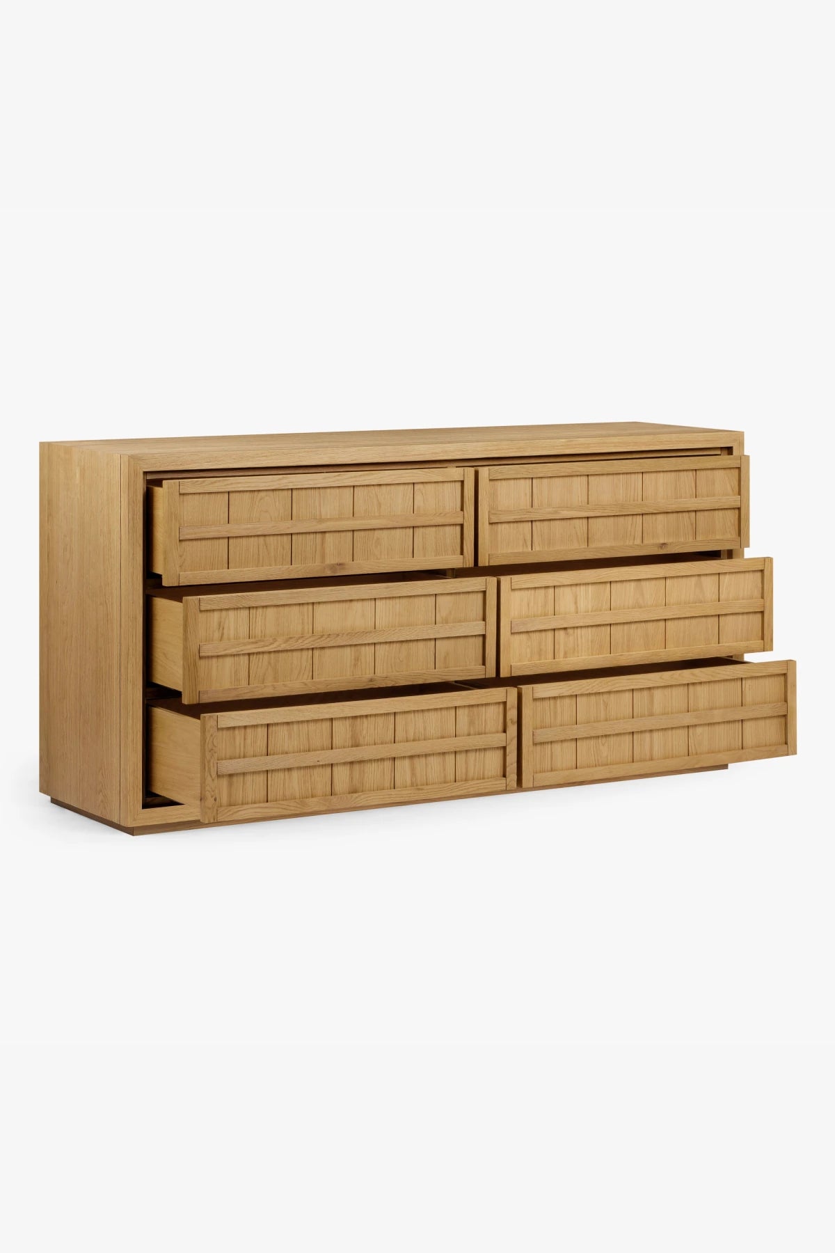 The Buddy 6-Drawer Dresser combines the beauty of natural oak wood with a textured finish achieved through a wire brushing technique that showcases the depth and character of the wood grain. Ample storage is provided by 6 large drawers with soft closing hardware, with the drawer fronts featuring a windowpane inspired detail.