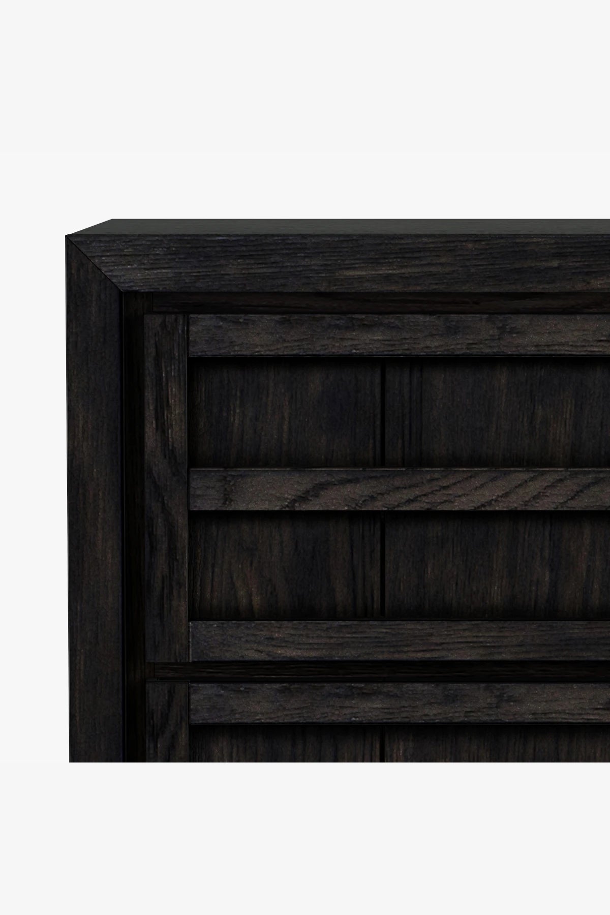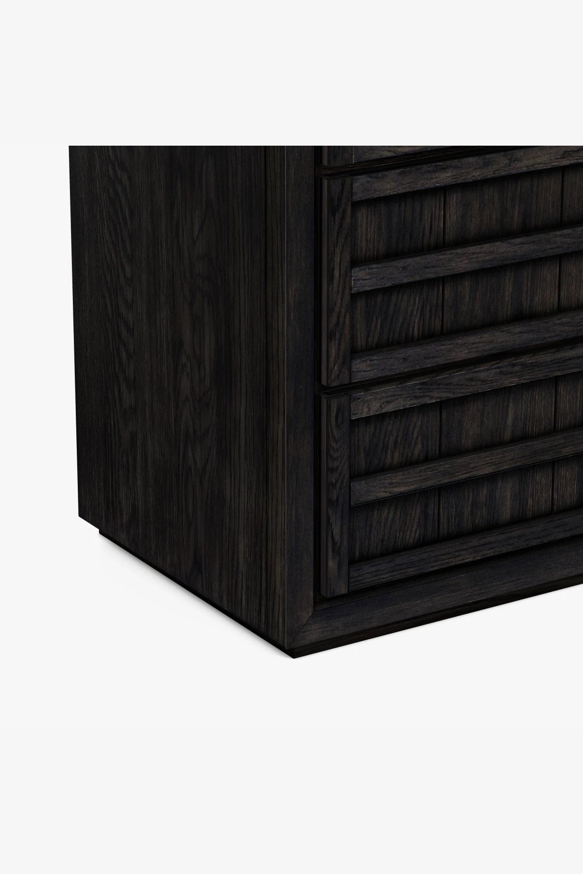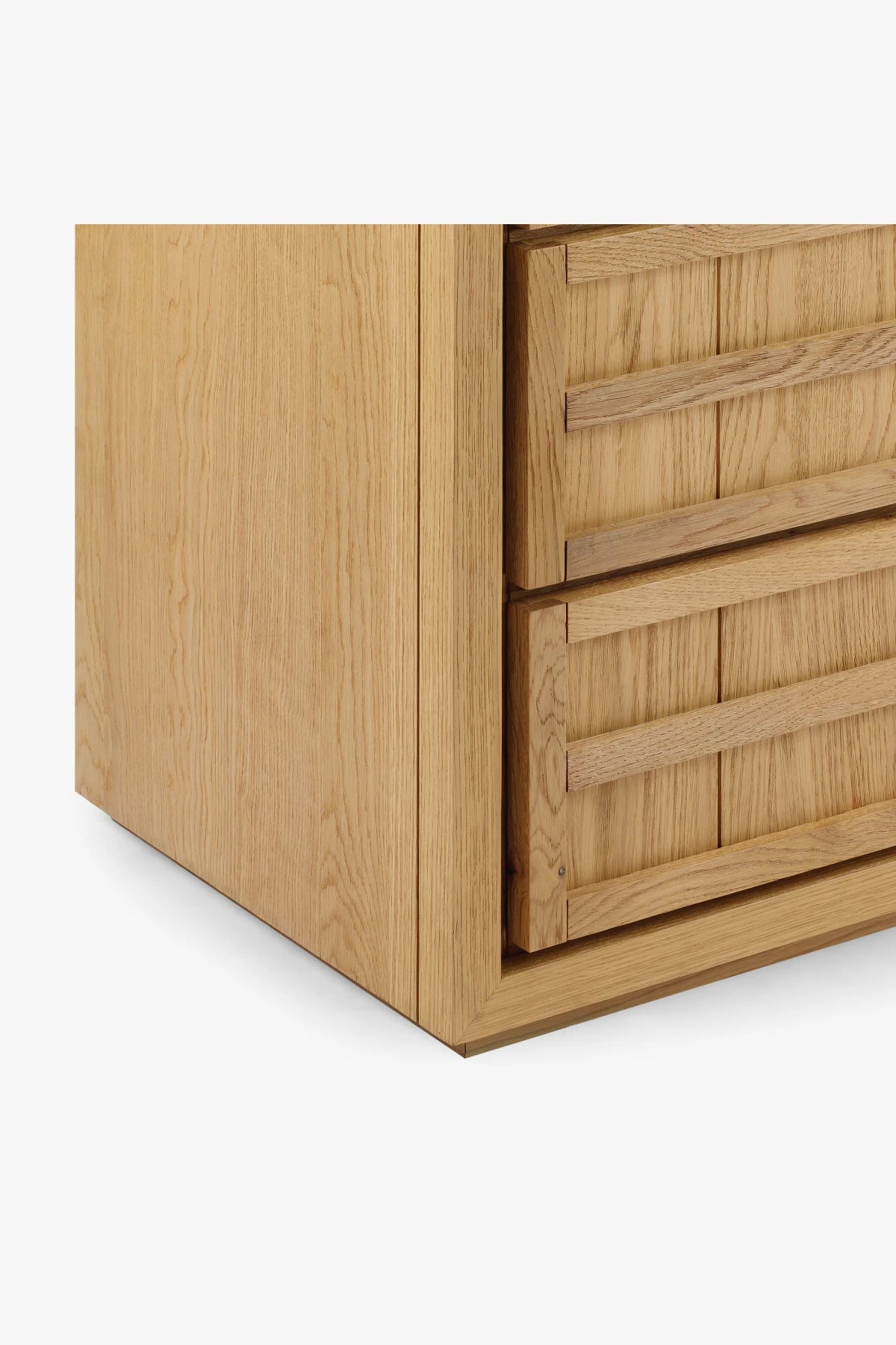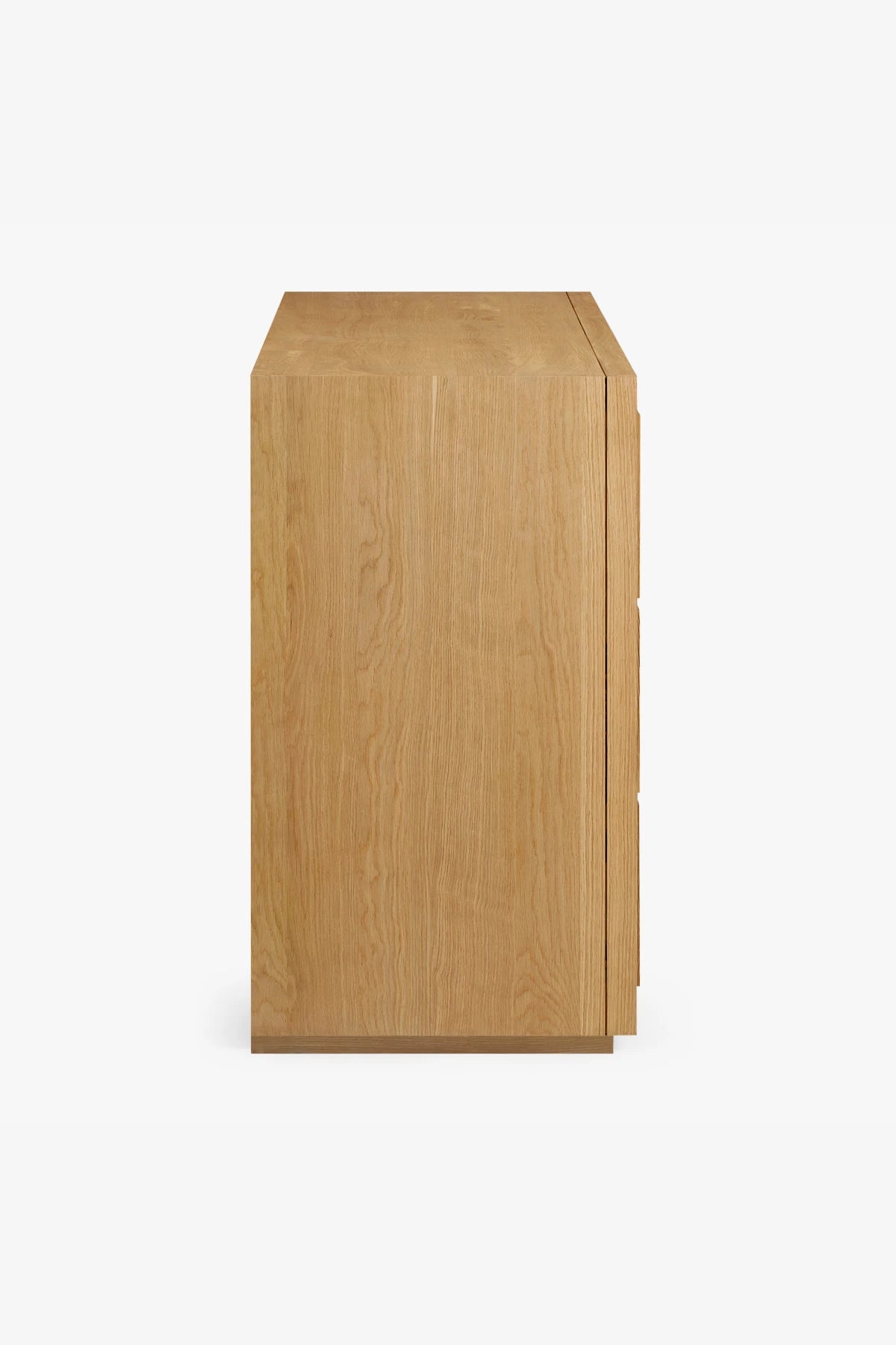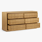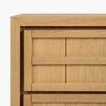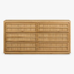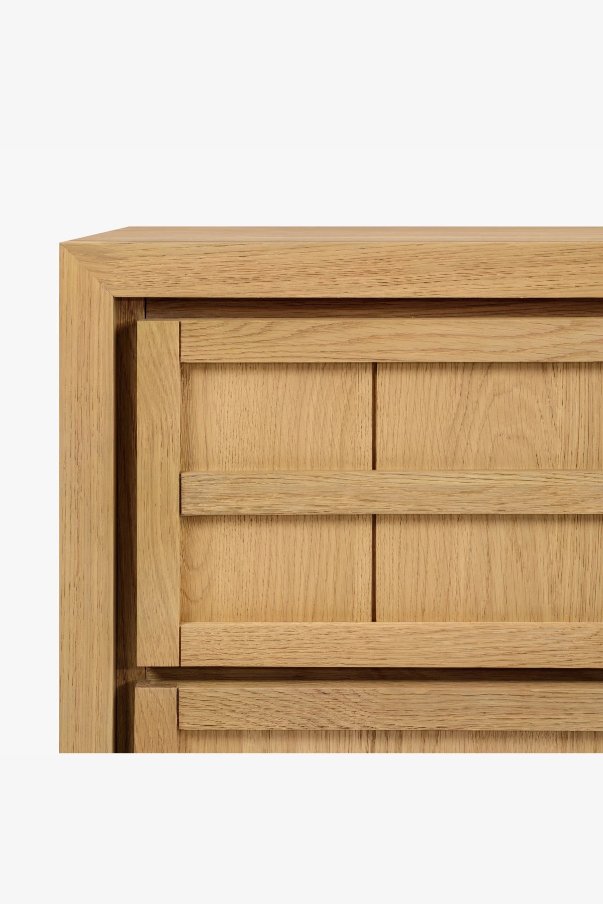 The Buddy 6-Drawer Dresser combines the beauty of natural oak wood with a textured finish achieved through a wire brushing technique that showcases the depth and character of the wood grain. Ample storage is provided by 6 large drawers with soft closing hardware, with the drawer fronts featuring a windowpane inspired detail.