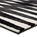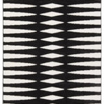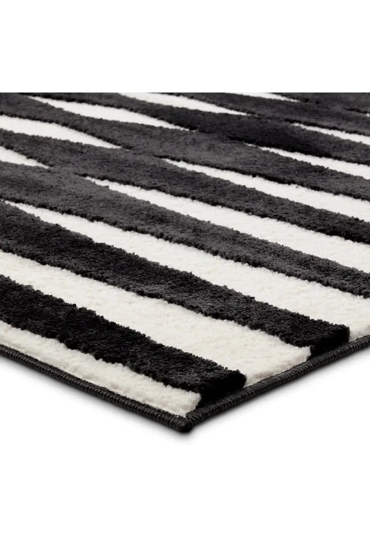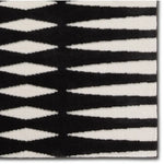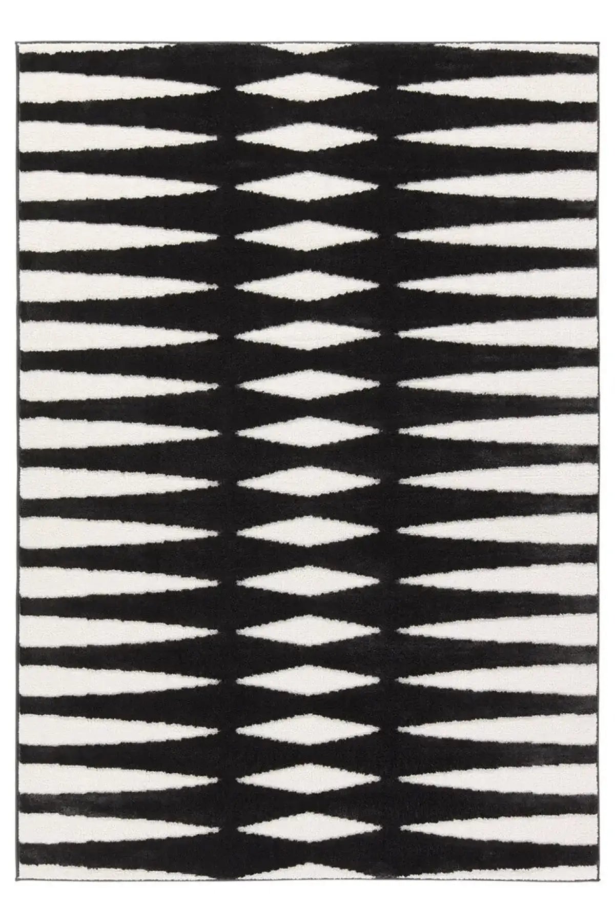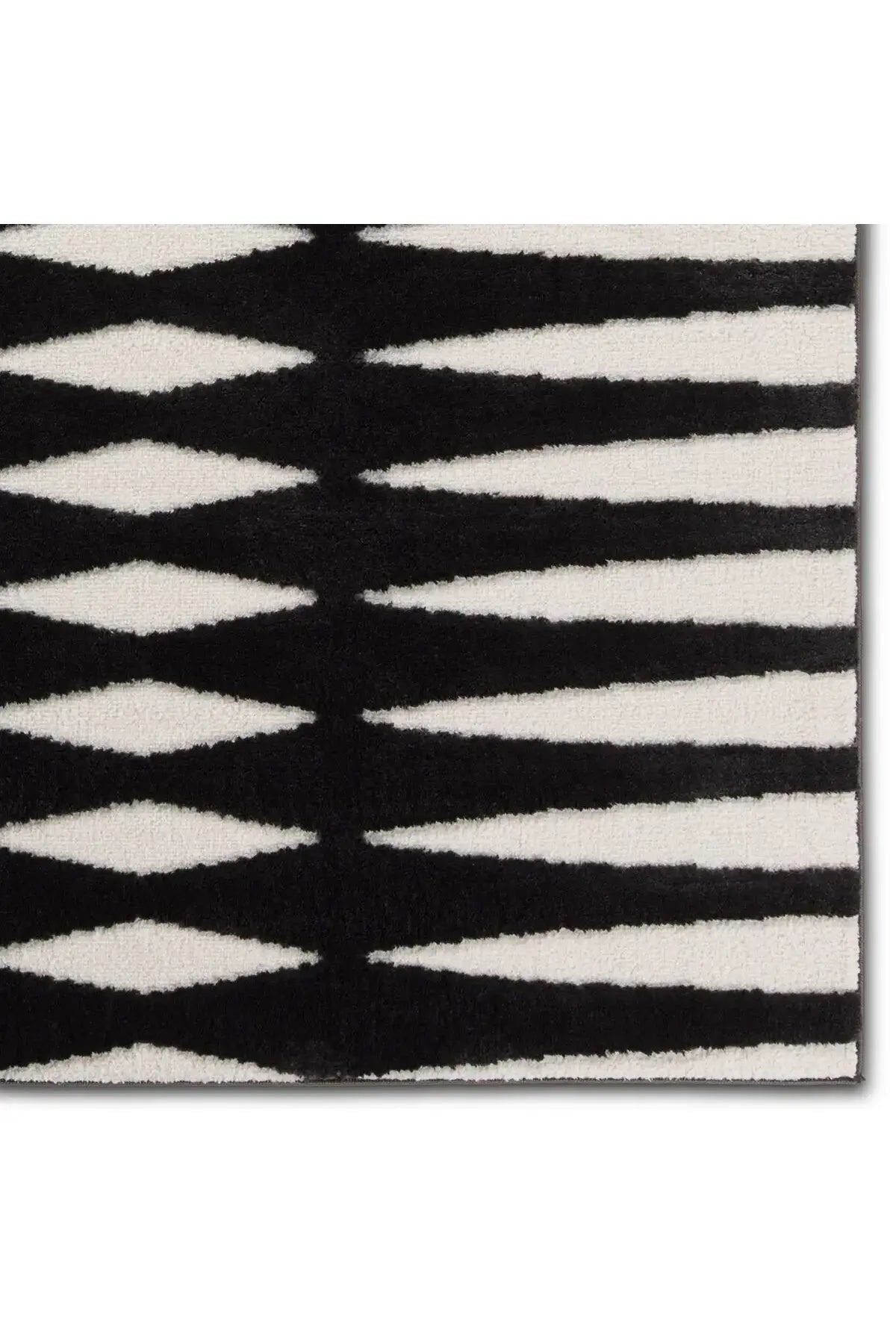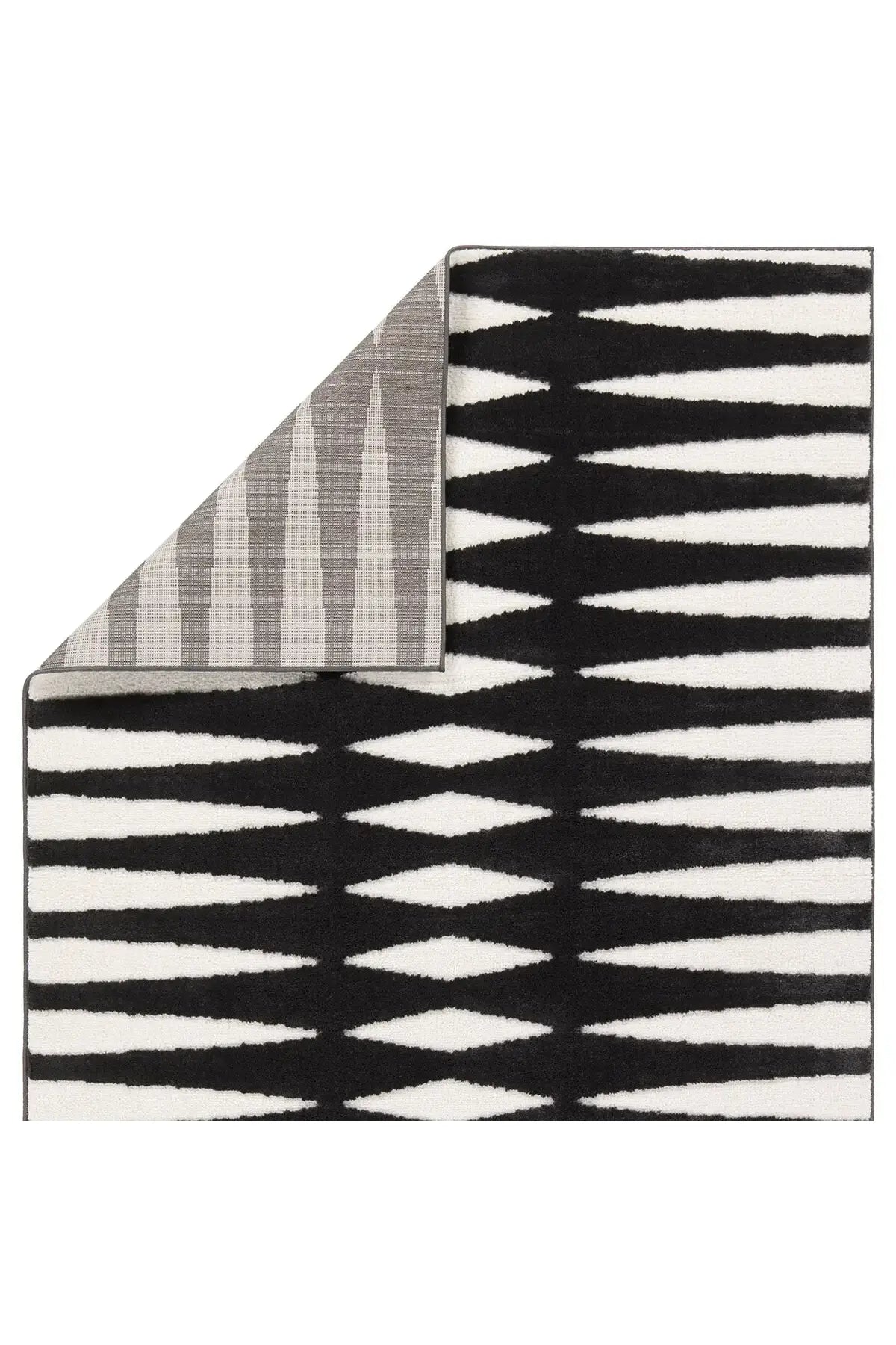 Meet the Calix Rug - Tap Shoe. This Rug offers a soft, textured feel with a stylish black and white diamond pattern. Made from a stain-resistant polypropylene and polyester blend, it’s perfect for living rooms, bedrooms, and dining areas with moderate use. Samples are modeled at our North Scottsdale/Phoenix location.