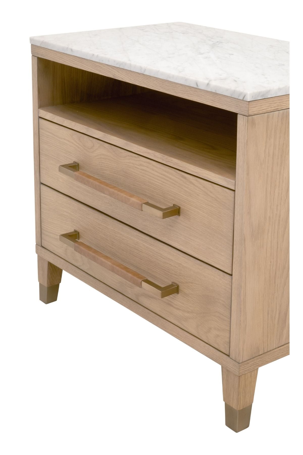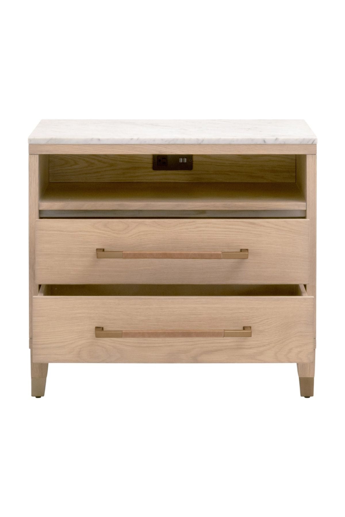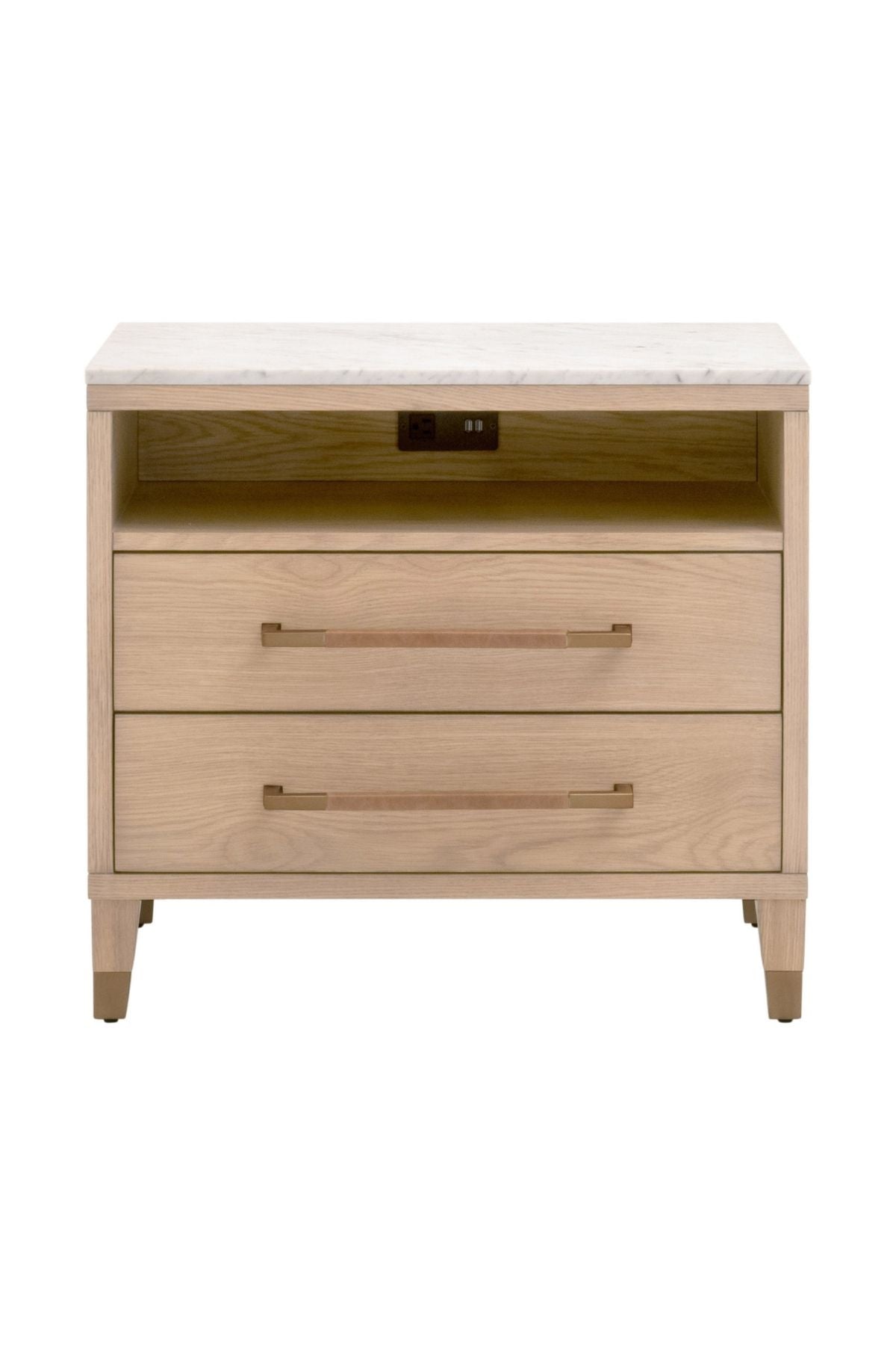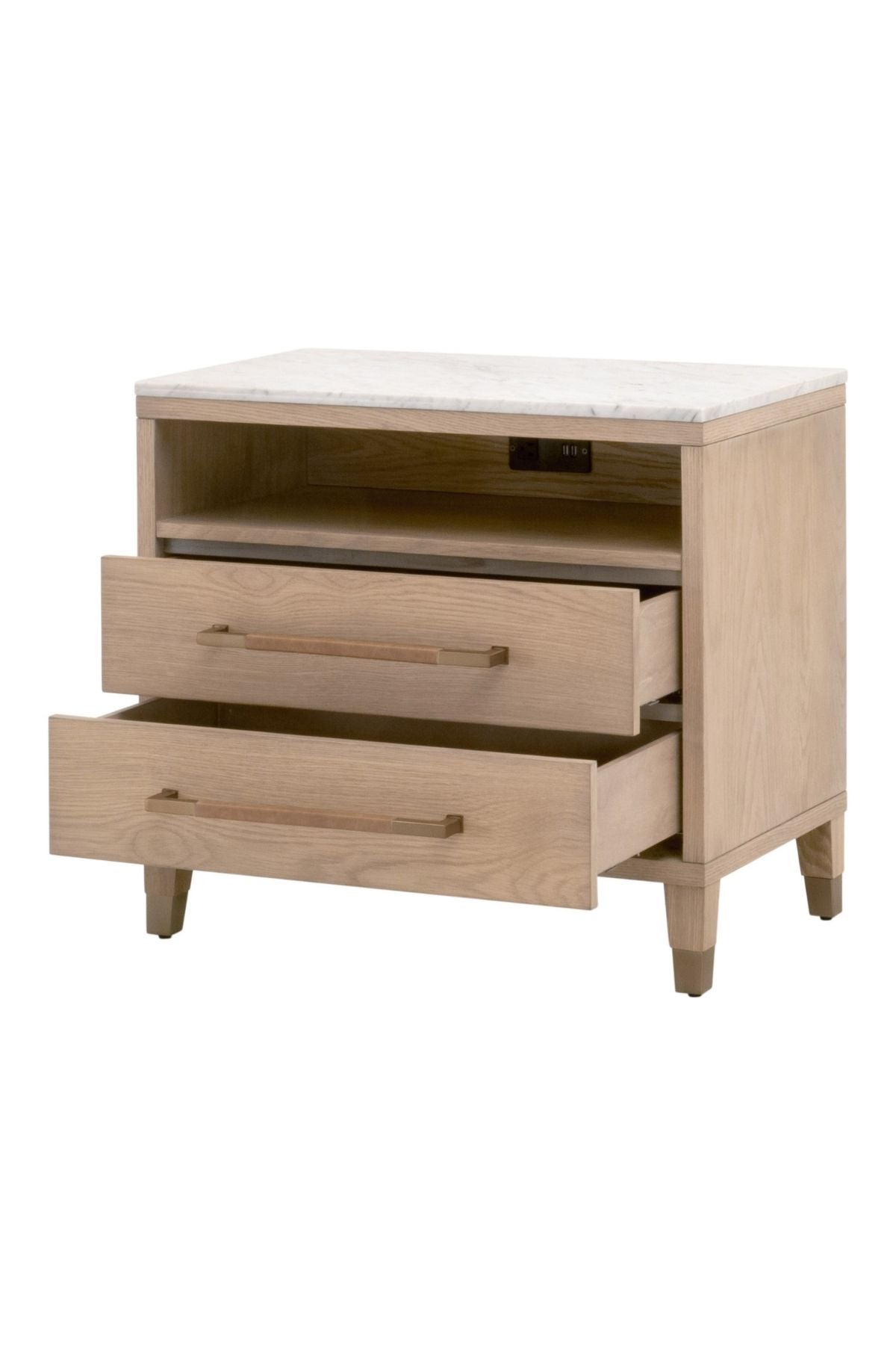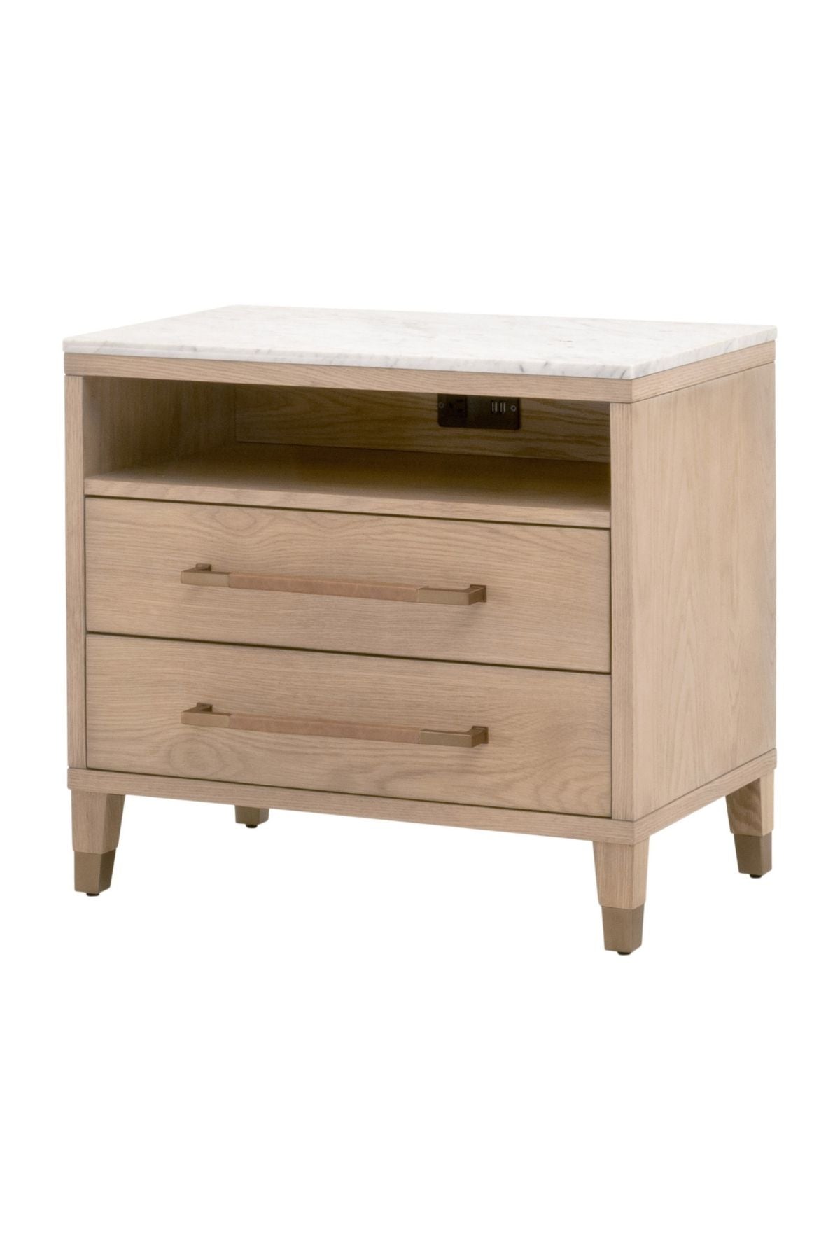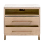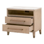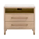 Elevate your bedroom with the Cambria Nightstand. This transitional masterpiece, crafted from a blend of solid oak wood, oak veneer, and solid marble, exudes sophistication and timeless elegance.