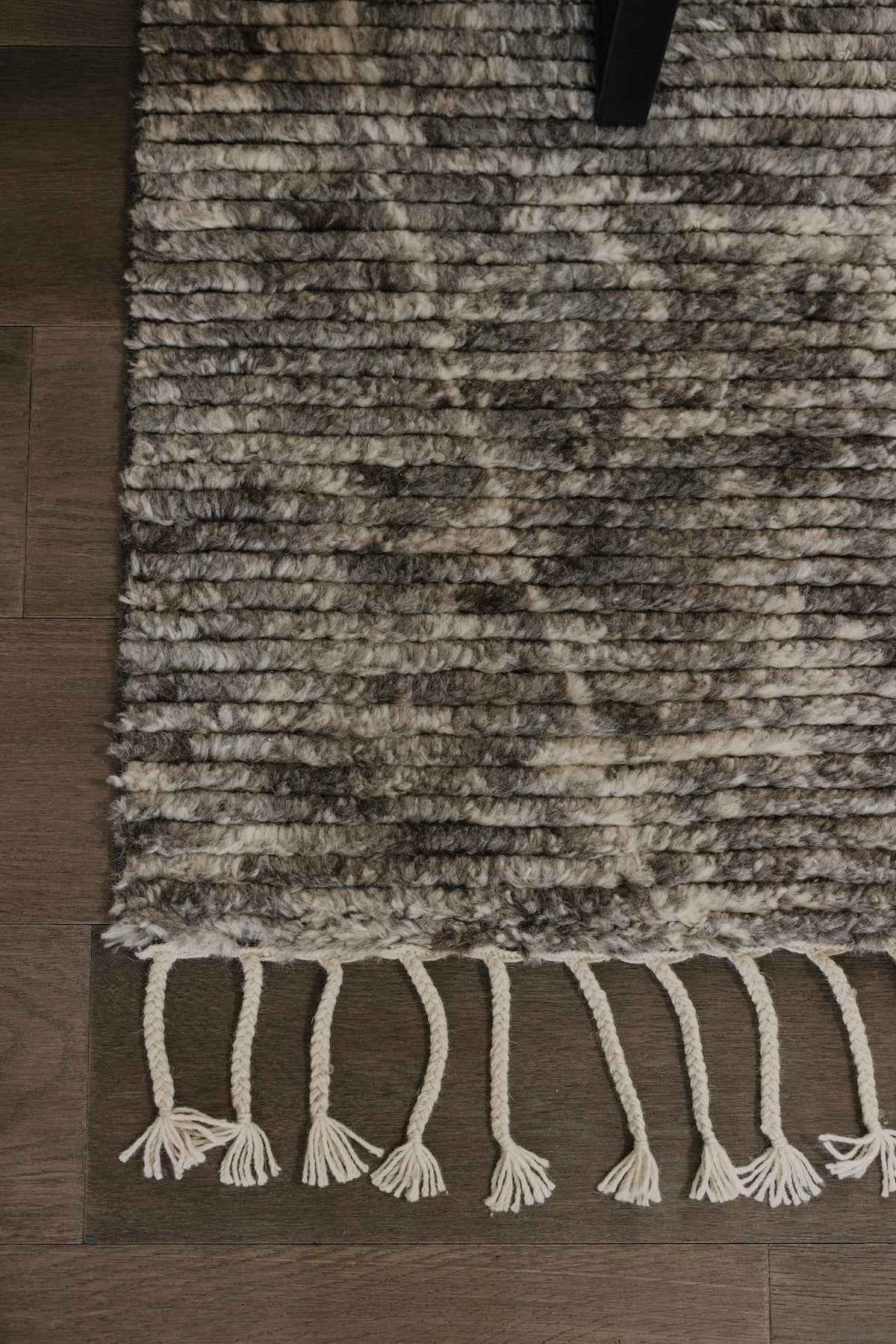 Meet the Camille Handmade Rug. Camille has a soft, muted appearance with a blend of light grey and cream tones, giving it a warm, neutral look. The design features a faint, intersecting geometric pattern, almost as if sketched lightly across the surface, creating a subtle diamond motif. This understated design and neutral color scheme make it versatile, ideal for adding a cozy yet sophisticated element to any room. Medium pile.