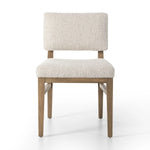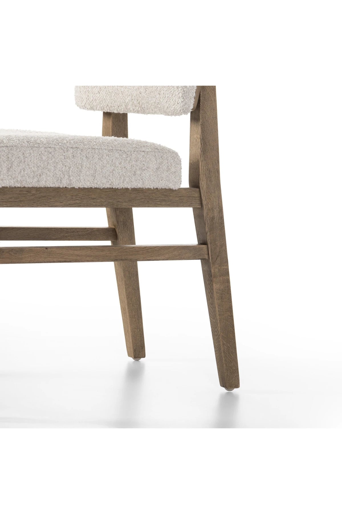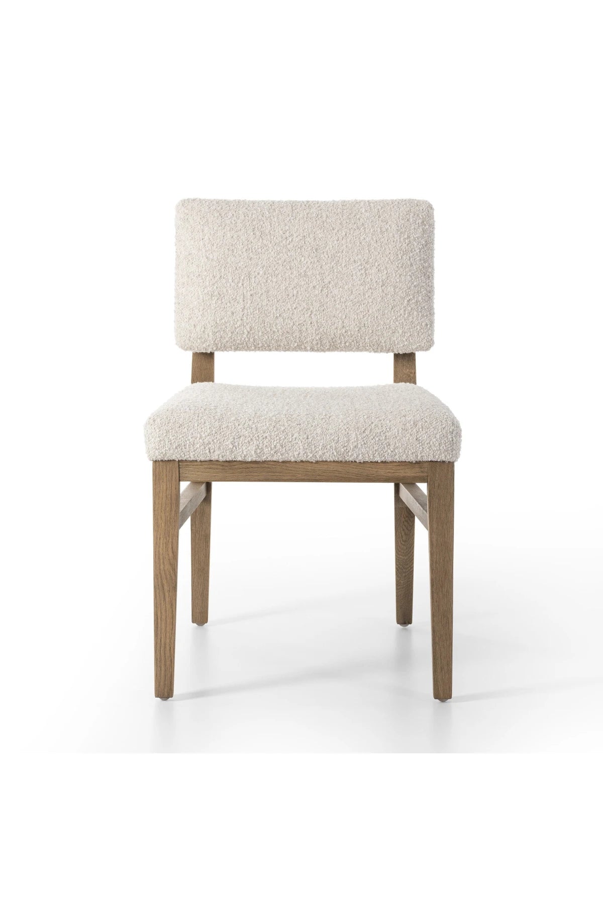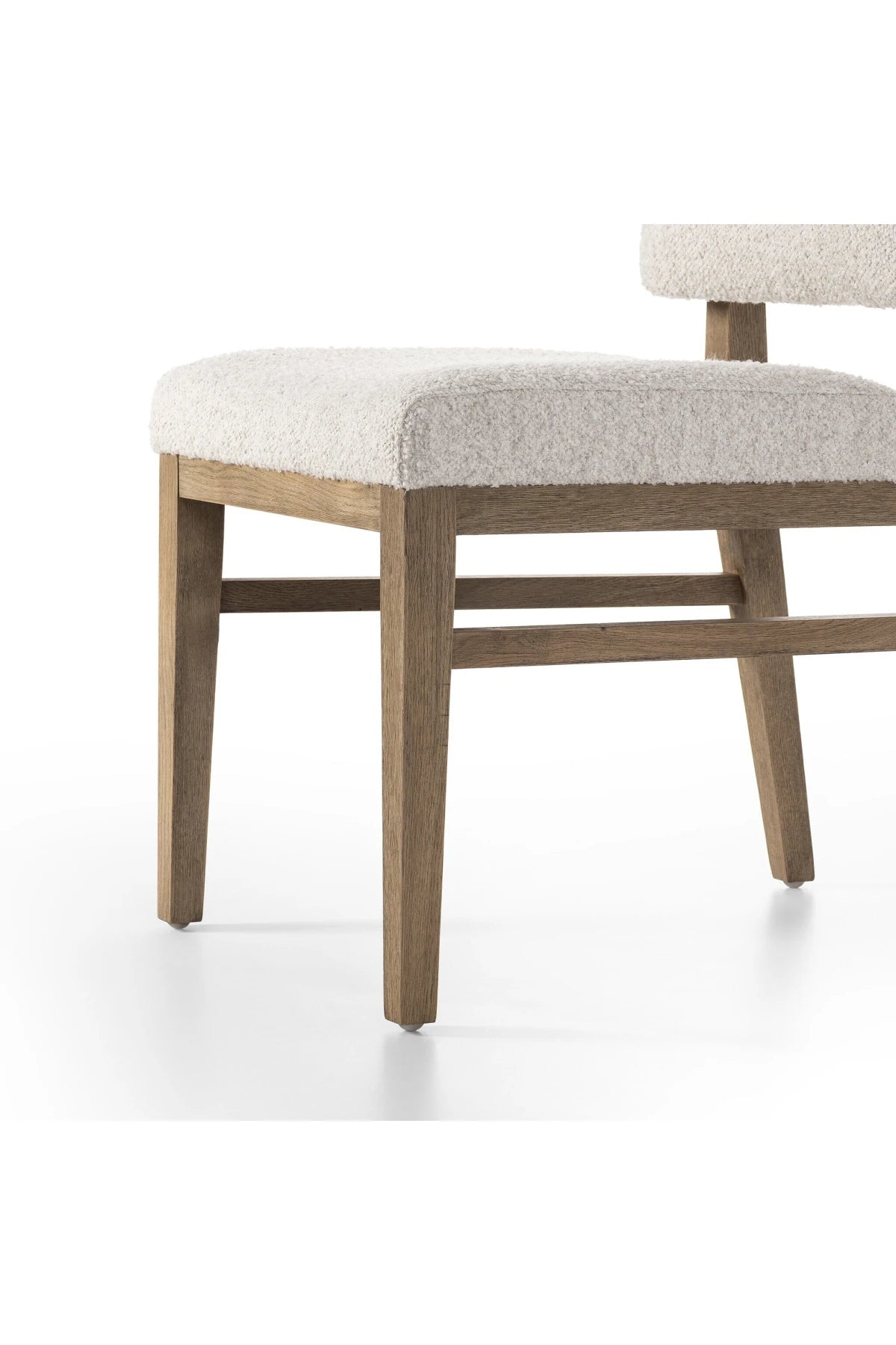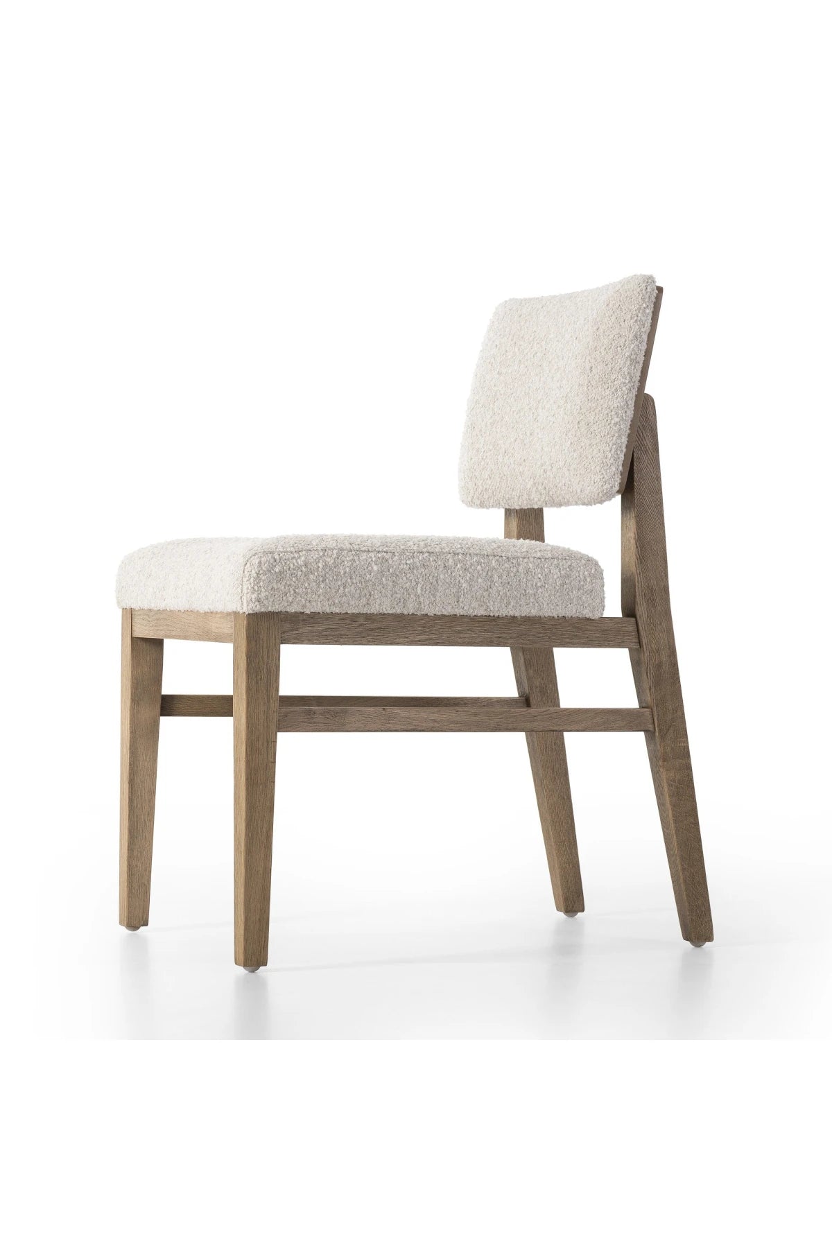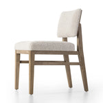 Meet the Carlo Dining Chair. Get back to the basics with this understated modern dining seating. Its simple shape includes a split back design that lets the upholstery peek through. A toasted oak frame paired with cream fabric brings natural tonality to the chair.