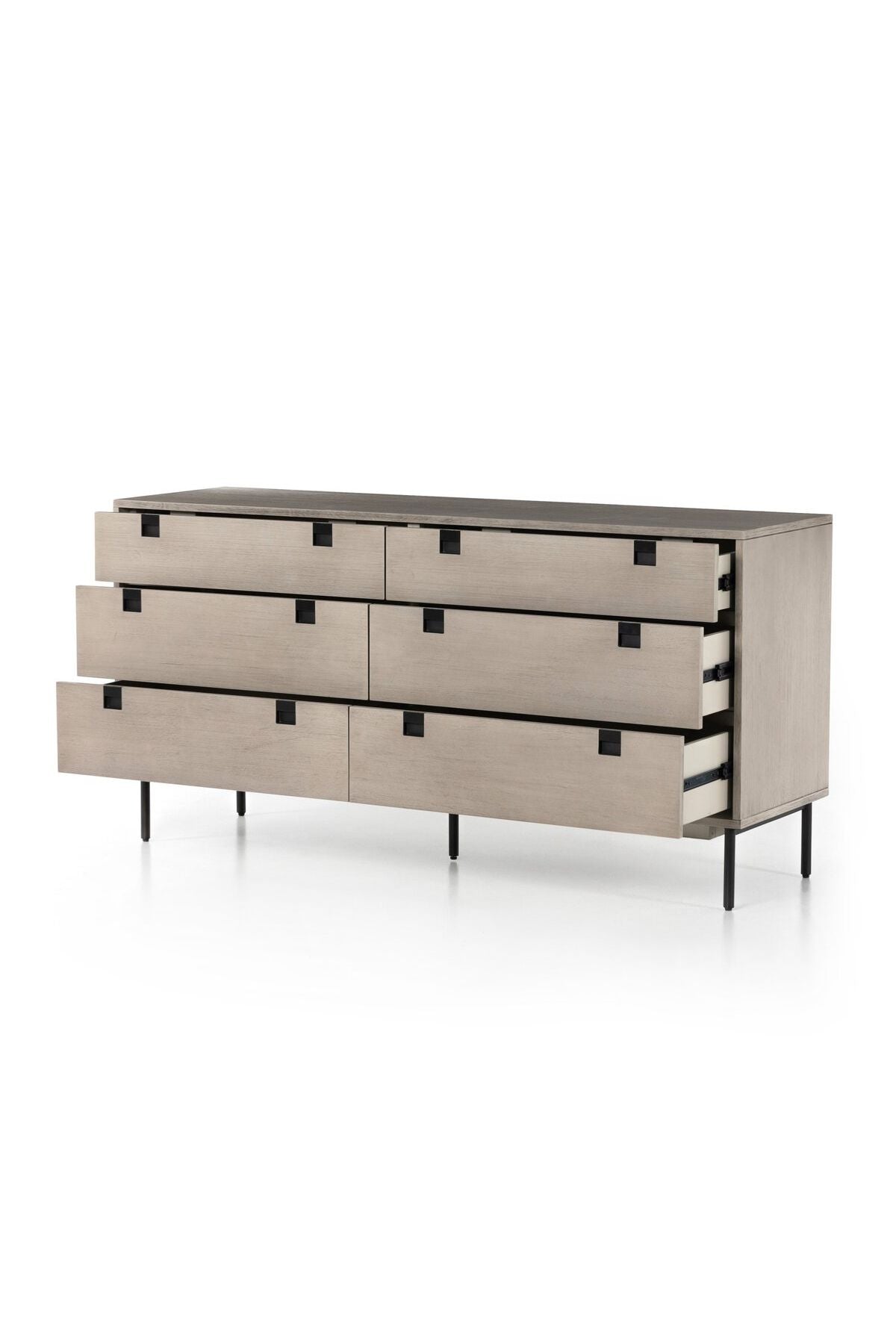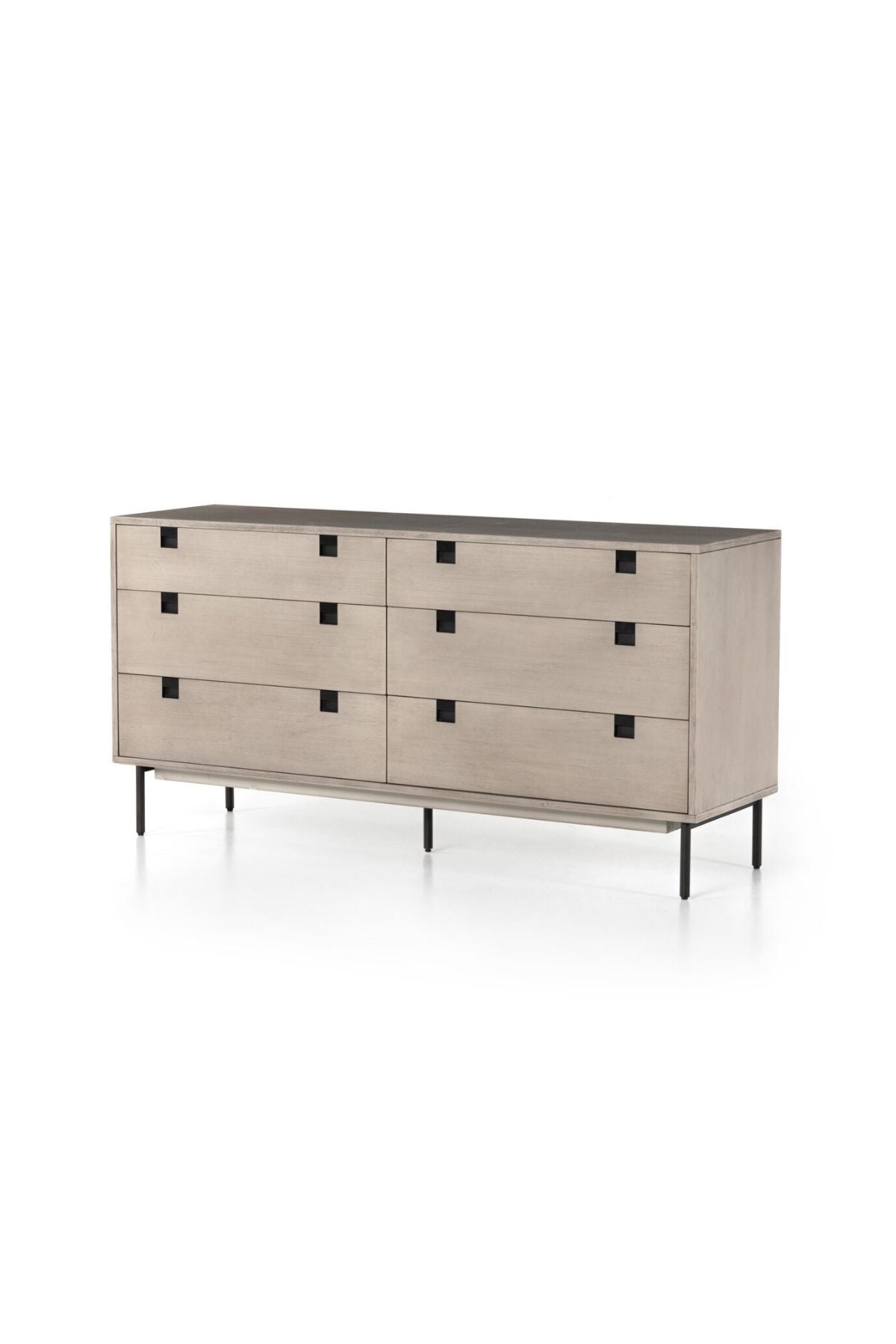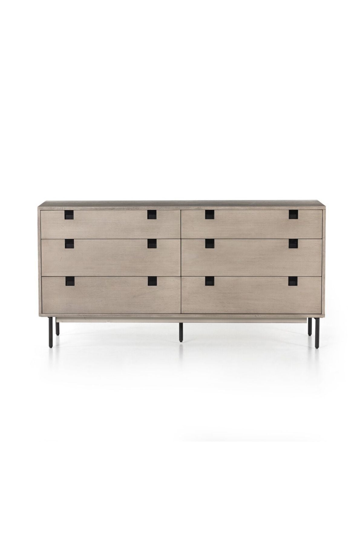 Meet the Carly 6 Drawer Dresser. Clean, streamlined shaping brings a structured-yet-light look to bedroom storage, with six spacious drawers of grey-washed acacia veneer perched atop iron legs finished in an antique bronze.