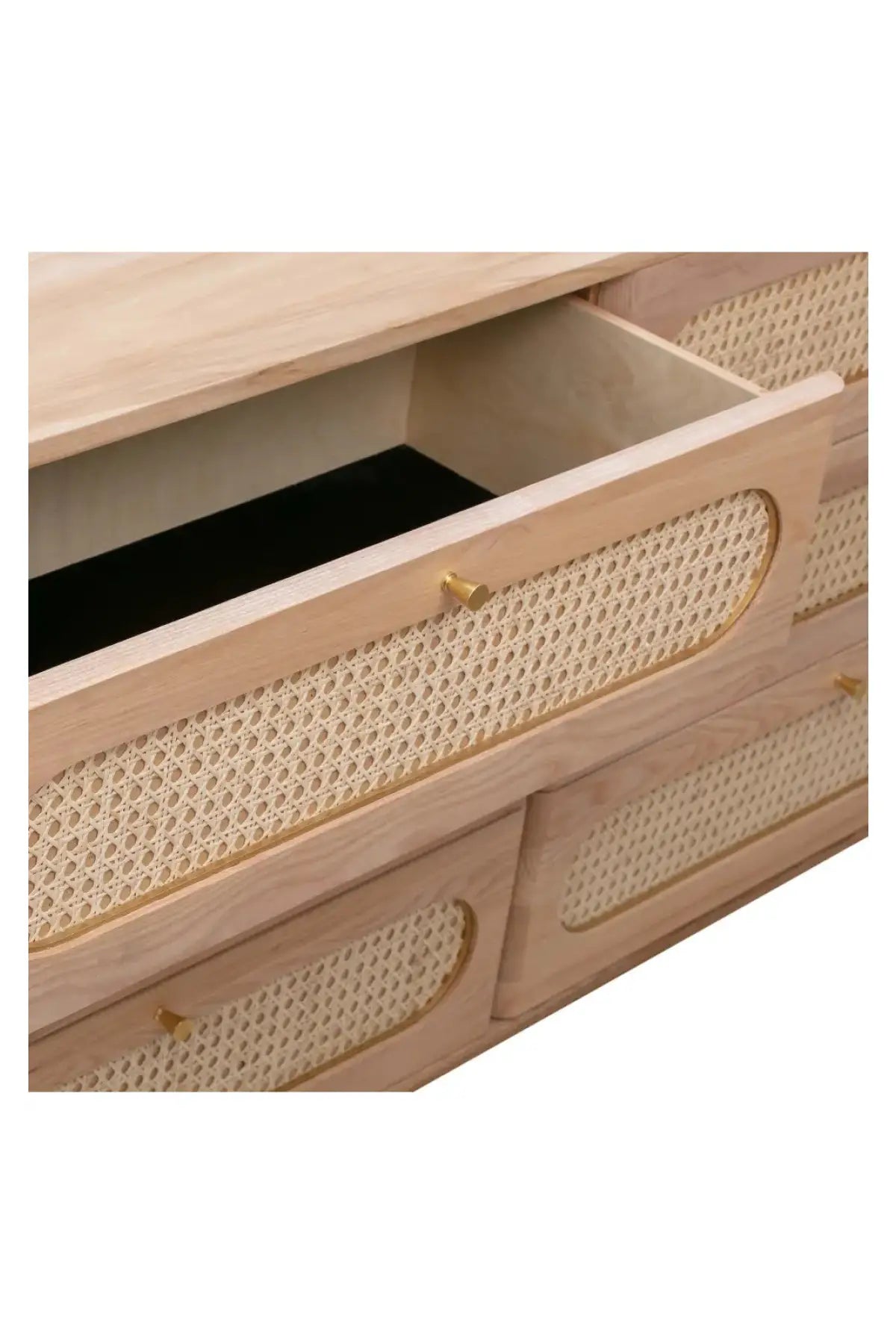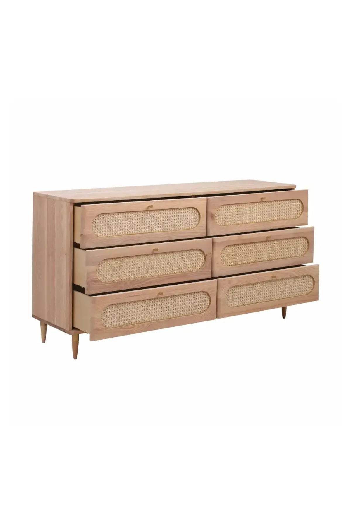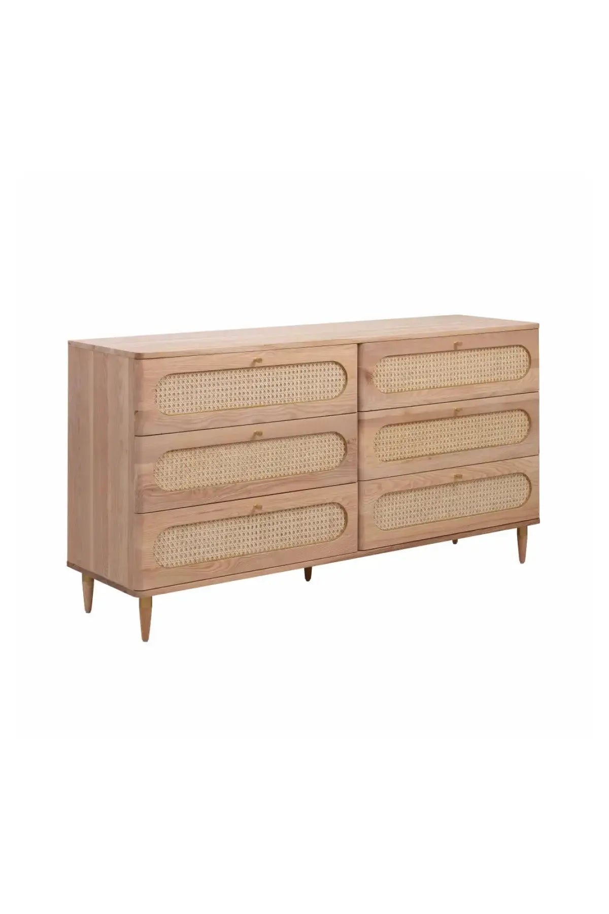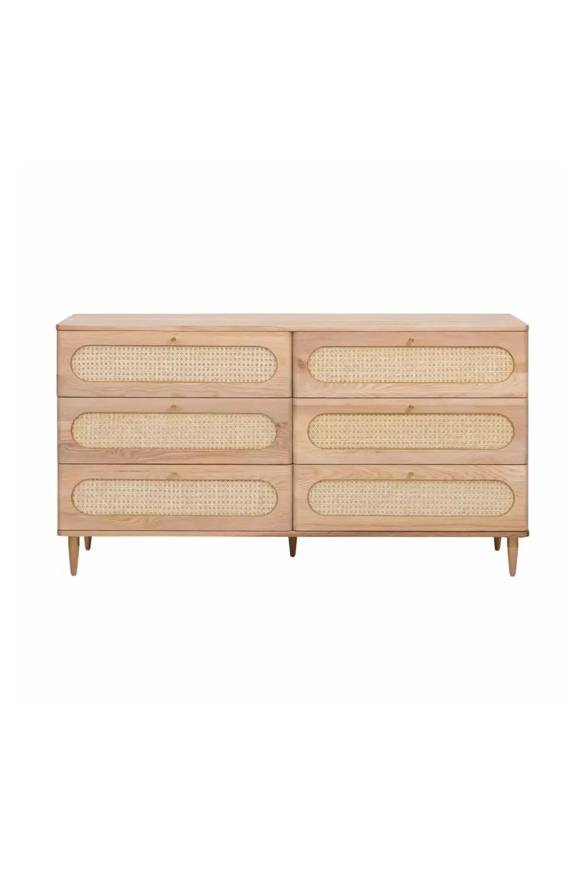 Meet the Carmen Cane 6-Drawer Dresser. The Carmen Dresser offers a gorgeous blend of textures and soft hues to make your space feel not only sleek and modern, but also warm and inviting. This wooden piece has minimalistic clean lines while adding a unique spin with the exquisite cane details.