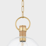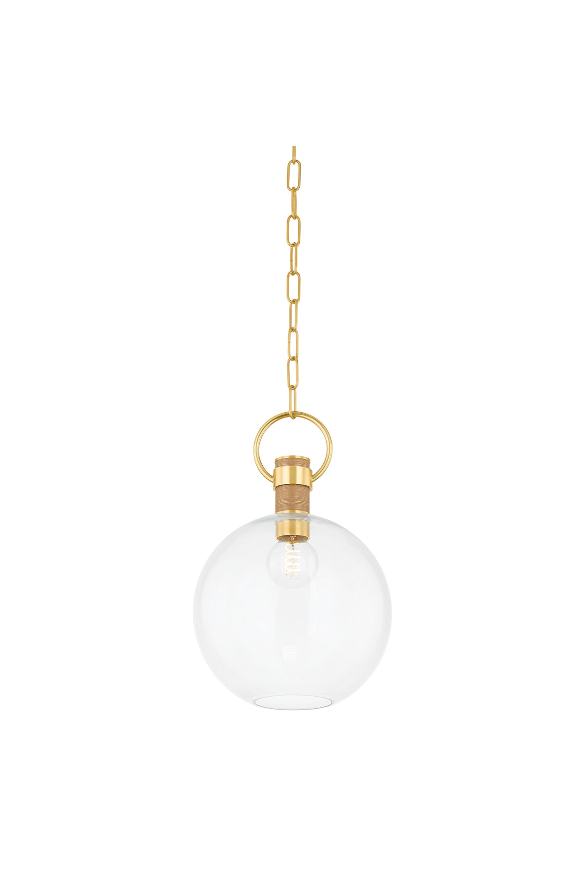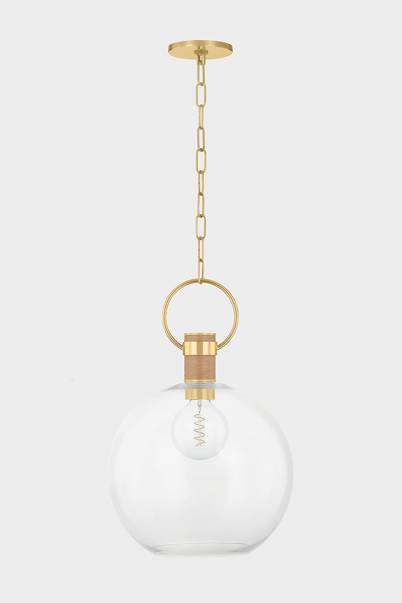 Meet the Catrine Pendant. An elevated kitchen basic, Catrine is characterized by uncomplicated forms, industrial design details, and a refreshing blend of materials. This pendant features a large globe suspended by an oversized pin and loop, finished in Aged Brass. To soften the clean lines, grass cloth wraps around the pin, introducing a natural element to the modern silhouette. Bulb(s) not included.