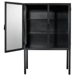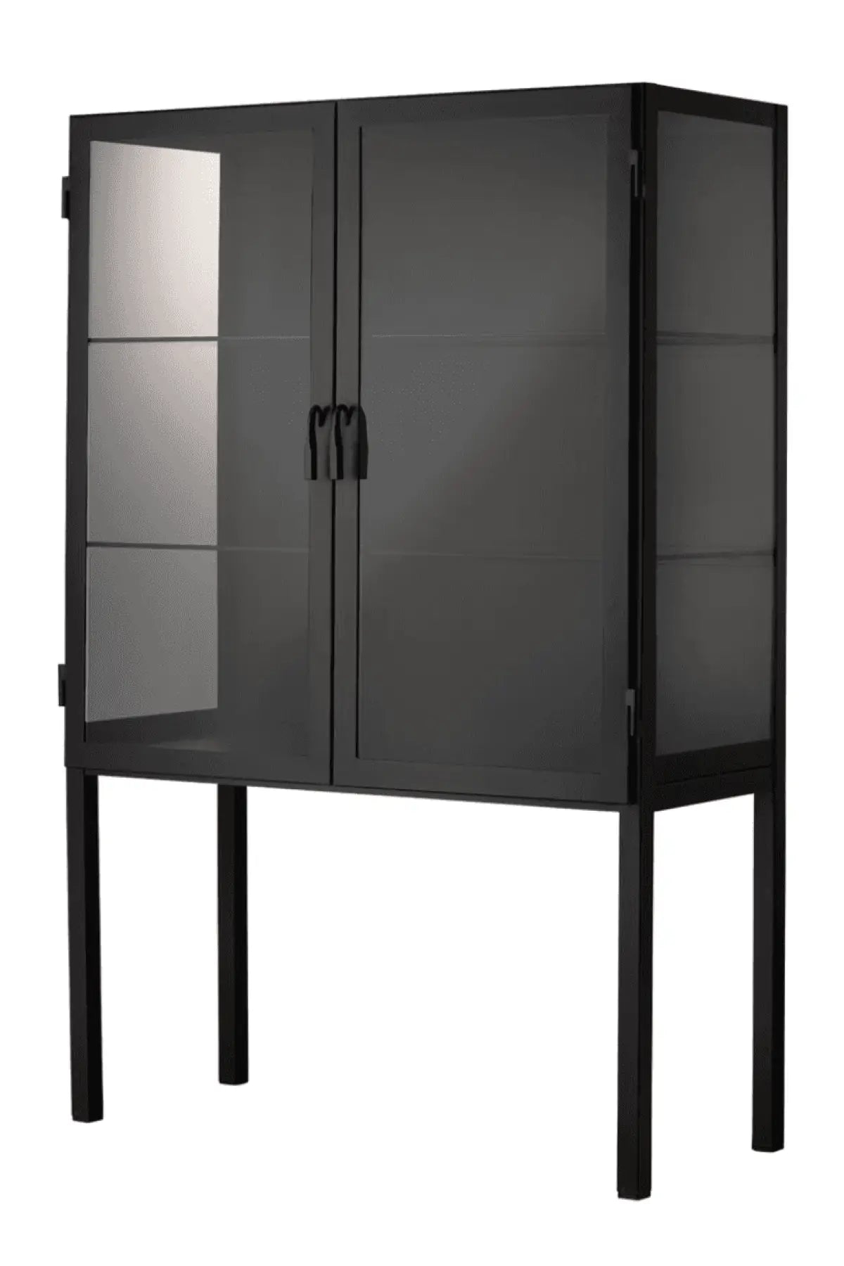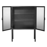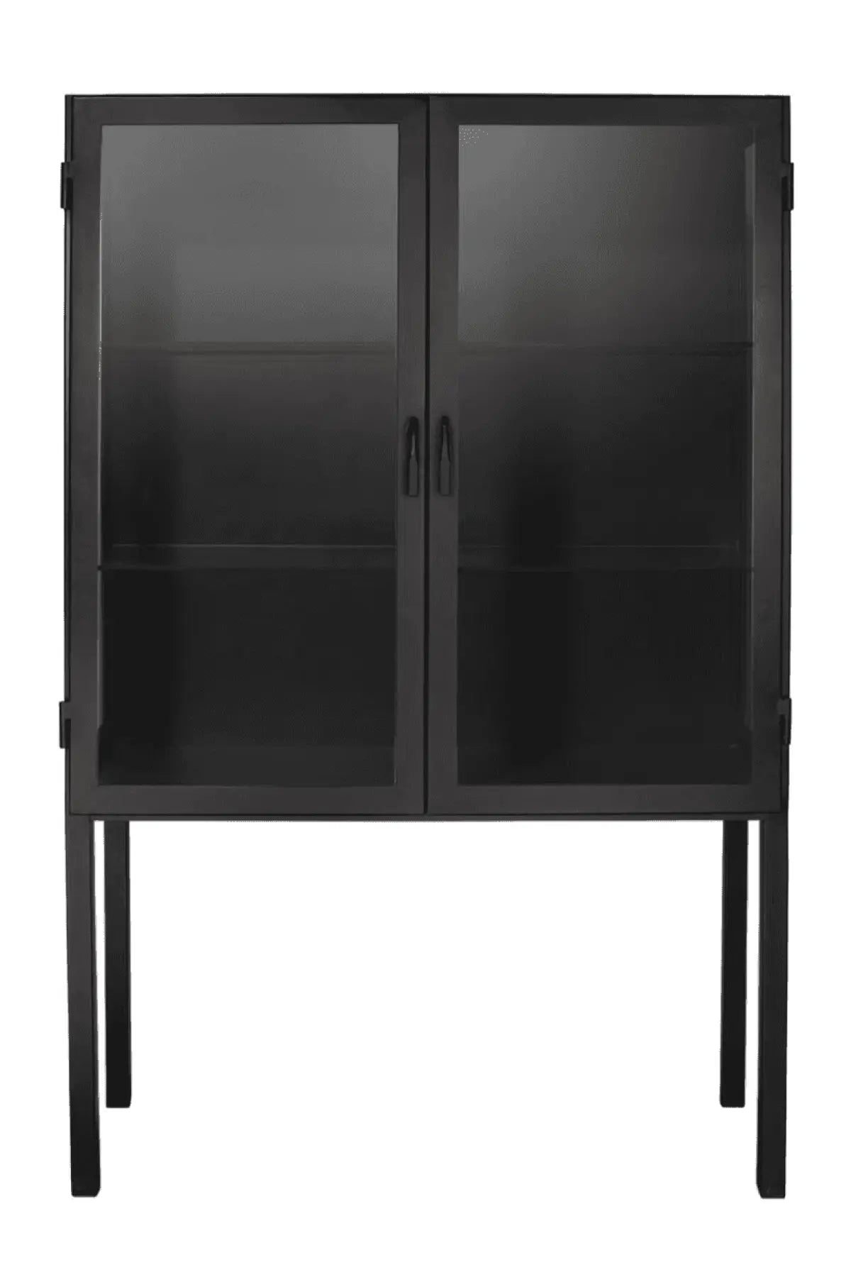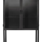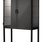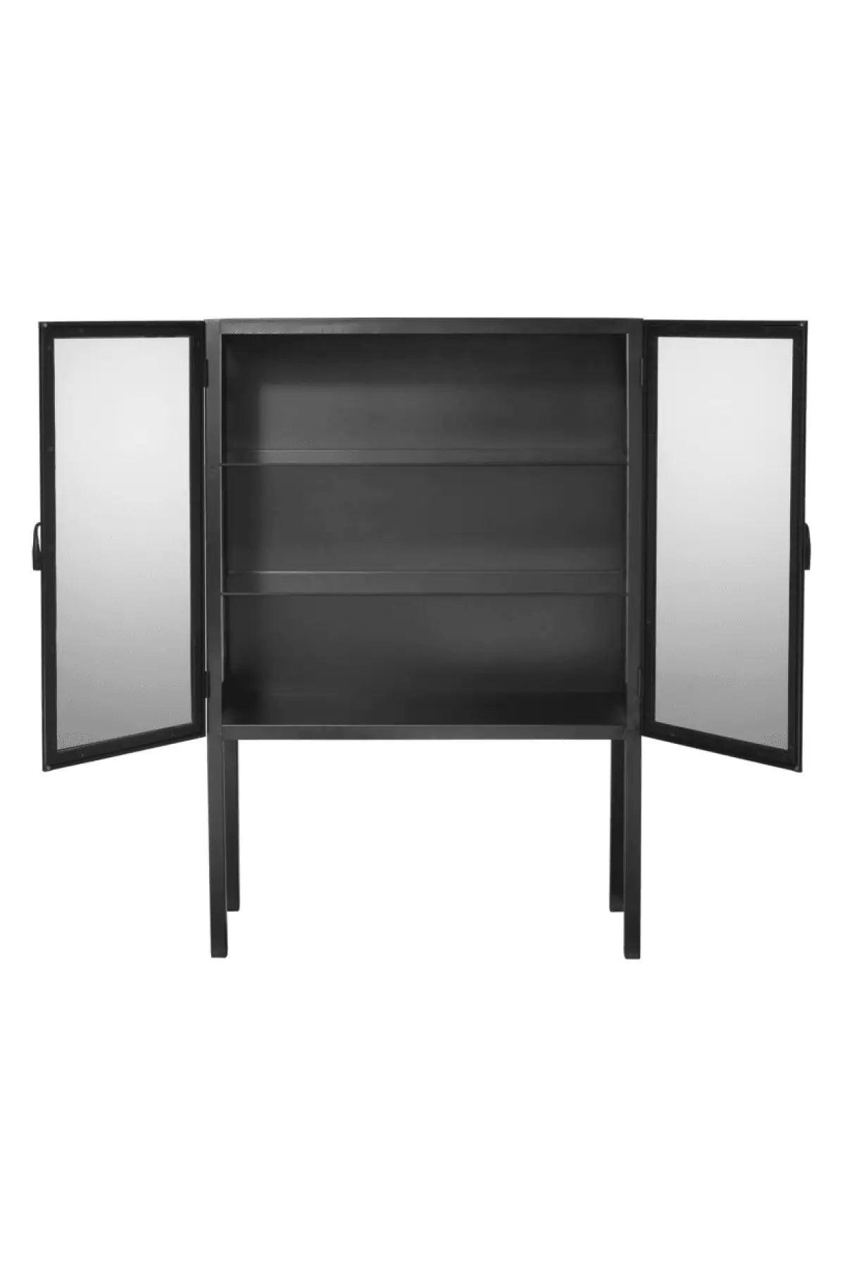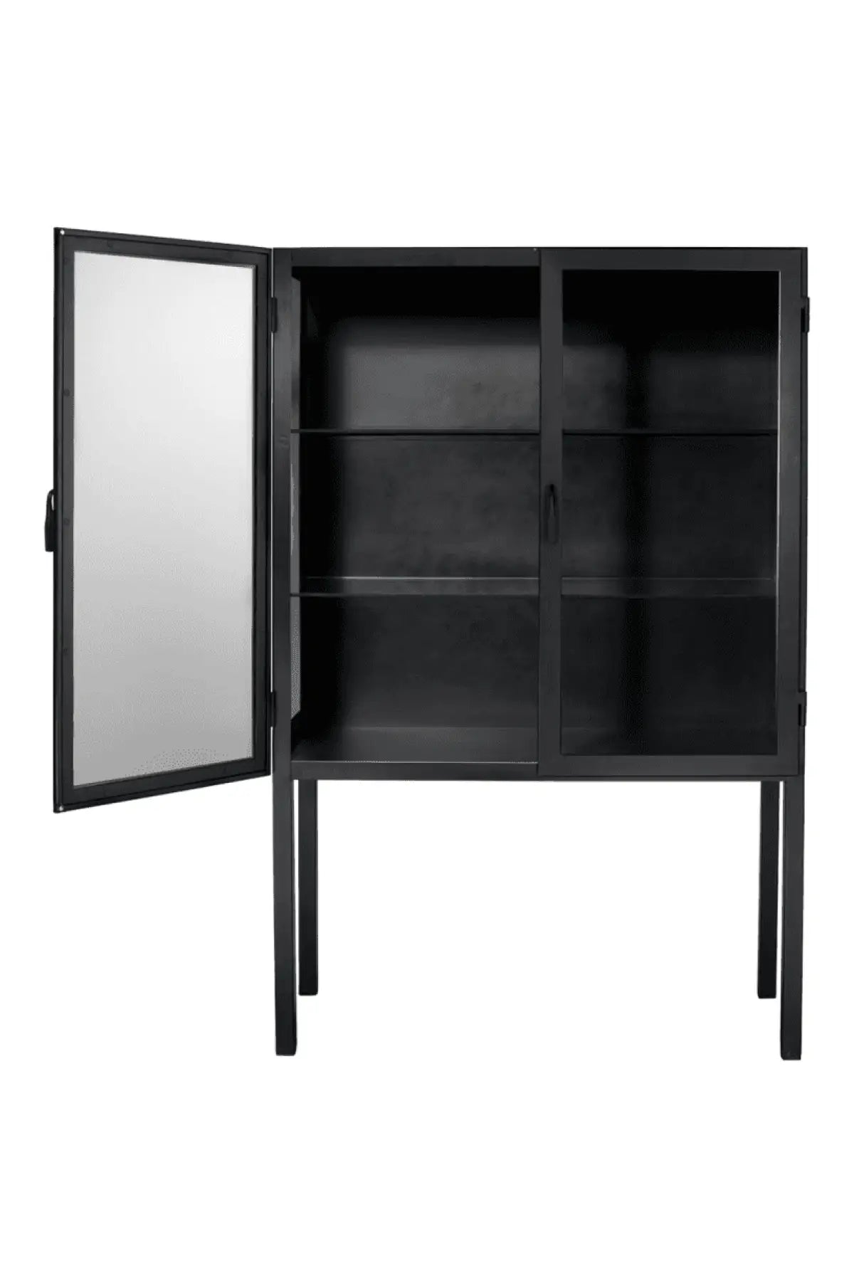 Meet the Chauncey Wide Curio Bar Cabinet. Glass panes are encased in simple black metal to create a wide, minimalistic cabinet perfect for storage or display. Use this piece to showcase your favorite barware or books. This metal cabinet is intended to have a rustic appearance that may include spotting and variances in tone and luster.
