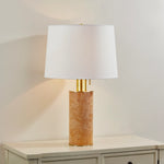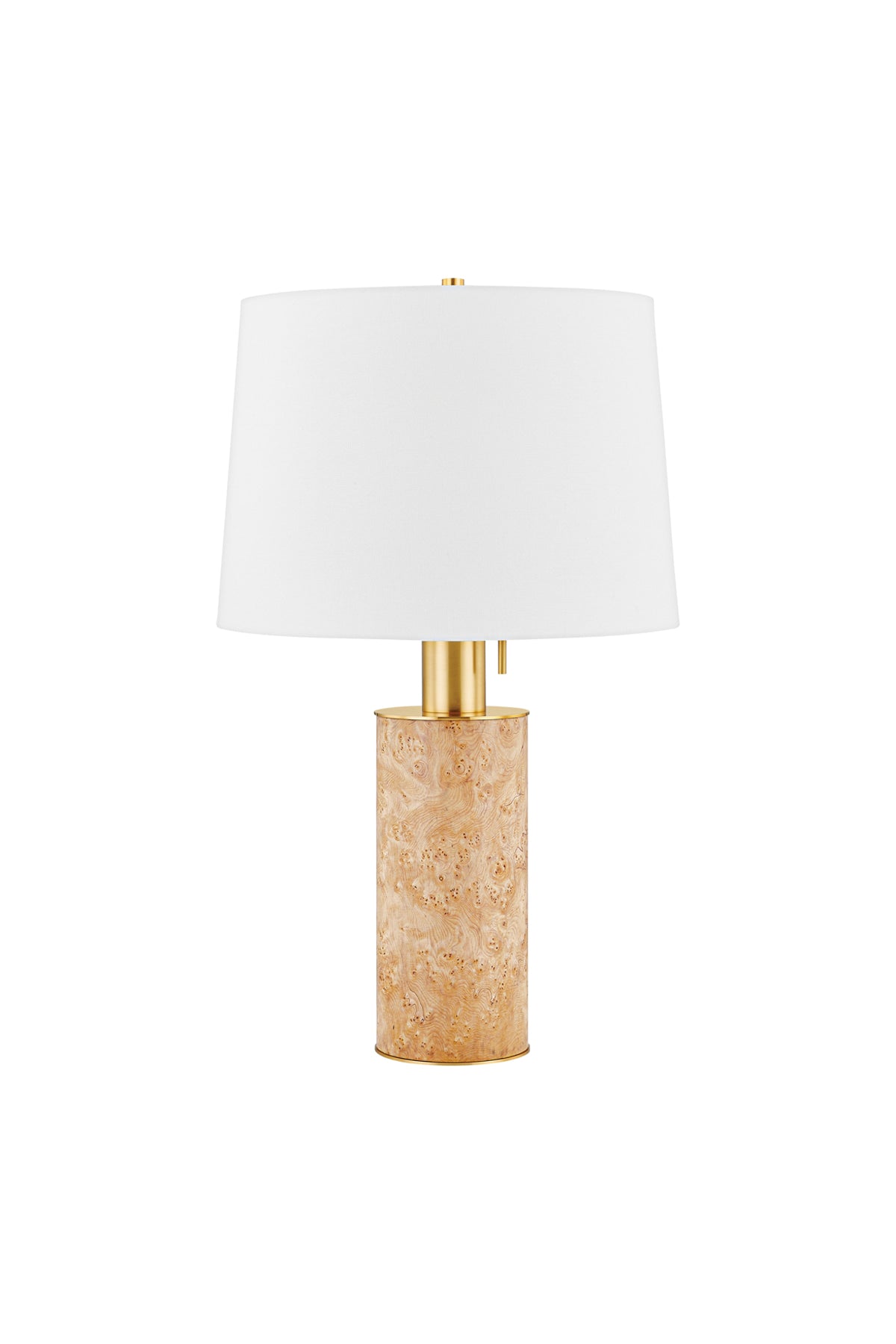 Simple shapes and modern proportions provide a clean canvas to highlight the striking Burl Wood Veneer body of our Clarissa lamp. The blonde wood tone embodies elegance, while the overscale, Aged Brass neck and decorative pull chain provide a fresh and playful counterpoint. A classic white linen drum shade completes the lamp base with an air of timelessness. Bulb(s) not included.