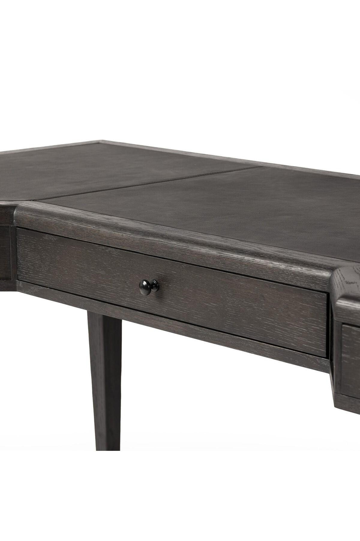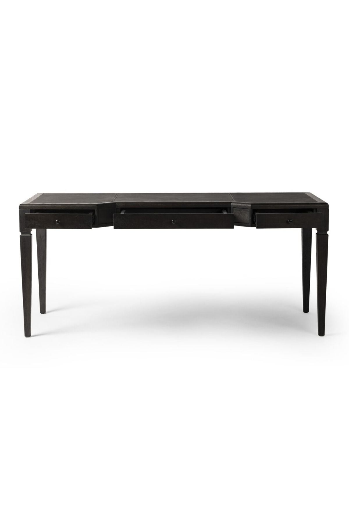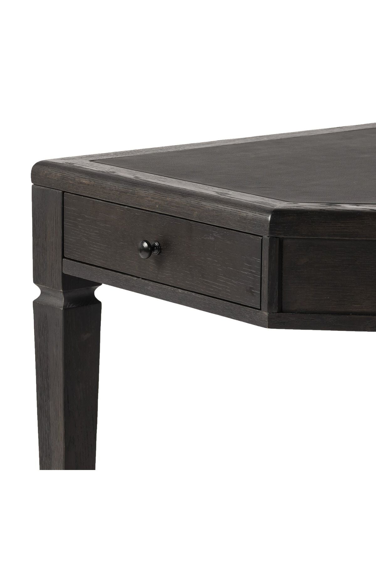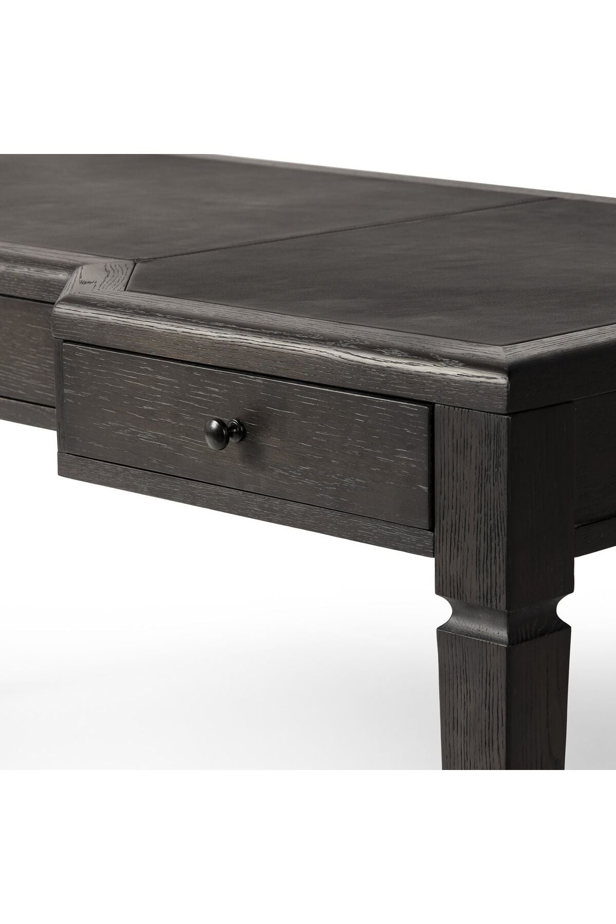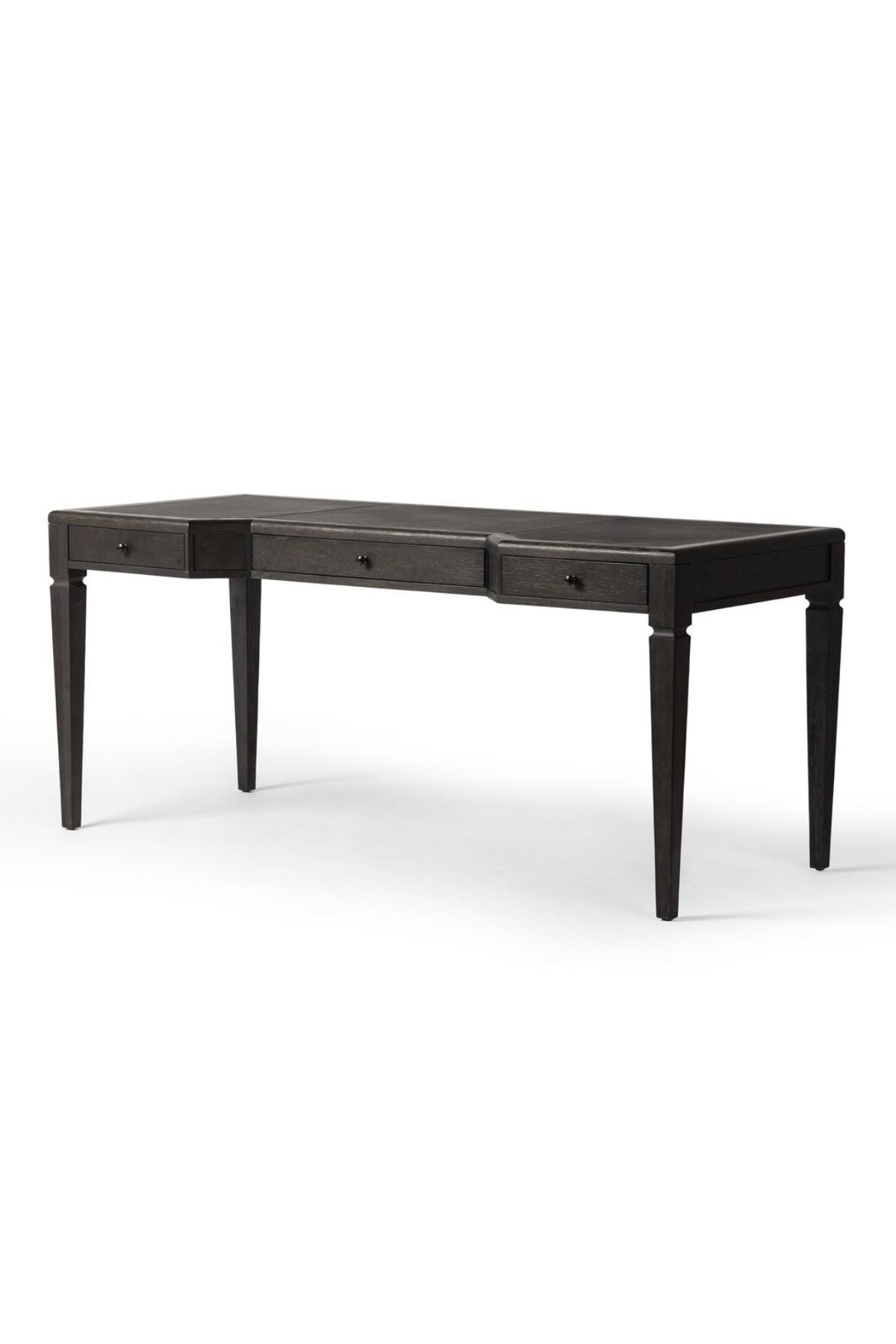 Meet the Claude Desk. This refreshed directoire-style desk pairs a 100% top-grain leather inset top with a unique reverse breakfront and recessed center drawer. Finished in distressed black oak, it offers the workspace a classic yet updated feel.
