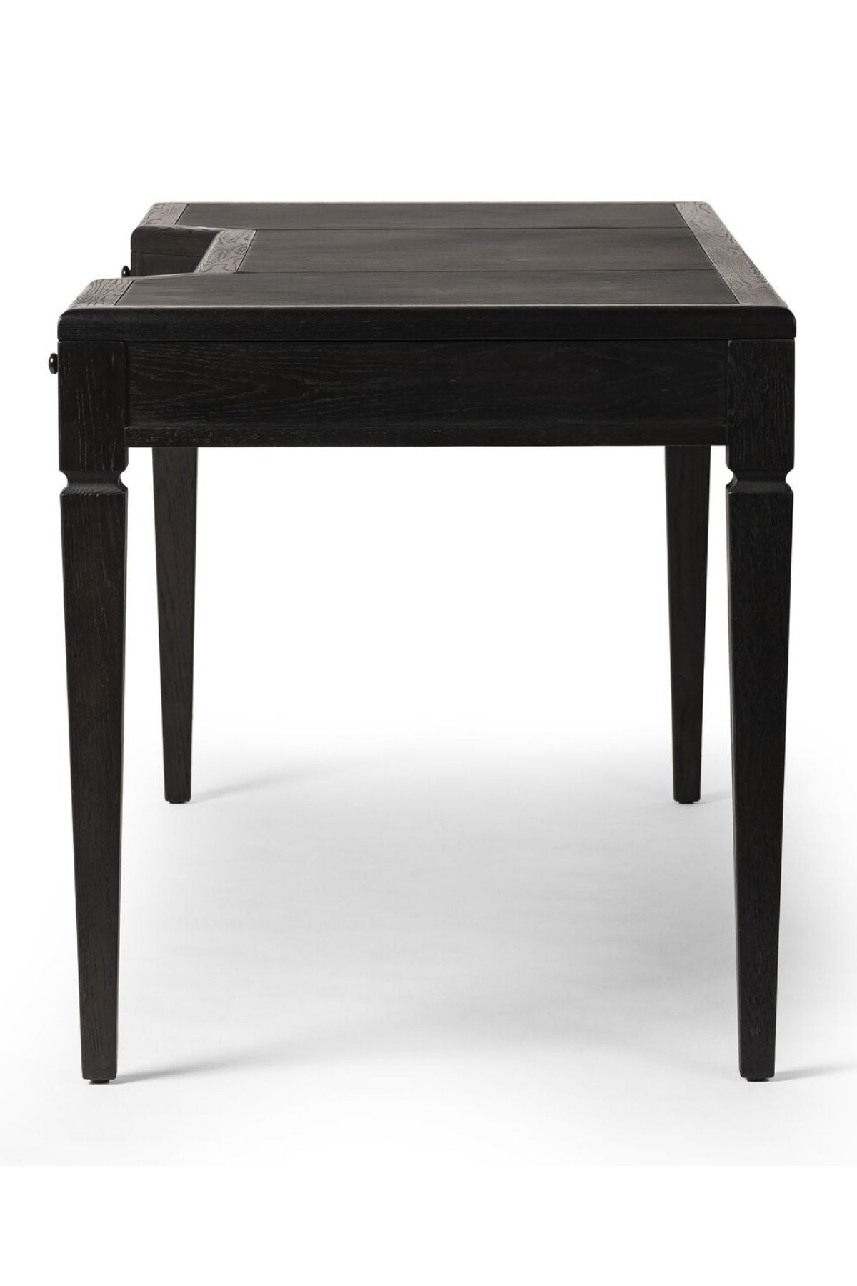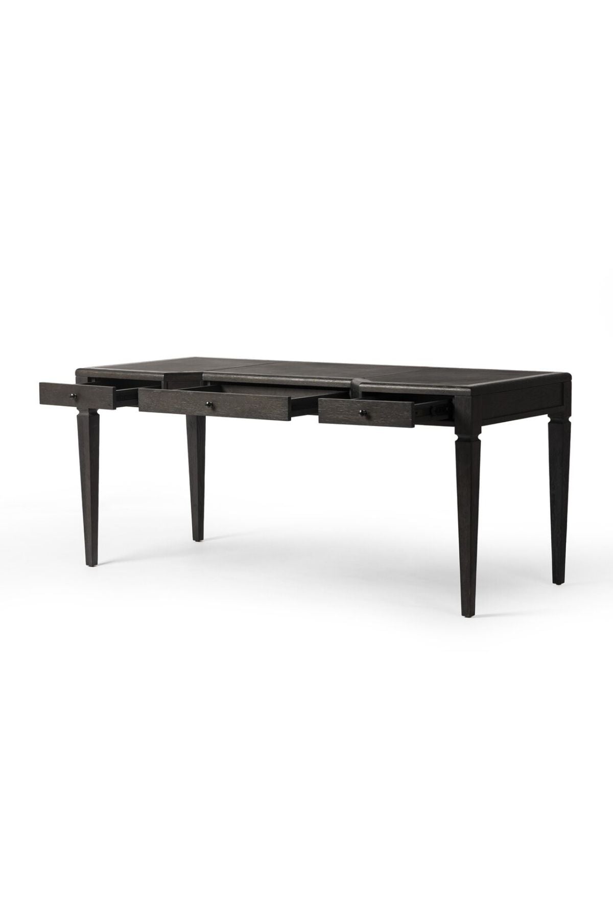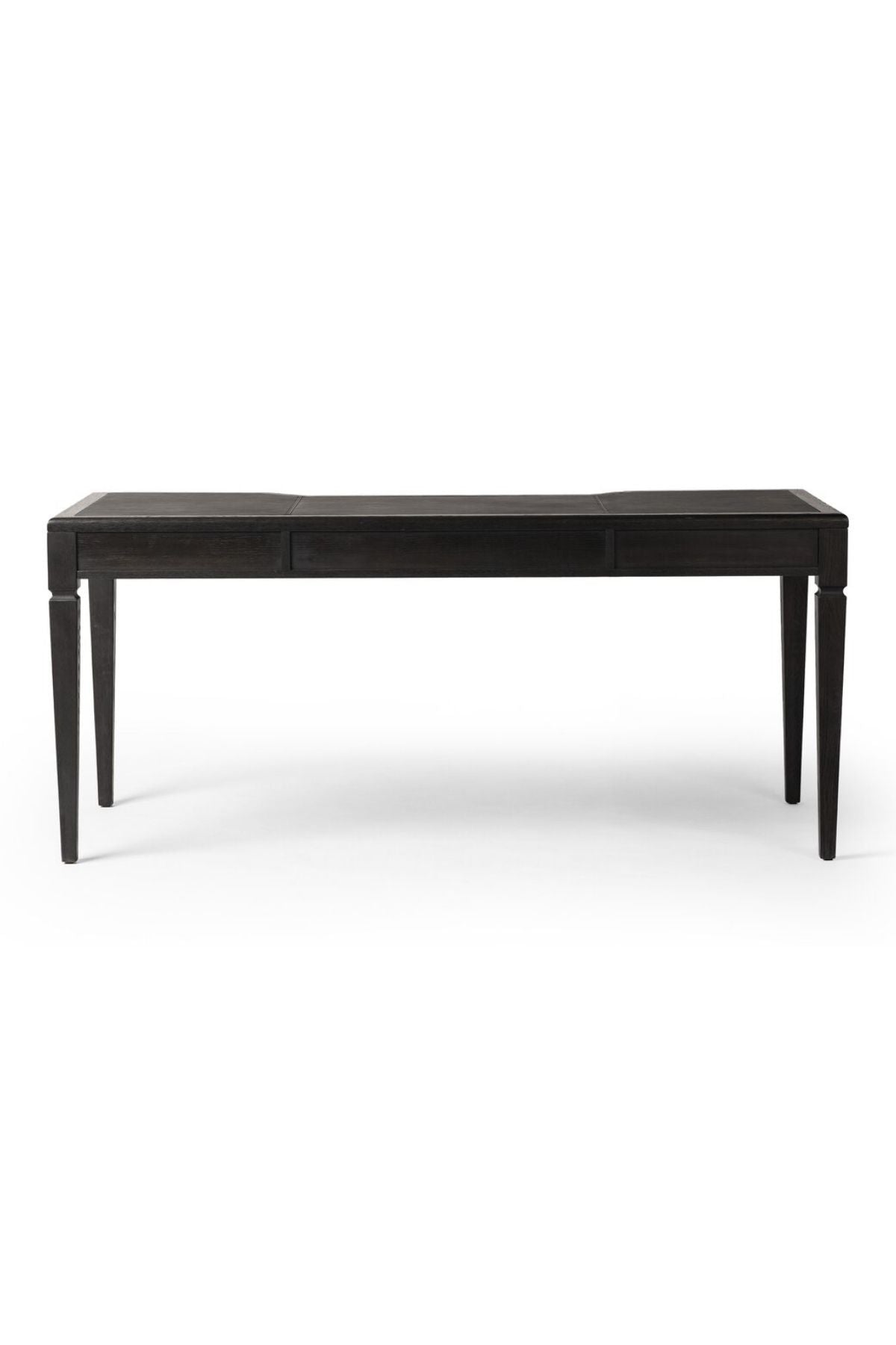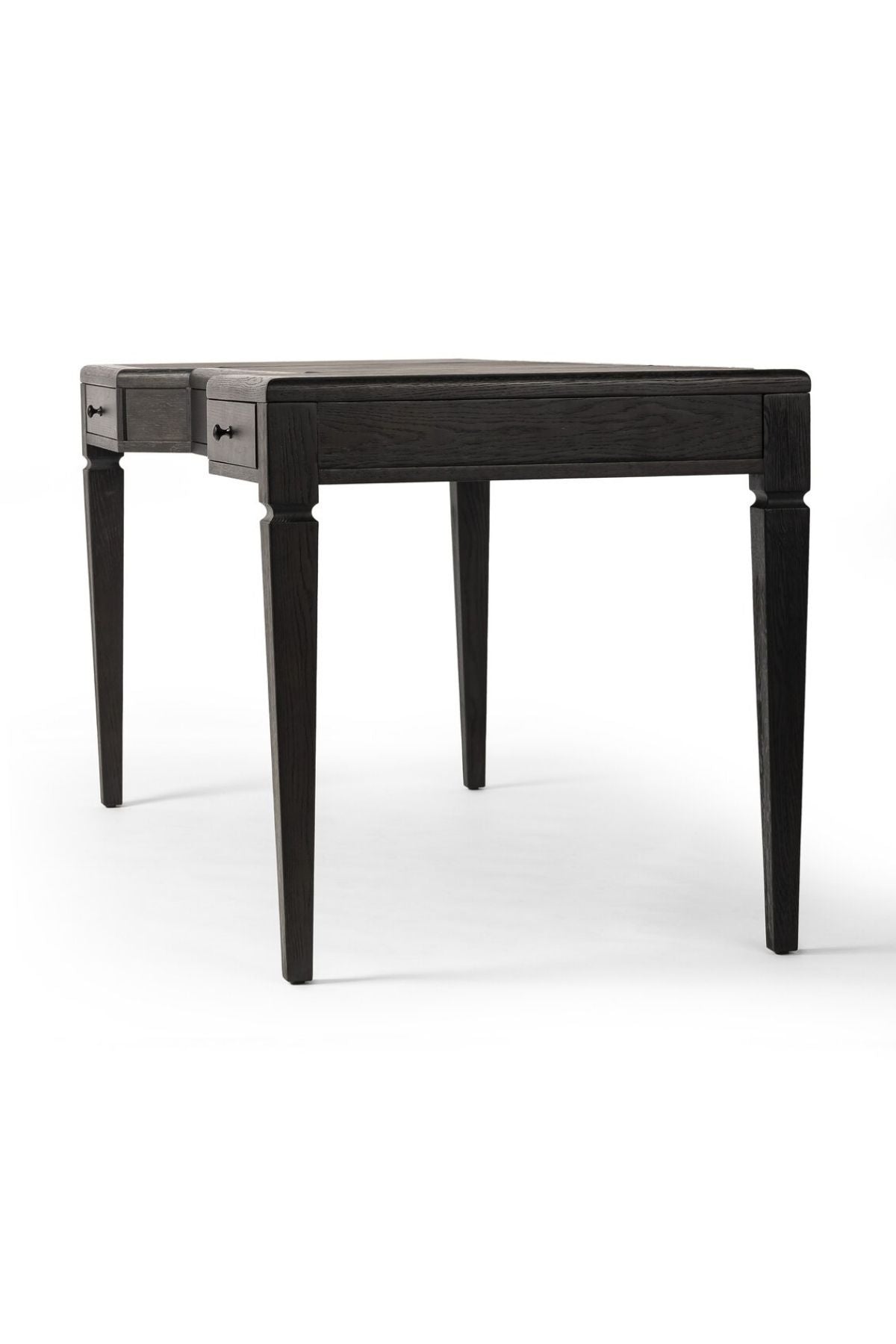 Meet the Claude Desk. This refreshed directoire-style desk pairs a 100% top-grain leather inset top with a unique reverse breakfront and recessed center drawer. Finished in distressed black oak, it offers the workspace a classic yet updated feel.