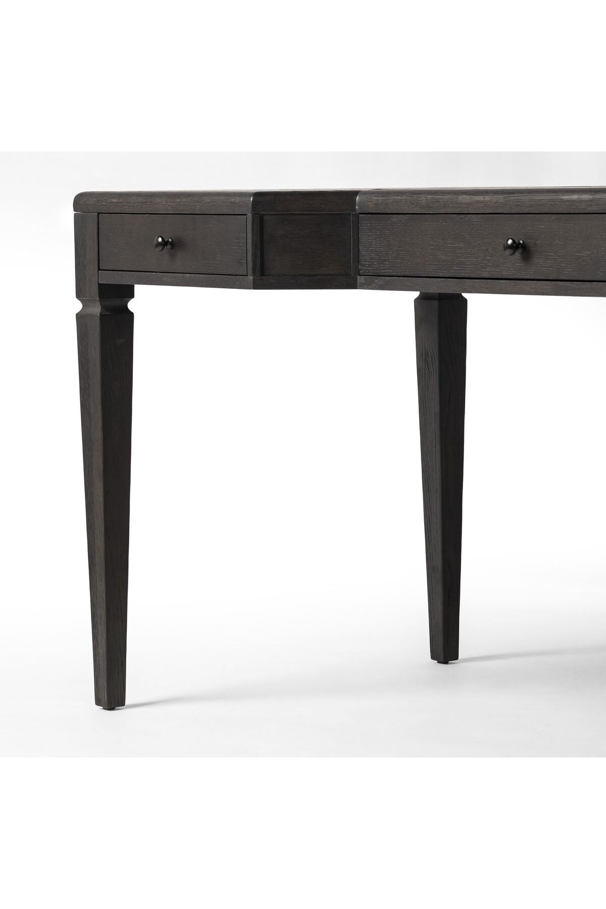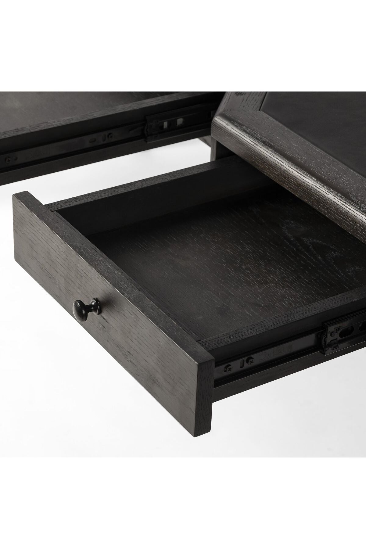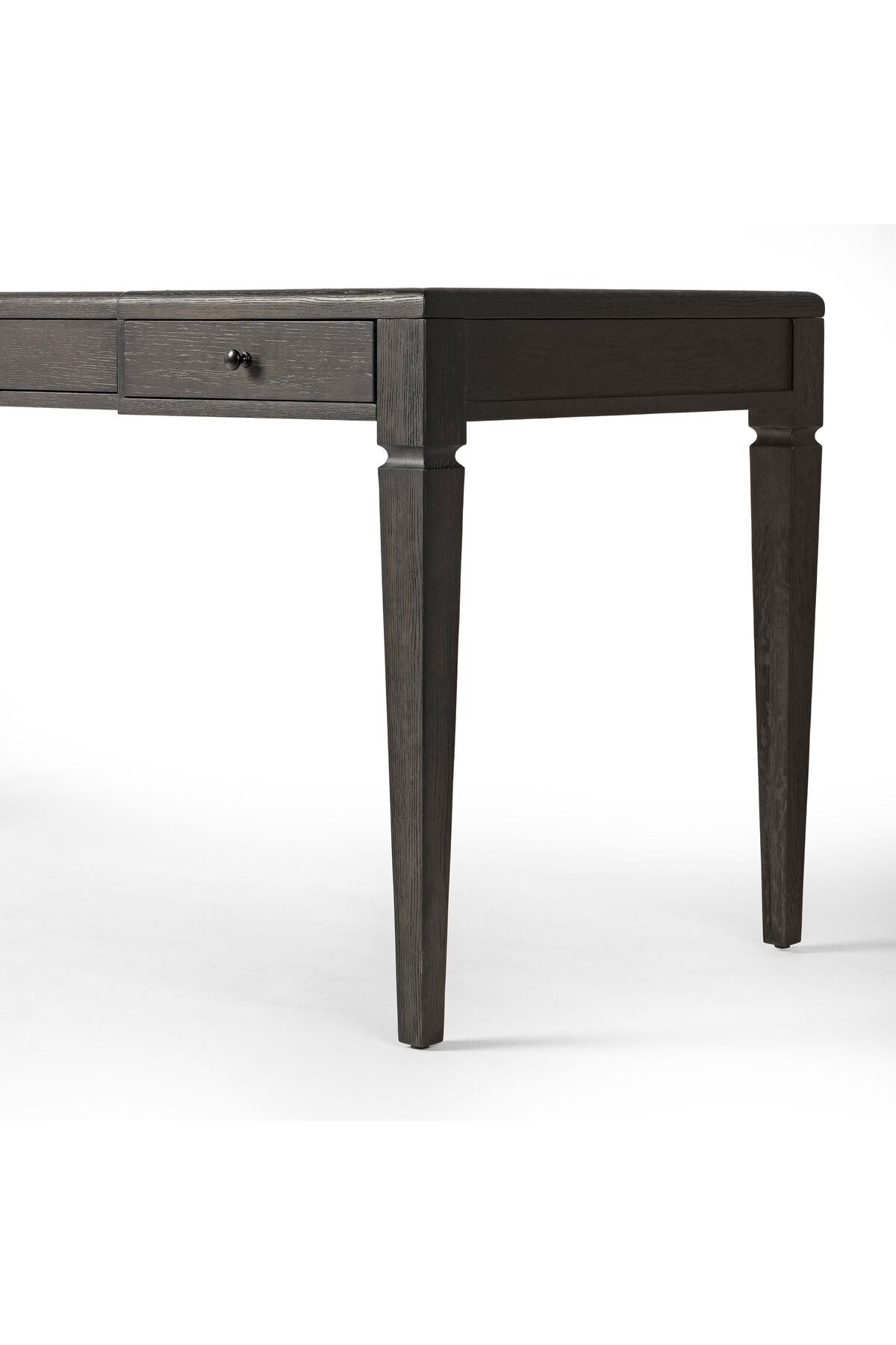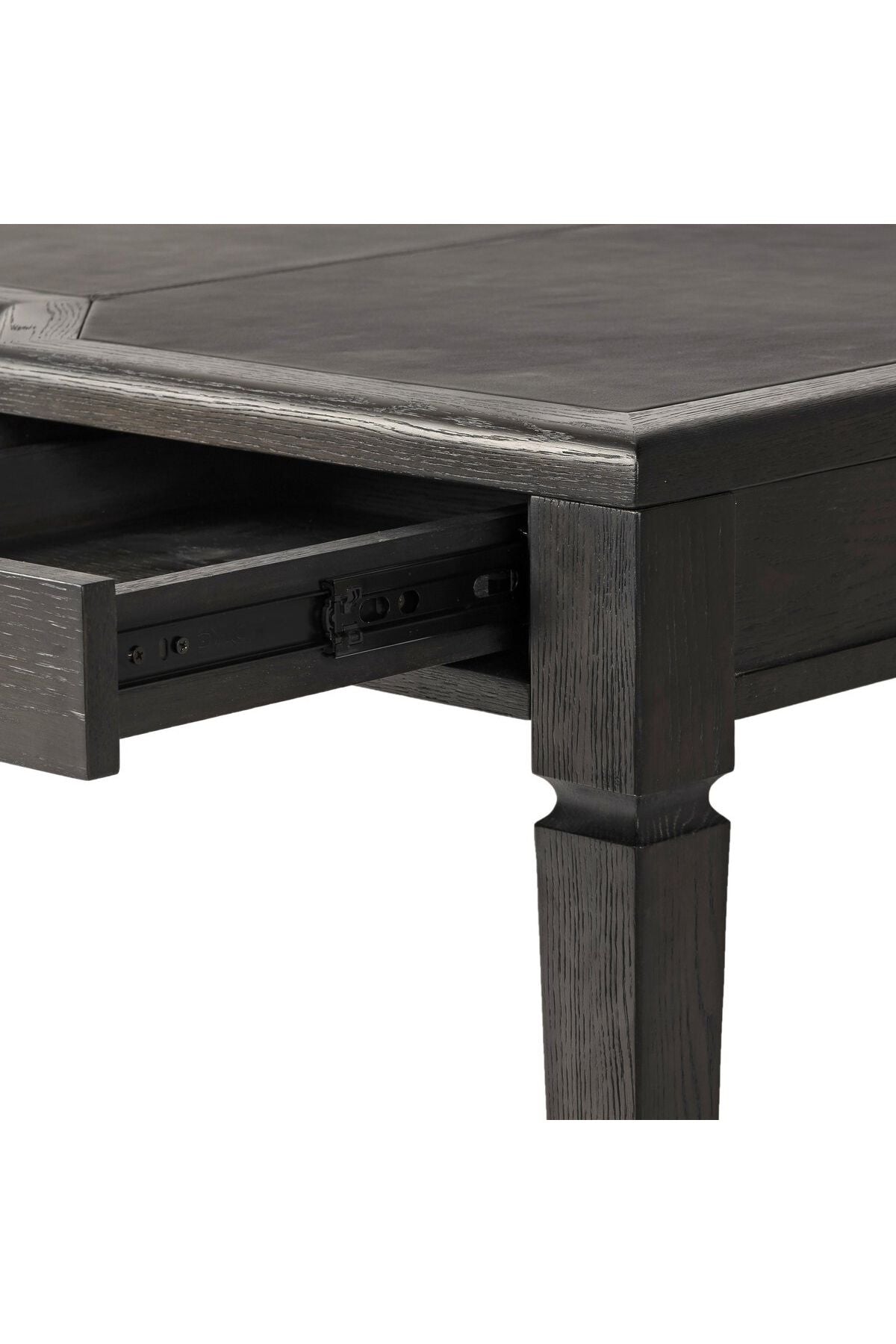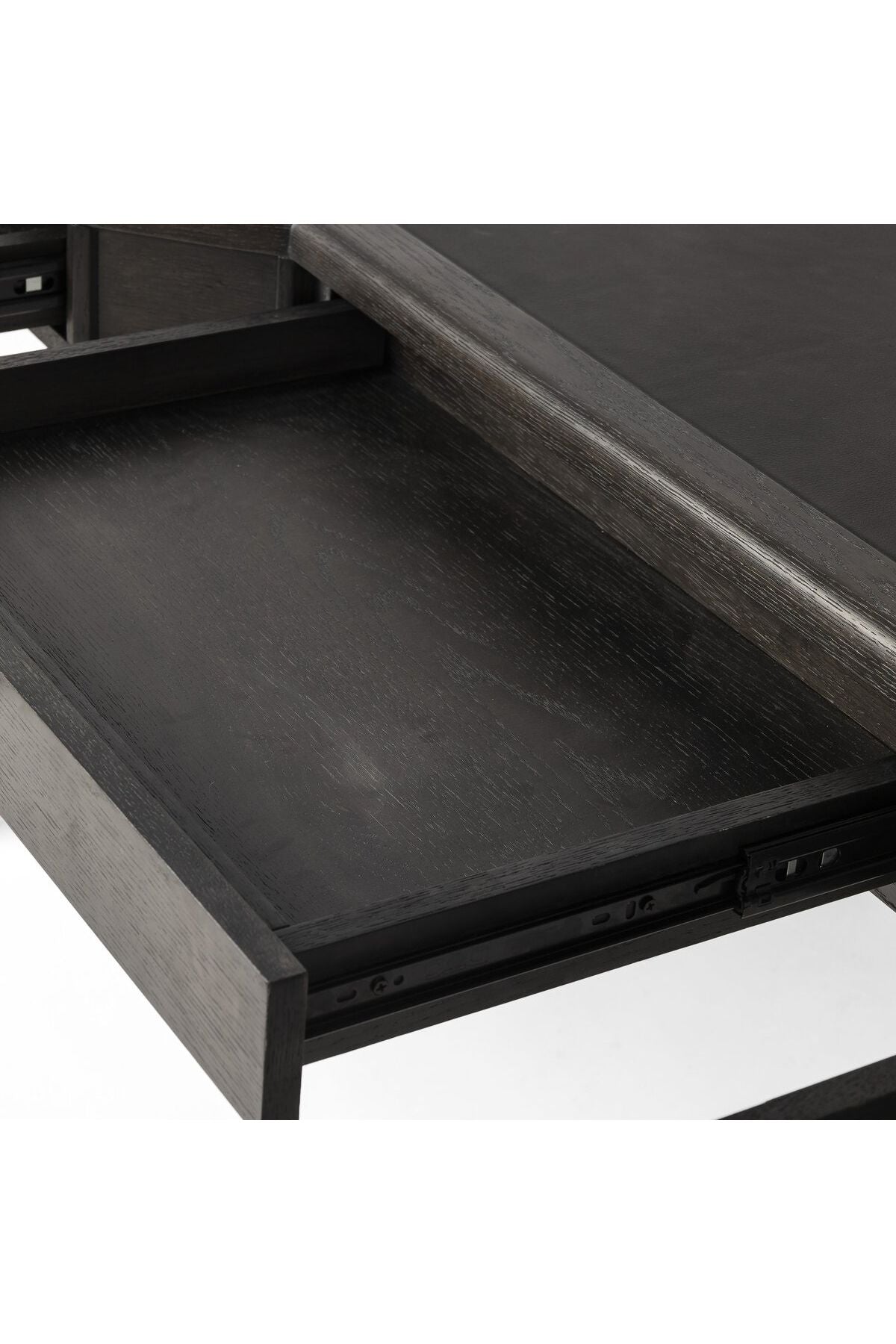 Meet the Claude Desk. This refreshed directoire-style desk pairs a 100% top-grain leather inset top with a unique reverse breakfront and recessed center drawer. Finished in distressed black oak, it offers the workspace a classic yet updated feel.