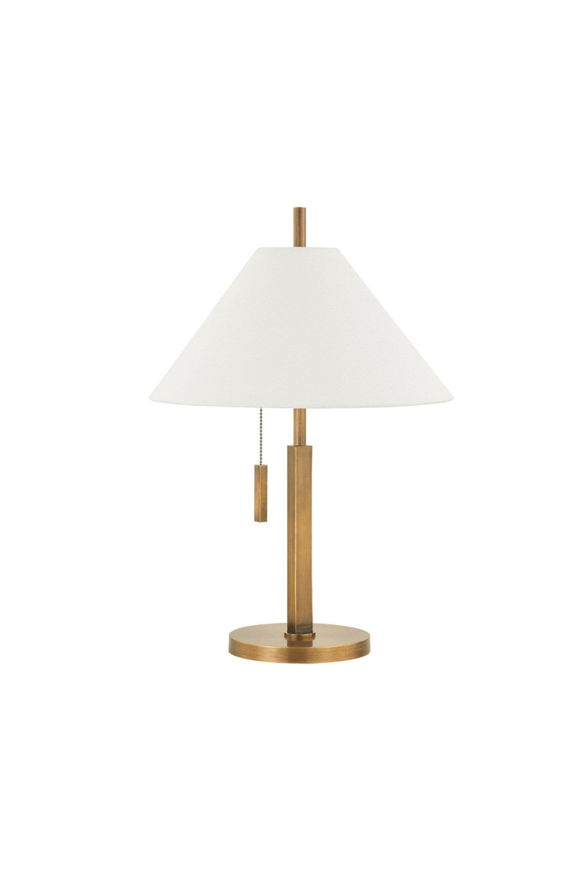 The Clic Lamp is classic and tailored. An extruded square body set atop a circular base extends into a slim pole that pierces through a tapered, off-white linen shade to create a layering of simple geometry. The pull chain adds a stylish and functional detail, while the all-over Patina Brass finish contributes to the sophistication. Bulb(s) not included.